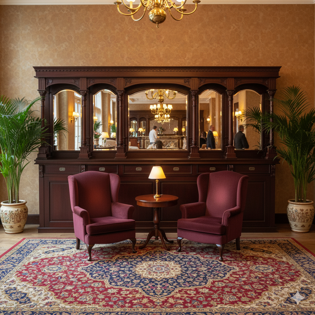 Das Rückwandbuffet der englischen Bar aus massiv Mahagoni präsentiert sich mit aufwendigen Schnitzereien, Ornamenten und Spiegeln.