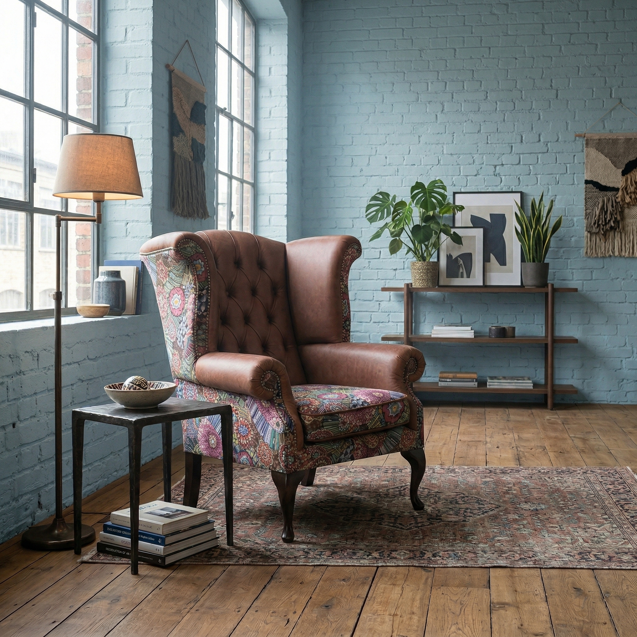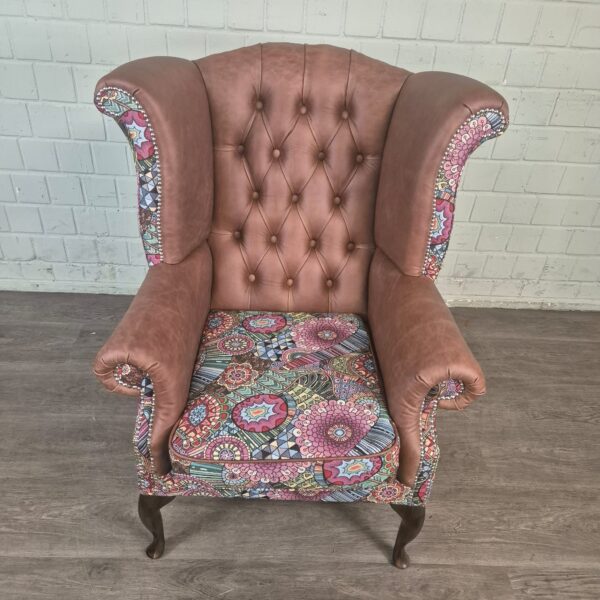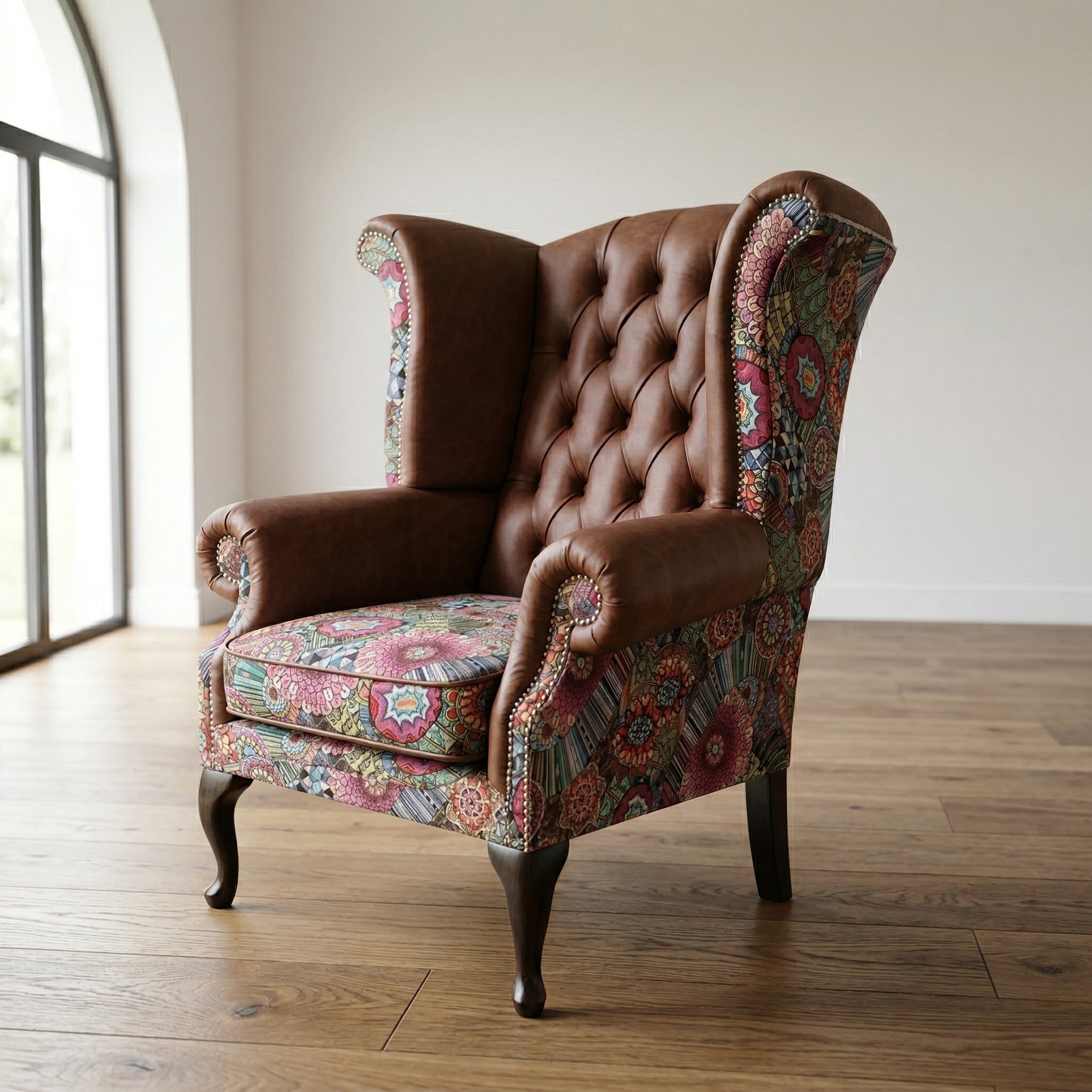 - Blumiger Blickfang: Sitzfläche und die Außenseiten der Ohrenbacken sind mit einem farbenfrohen Stoff bezogen, der ein wunderschönes Blumenmuster in lebendigen Tönen präsentiert. Dieses einzigartige Detail sorgt für einen fröhlichen und individuellen Kontrast zum klassischen Leder.
