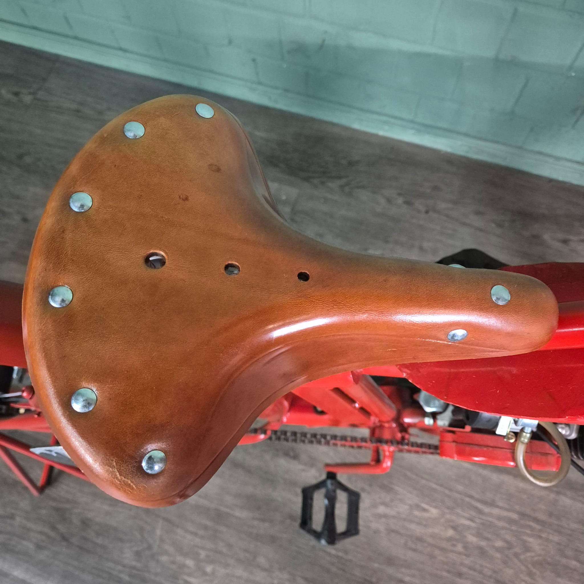 Edle Optik: Der braune Ledersattel und die sorgfältig gearbeiteten Komponenten verleihen dem Stück eine hochwertige, museale Ästhetik.