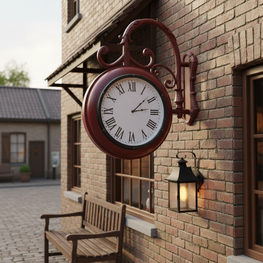 Stilvolle Bahnhofsuhr aus Aluminium mit doppelseitigem Ziffernblatt. Batteriebetrieben.