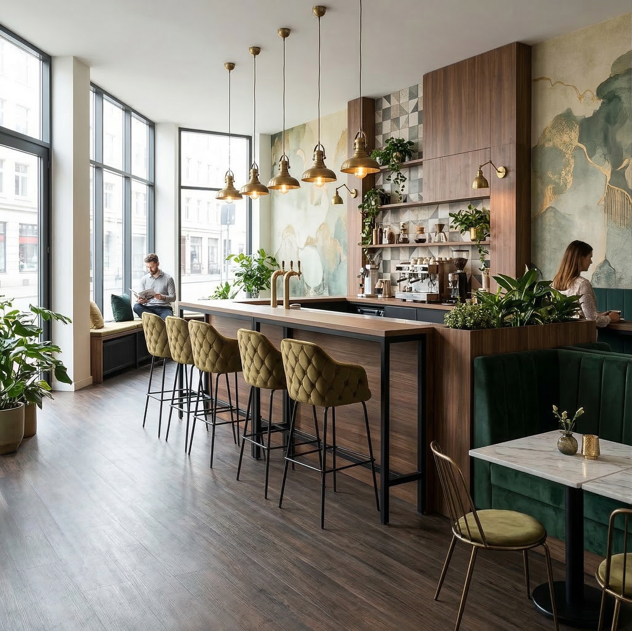 Diese Barhocker bieten eine perfekte Kombination aus optischer Eleganz und qualitativ hochwertiger Verarbeitung. Die ergonomisch geformten Lehnen passt sich dem Rücken an und ermöglichen ein bequemes Sitzen. Auch sind die Barhocker mit Fußstützen an den Stuhlbeinen ausgestattet. Die Sitzflächen sowie Rückenlehnen wurden mit Velourstoff bezogen, die Gestelle wurde aus Metall hergestellt. Stückpreis.