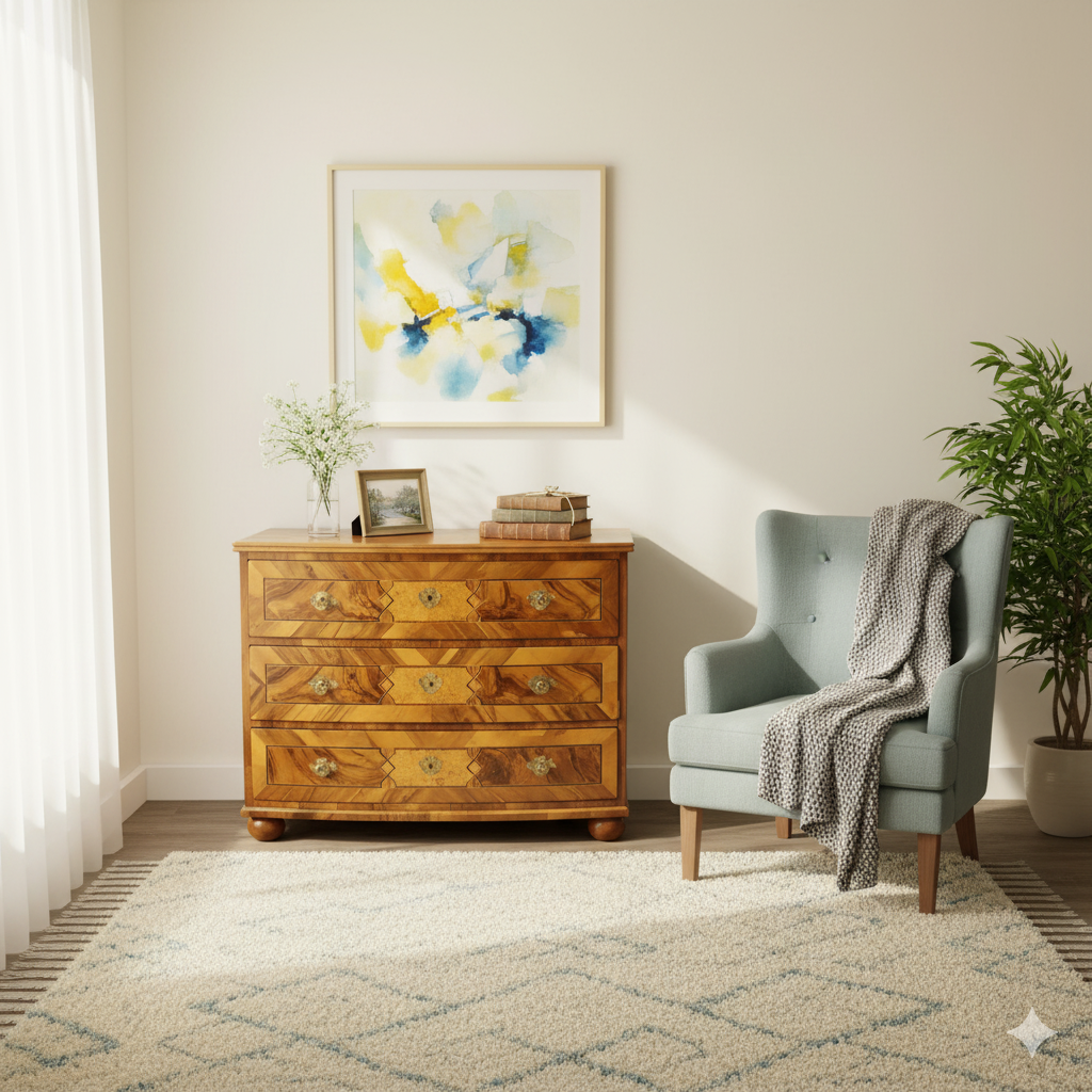 Restaurierte Barock Kommode in Nussbaum und Eiche furniert und gewachst von ca. 1770. Die Kommode befindet sich in einem sehr guten Zustand und weist nur minimale Gebrauchsspuren auf.