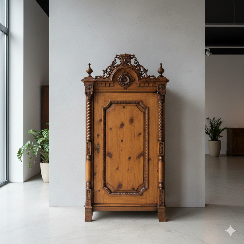 671,43€ Exkl. MwSt.Restaurierter Gründerzeit Kleiderschrank hergestellt aus massiv Kiefer (Nussbaum gebeizt) von ca. 1880. Der Schrank befindet sich in sehr einem guten Zustand und weist nur minimale Gebrauchsspuren auf.