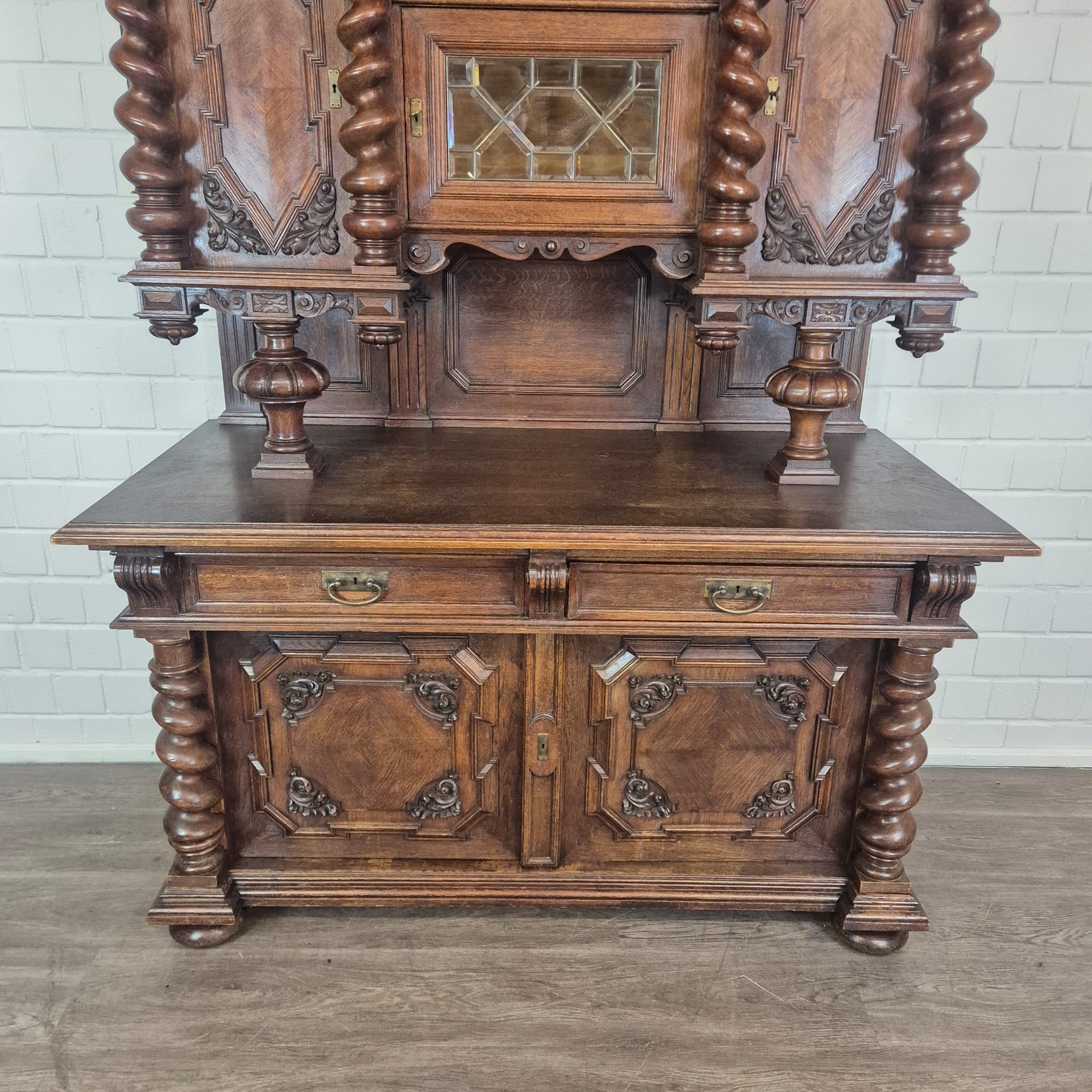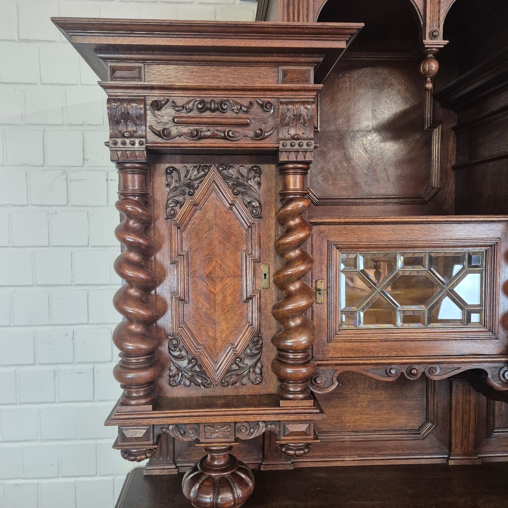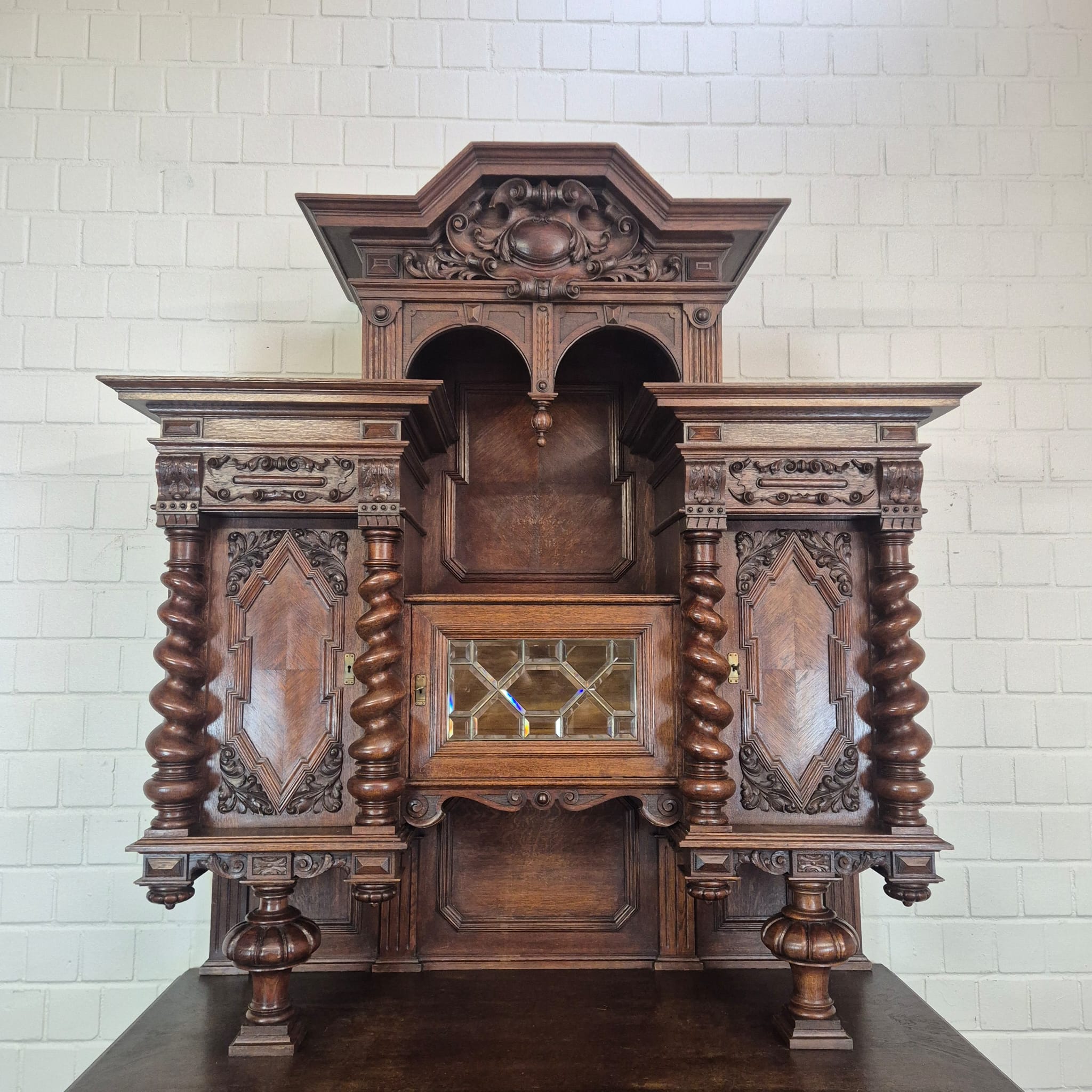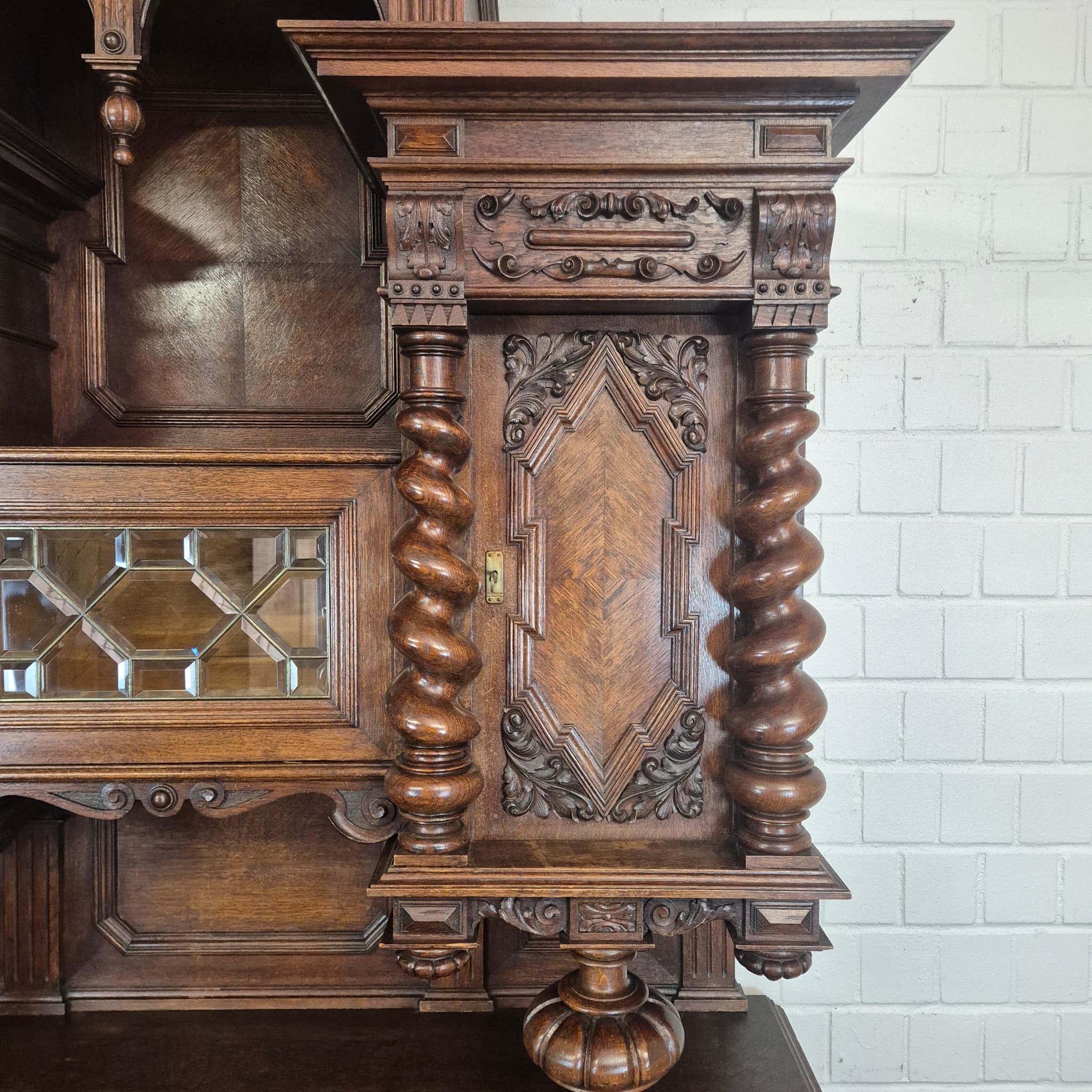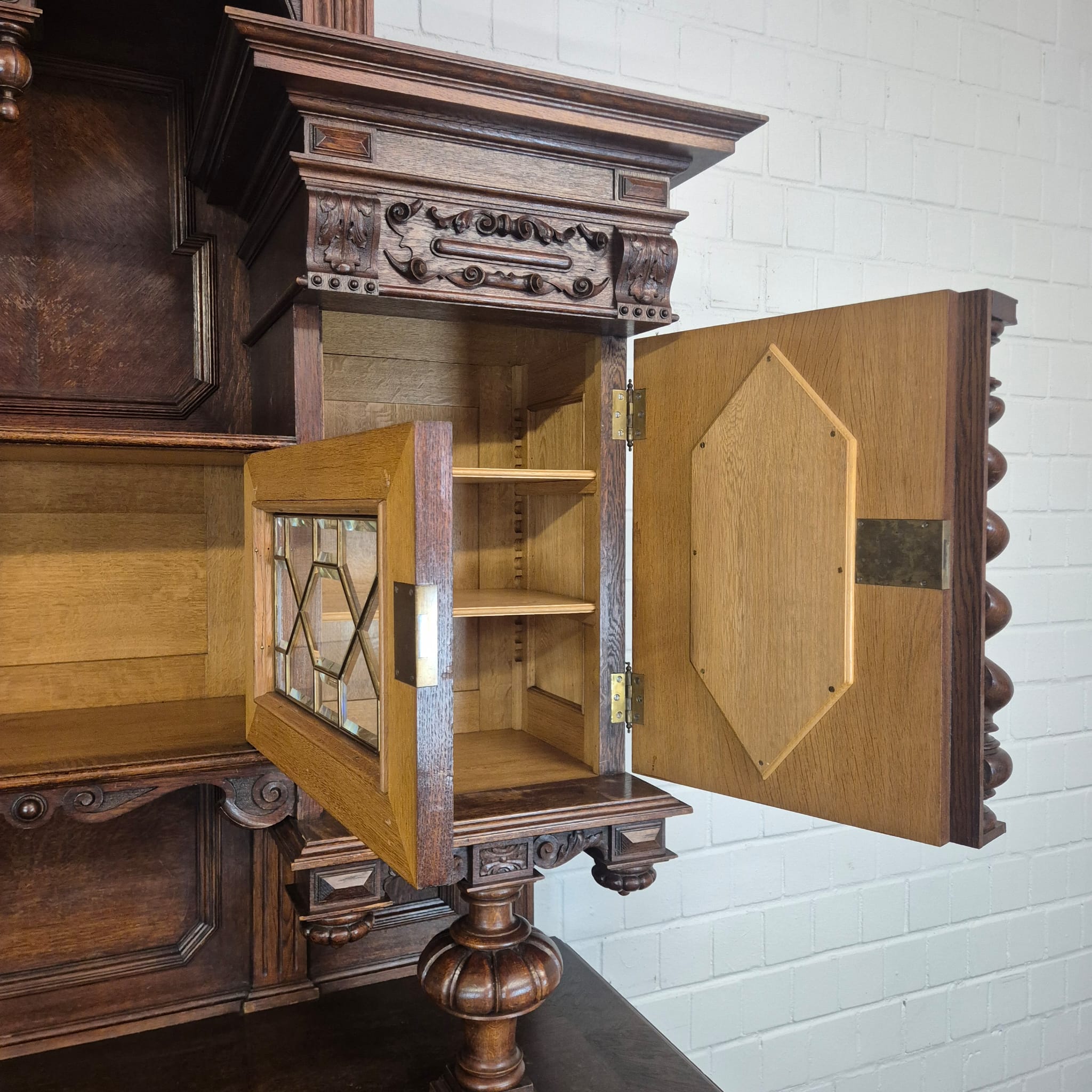 Restaurierter Historismus Buffetschrank aus massiv Eiche (gewachst) von ca. 1860. Der mit Messingverglasung versehene Schrank befindet sich in einem sehr guten Zustand und weist nur minimale Gebrauchsspuren auf. Zerlegbar (3-teilig).