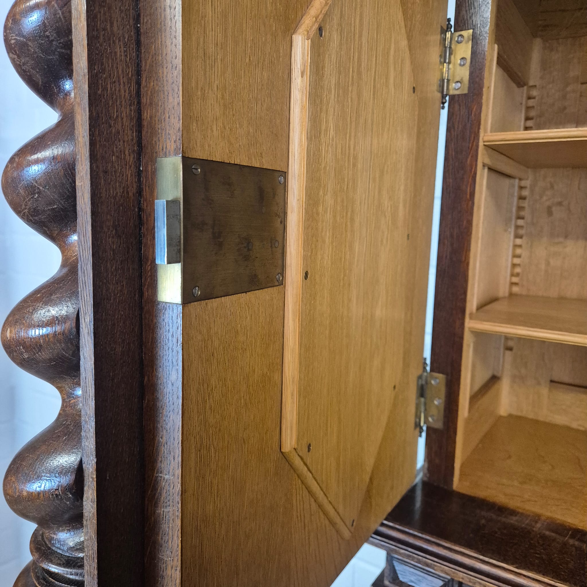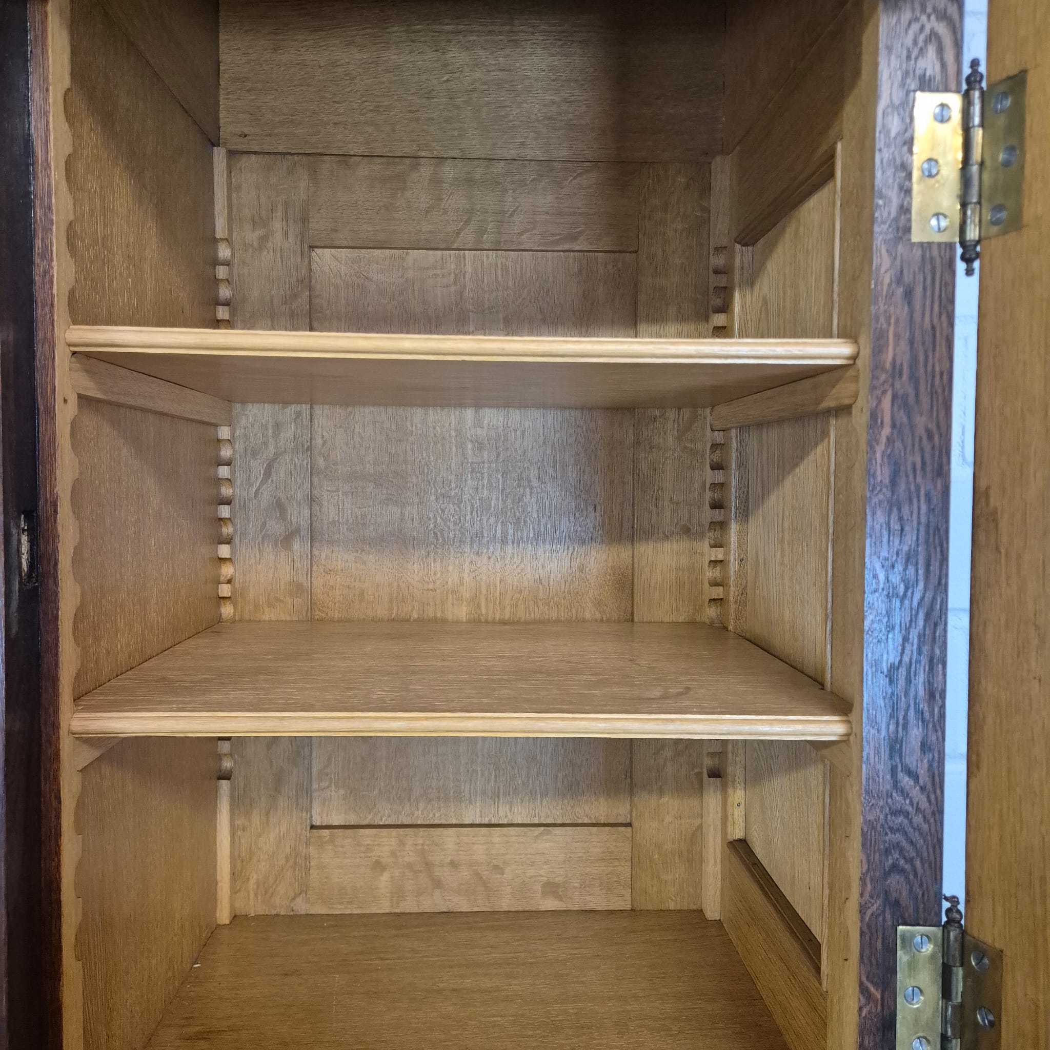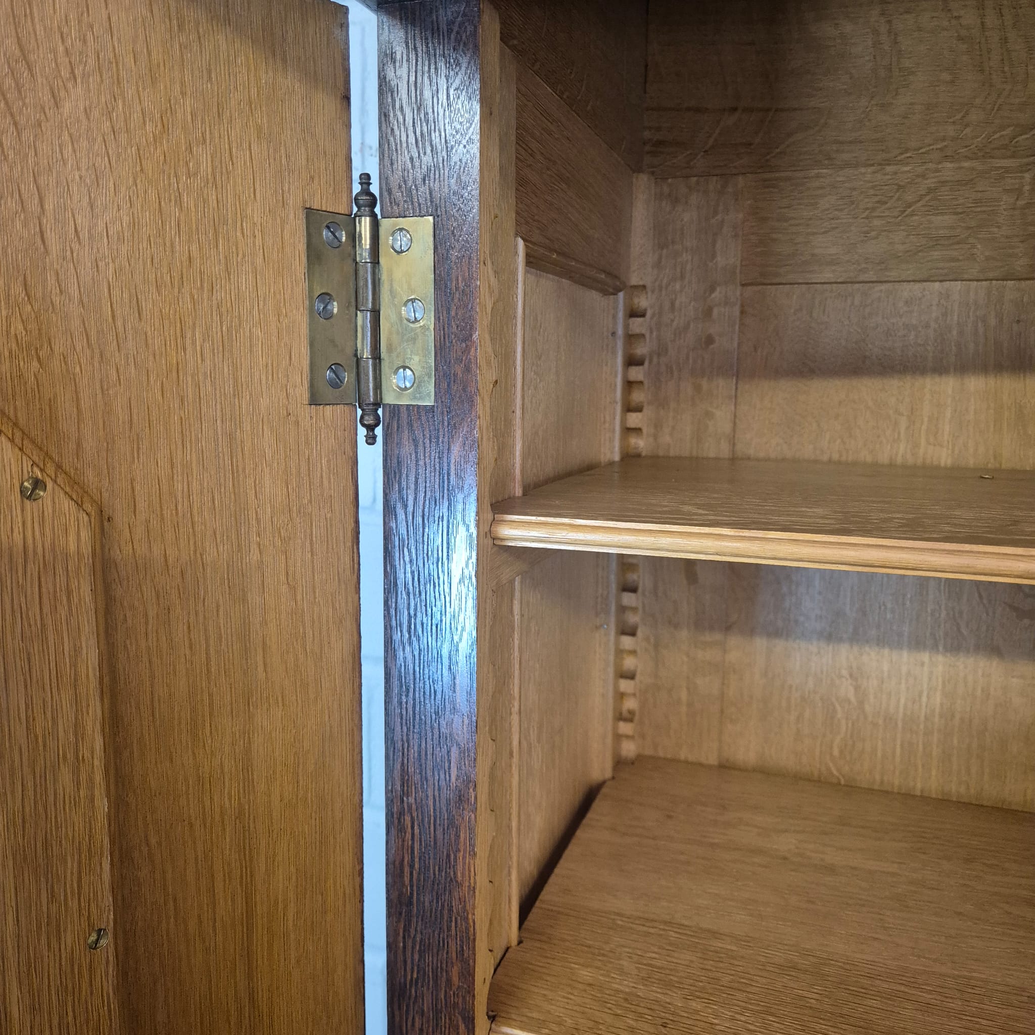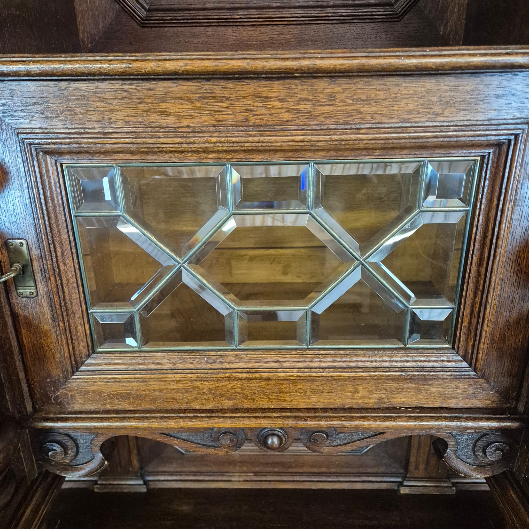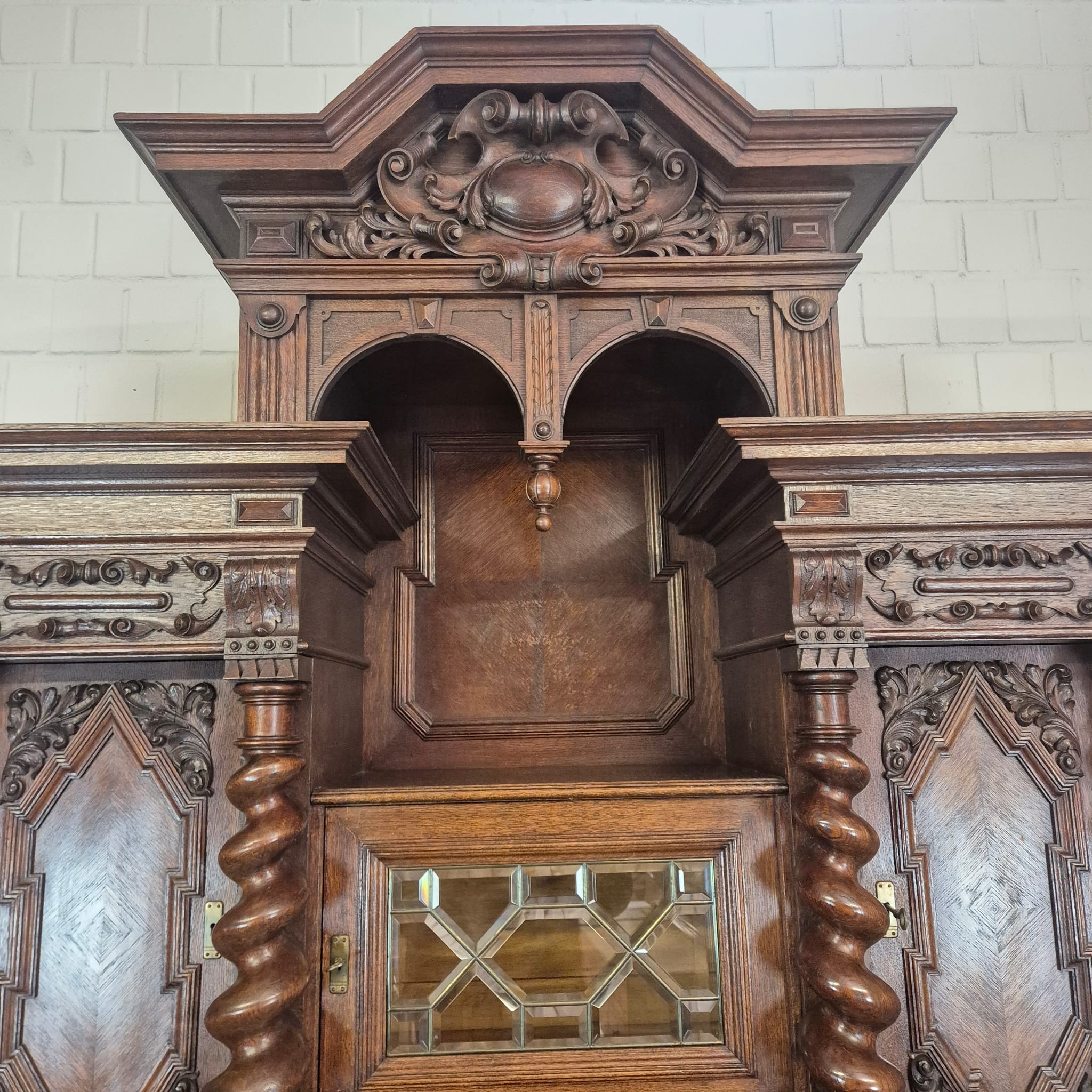 Restaurierter Historismus Buffetschrank aus massiv Eiche (gewachst) von ca. 1860. Der mit Messingverglasung versehene Schrank befindet sich in einem sehr guten Zustand und weist nur minimale Gebrauchsspuren auf. Zerlegbar (3-teilig).