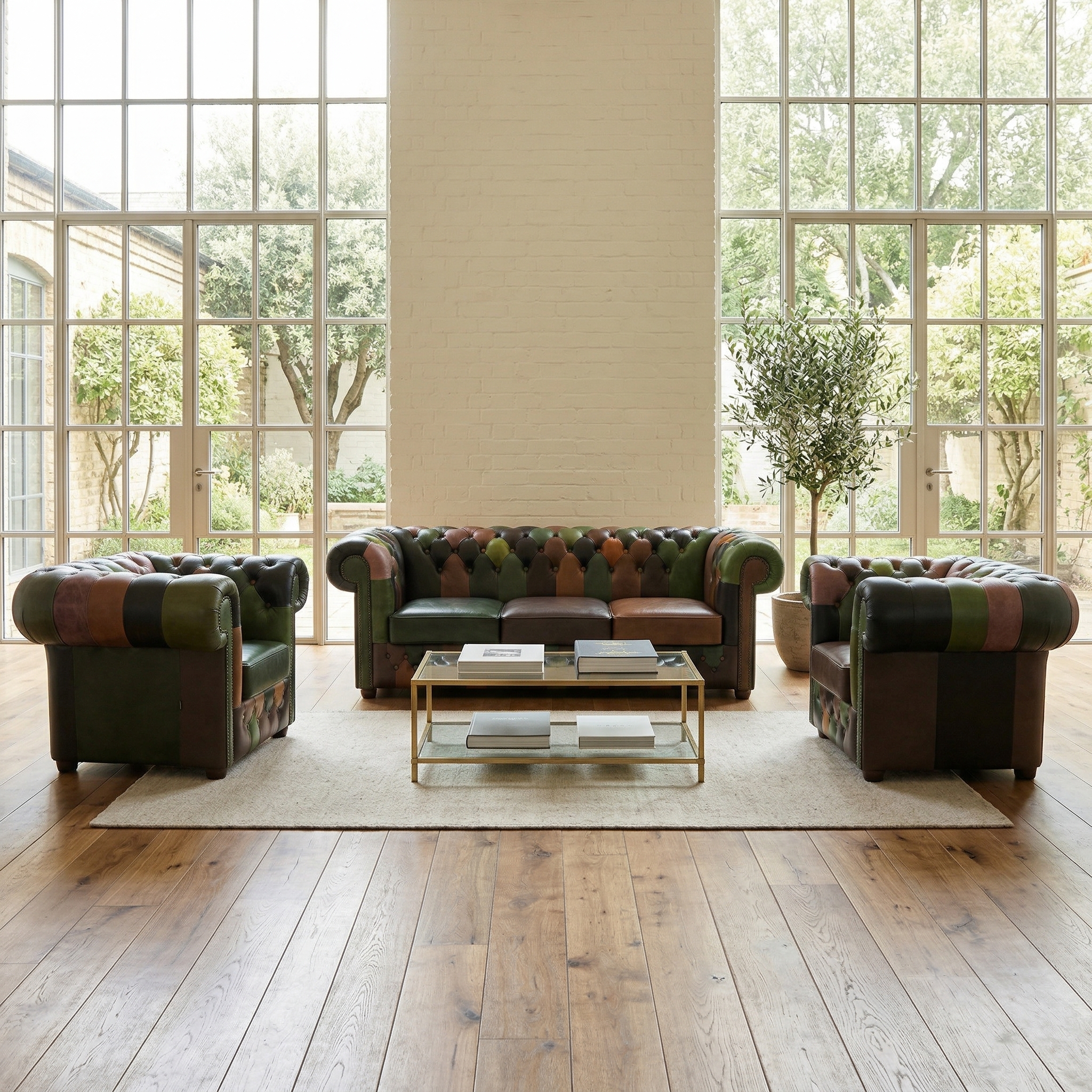 Jedes Möbelstück ist ein Unikat, das aus Lederstücken in verschiedenen Naturtönen wie warmen Brauntönen, tiefem Grün und edlem Schwarz zusammengesetzt ist. Die klassischen Merkmale des Chesterfield-Stils – die elegant gerollten Armlehnen, die charakteristische Rautenheftung und die dekorativen Ziernägel – verleihen dem Set eine zeitlose Eleganz.