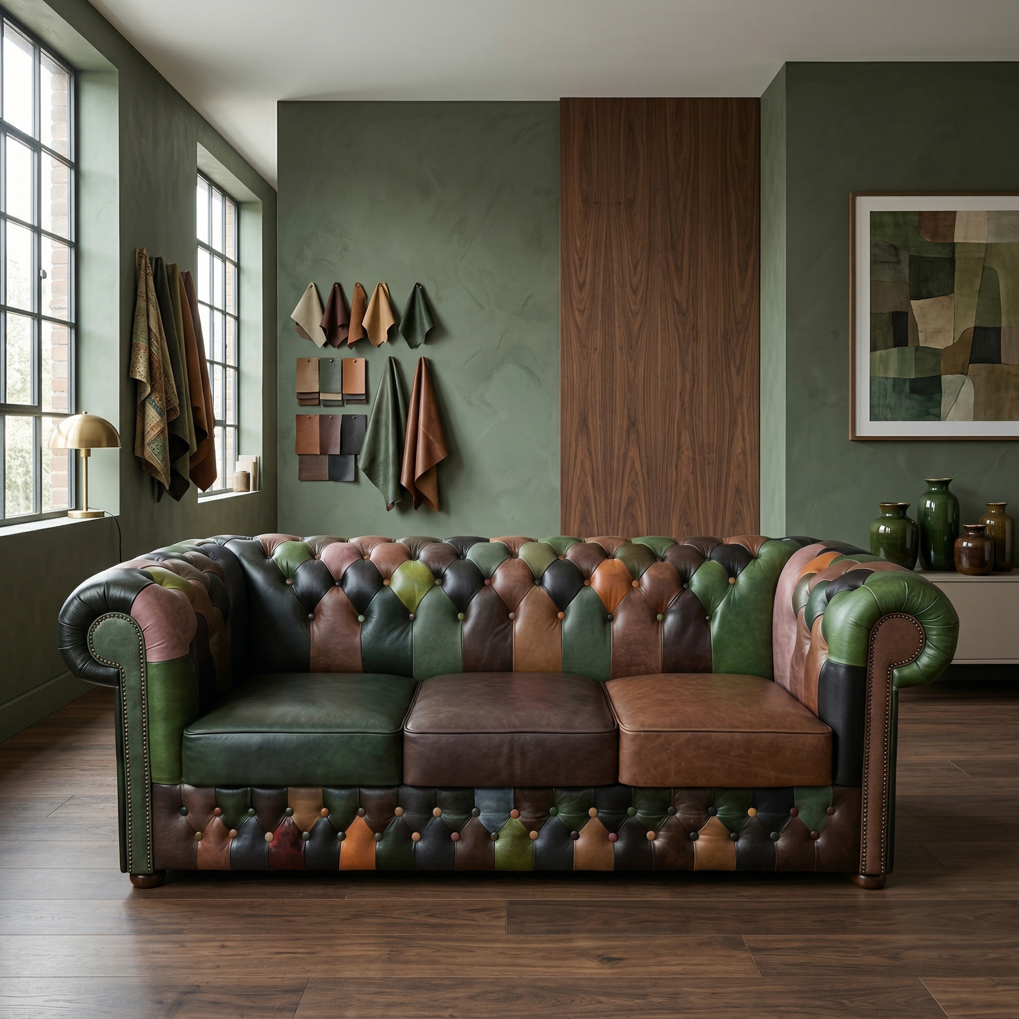Die Kombination aus Lederstücken in verschiedenen warmen Naturtönen wie Grün, Braun, Schwarz und Cognac-Rot verleiht ihm eine lebendige und doch harmonische Ausstrahlung. Typische Chesterfield-Merkmale wie die eleganten, gerollten Armlehnen und die klassische Rautenheftung mit tief gesetzten Knöpfen sind hier stilvoll umgesetzt.