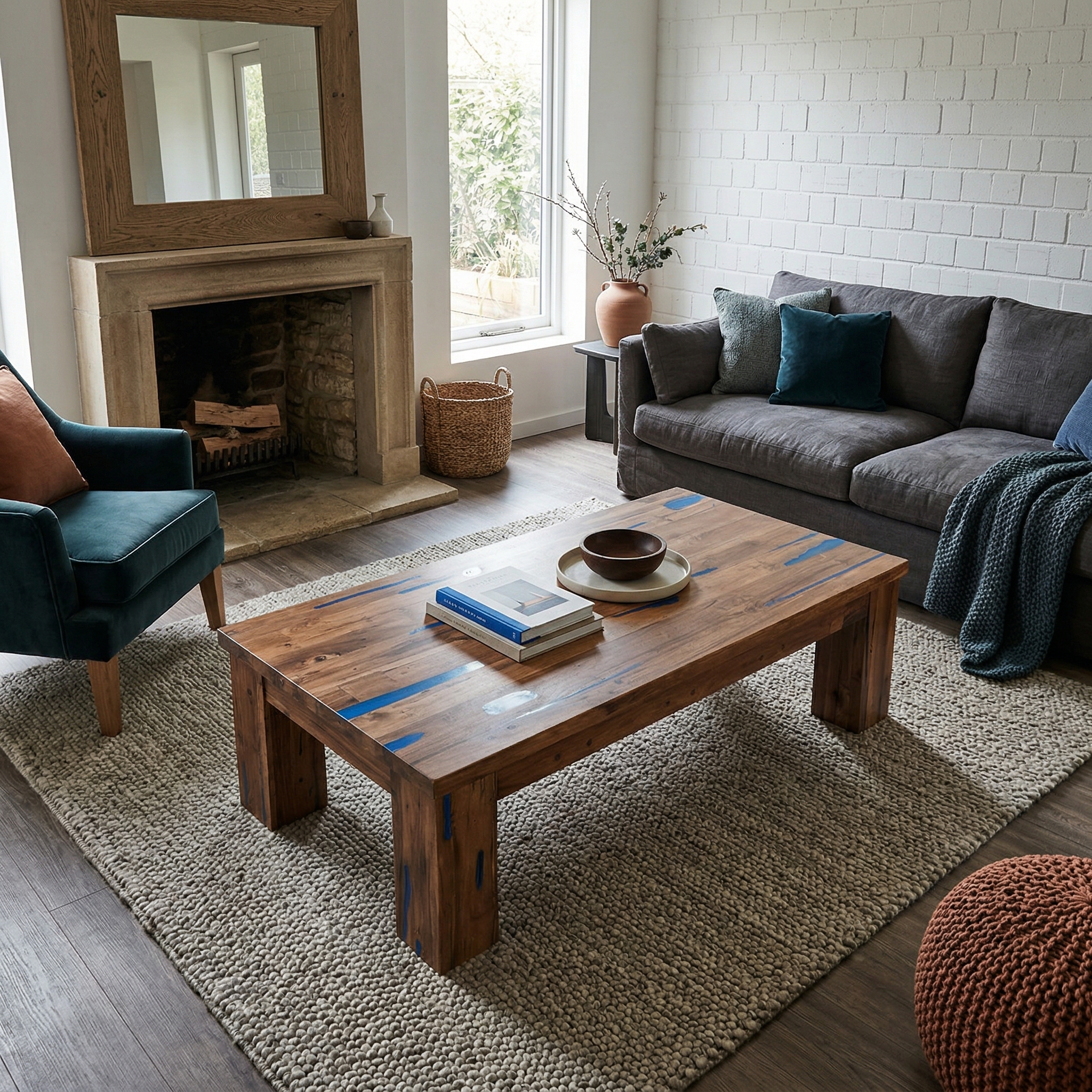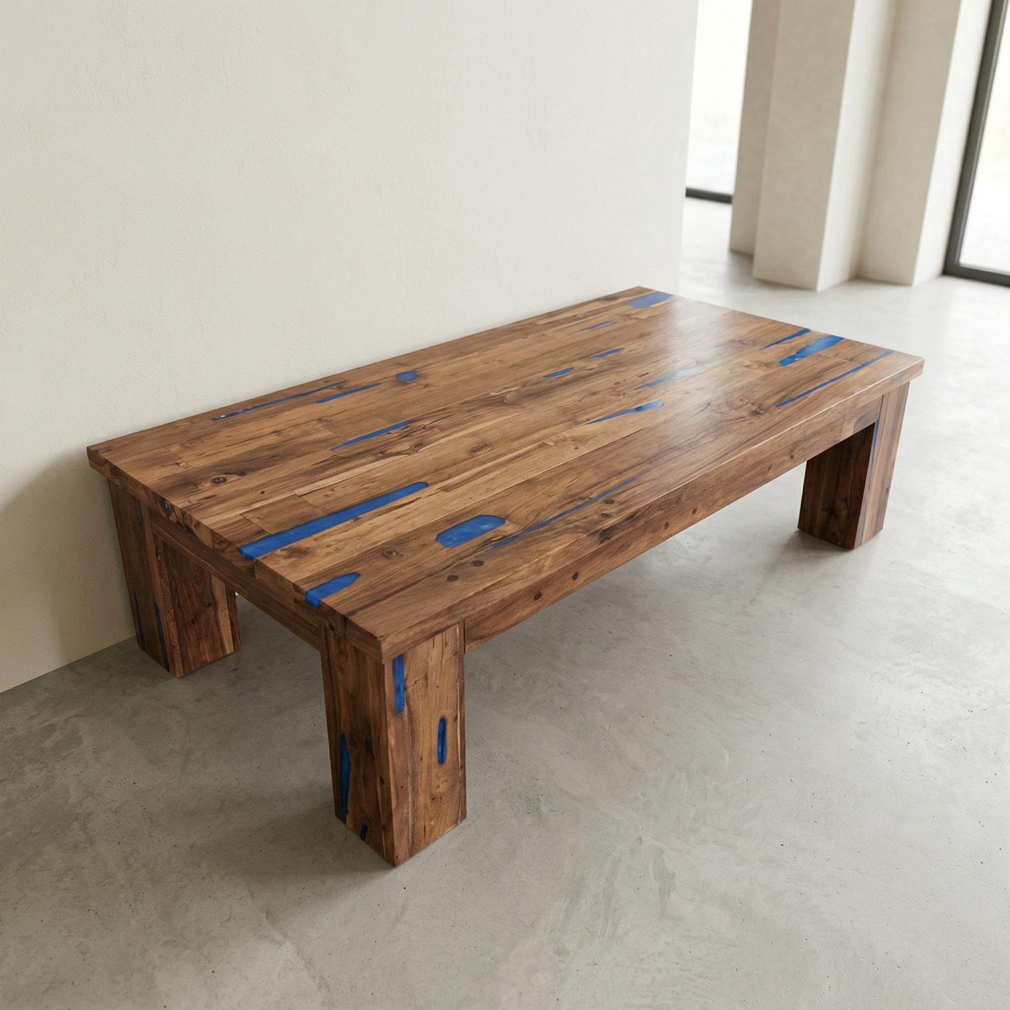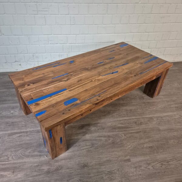 629,41€ Exkl. MwSt.Dieser einzigartig gestaltete Couchtisch aus massiv Teakholz (recycelt) und Epoxidharz (blau) erhält seine besondere Wirkung durch natürliche Unregelmäßigkeiten im Holz. Diese entstehen durch das verwendete Edelholz mit seinen verschiedenen Farben und Strukturen, welche diesem Stück einen eigentümlichen Charakter verleihen und es zu einem Unikat machen. Maserung und Farbton des Holzes tragen sehr zum optischen Wert dieses Möbels bei, das sich in seiner schlichten Eleganz vielen Modetrends anpasst.