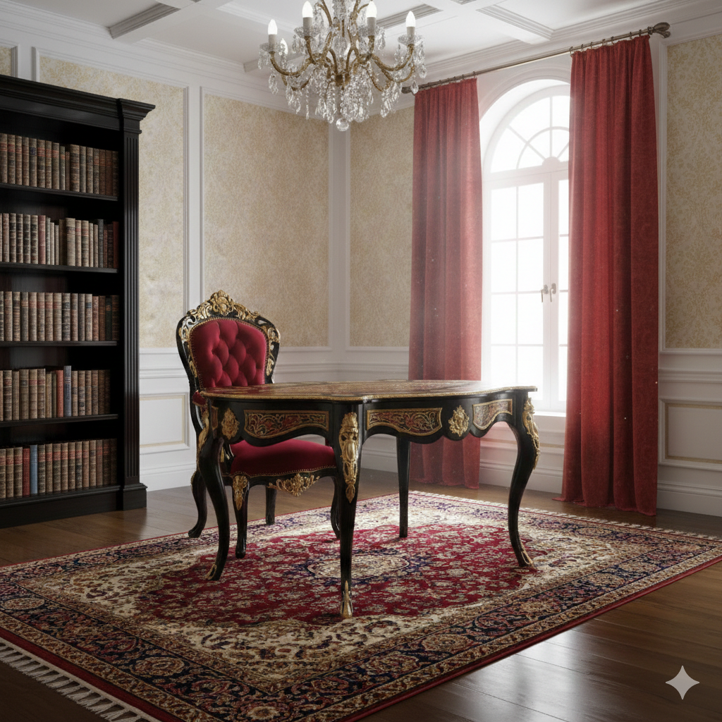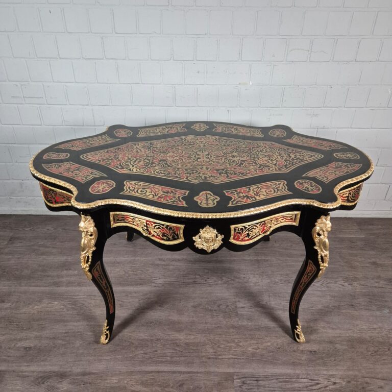 Schwarzer eleganter Boulle Damenschreibtisch im Barockstil. Florale Metallbeschläge unterstützen optisch die mit Intarsien aus Messing versehene Tischplatte. Ausstellungsstück zum Sonderpreis.