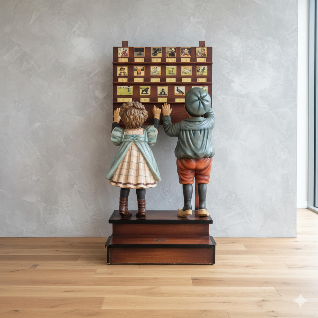 Die Dekoration zeigt zwei Kinderfiguren, die typisch für die Illustrationen von "Ot en Sien" gestaltet sind. Sie stehen vor einer Wandtafel mit kleinen Bildern, die die fröhliche und lehrreiche Welt der Kinderbücher widerspiegeln. Die Figuren sind detailreich gearbeitet und liebevoll bemalt, was ihren besonderen Charme ausmacht.