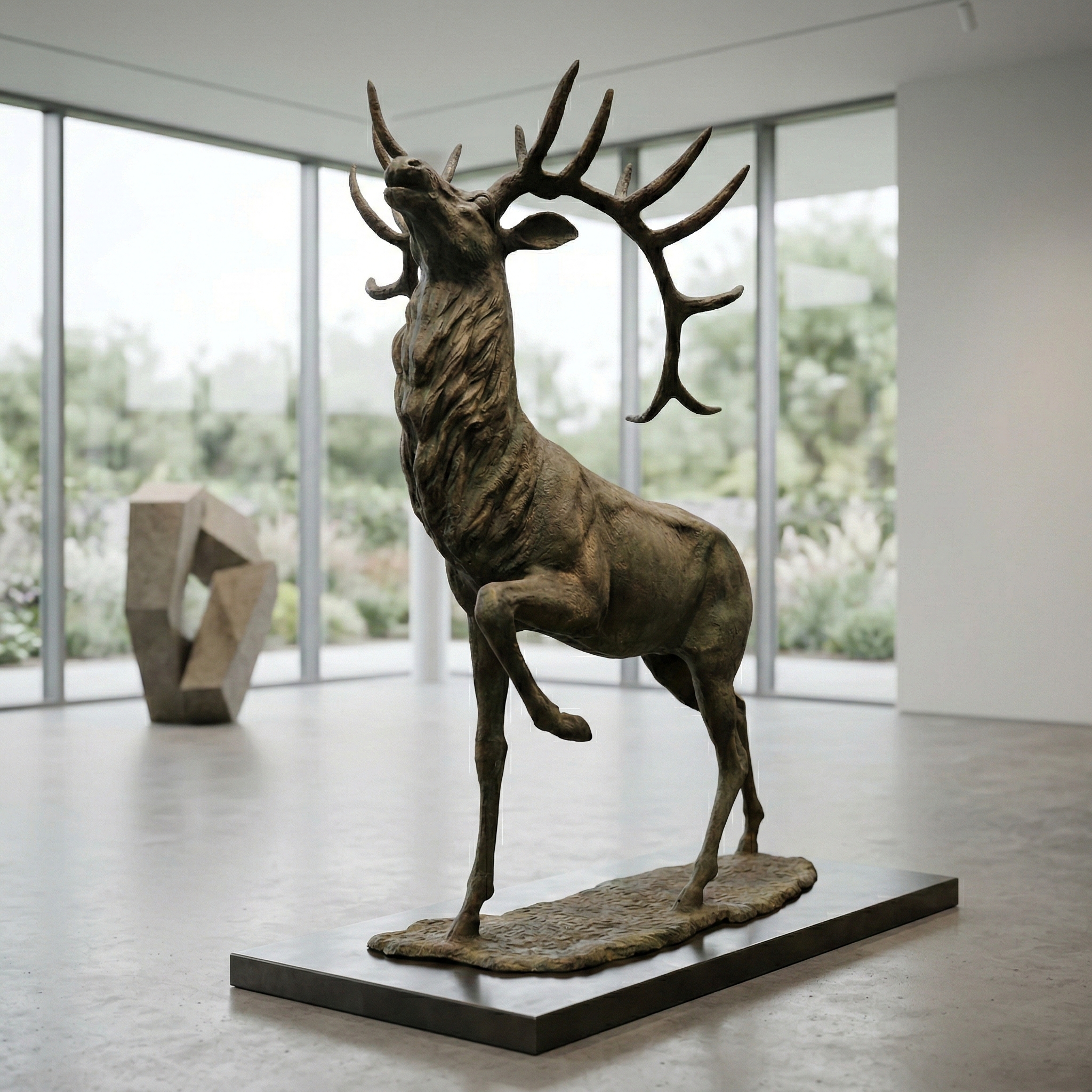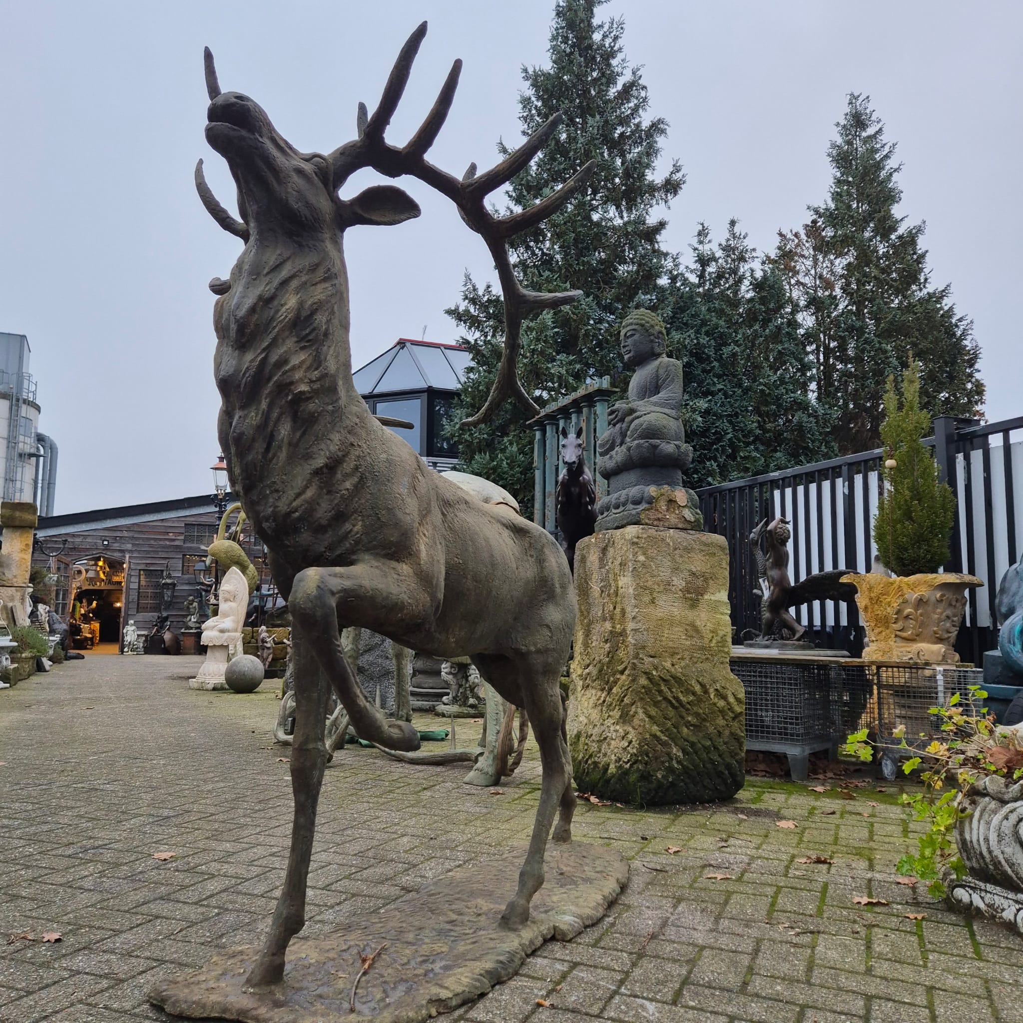 Fangen Sie die Schönheit der Natur ein mit dieser beeindruckenden Skulptur eines Hirschs. Lassen Sie sich von der Kraft und Eleganz dieses stolzen Tieres verzaubern. Die Patina, die im Laufe der Zeit entstanden ist, erzählt die Geschichte dieser Skulptur und verleiht ihr einen einzigartigen Charakter. Ein zeitloses Kunstwerk, hergestellt aus Gusseisen, das Sie und Ihre Gäste begeistern wird.