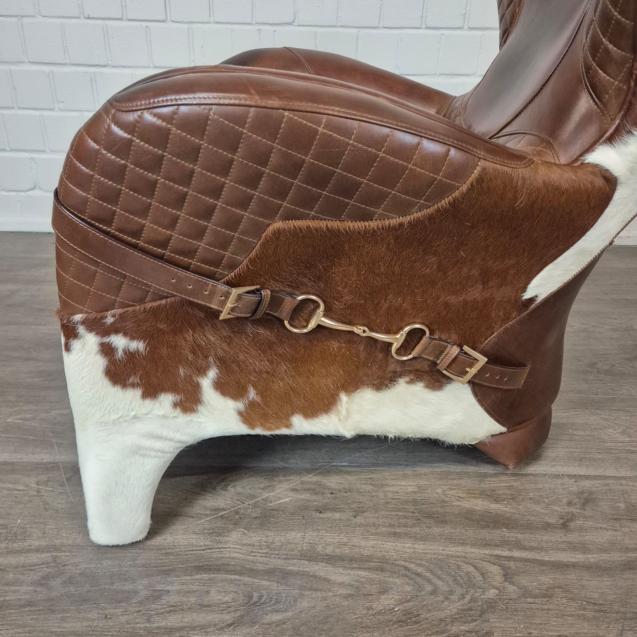 Design-Details: Auffällige Elemente wie die dekorativen Riemen und Schnallen an den Seiten (ähnlich einer Trense oder einem Sattelgurt) unterstreichen den rustikalen und zugleich luxuriösen Wild-West- oder Reitsport-Stil.