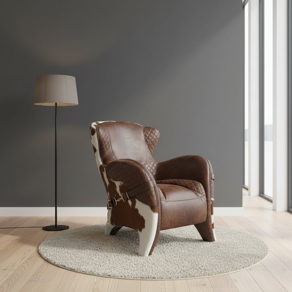 Einzigartiges Kuhfell-Design: Die Seiten und die Rückseite des Sessels sind mit echtem, naturbelassenem Kuhfell in den Farben Braun und Weiß bezogen. Dies verleiht dem Sessel einen unverwechselbaren, modernen Landhaus-Charakter und macht jedes Stück zu einem Unikat.