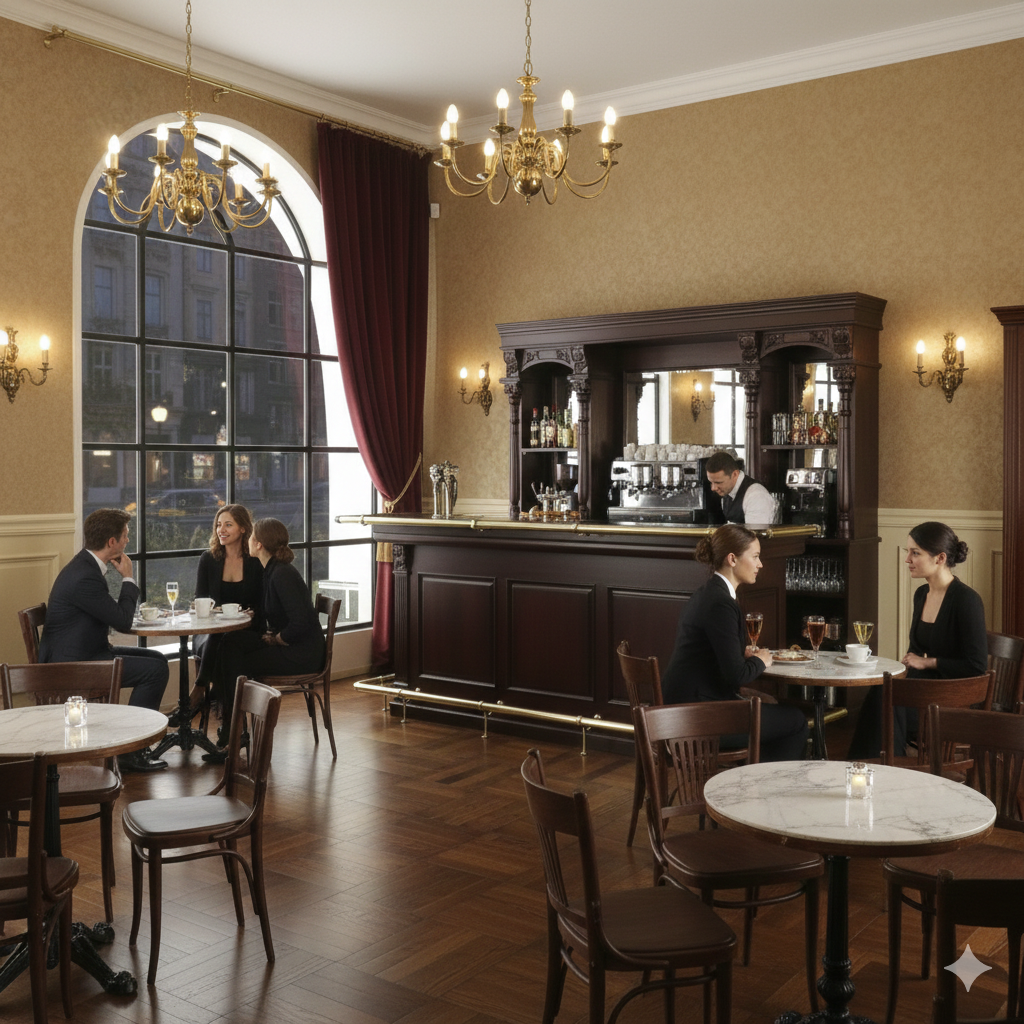 Die Theke Modell Empire aus Massivholz präsentiert sich mit aufwendigen Schnitzereien und Ornamenten an der Barfront, sowie an dem mit Spiegeln versehenen Rückwandbuffet.