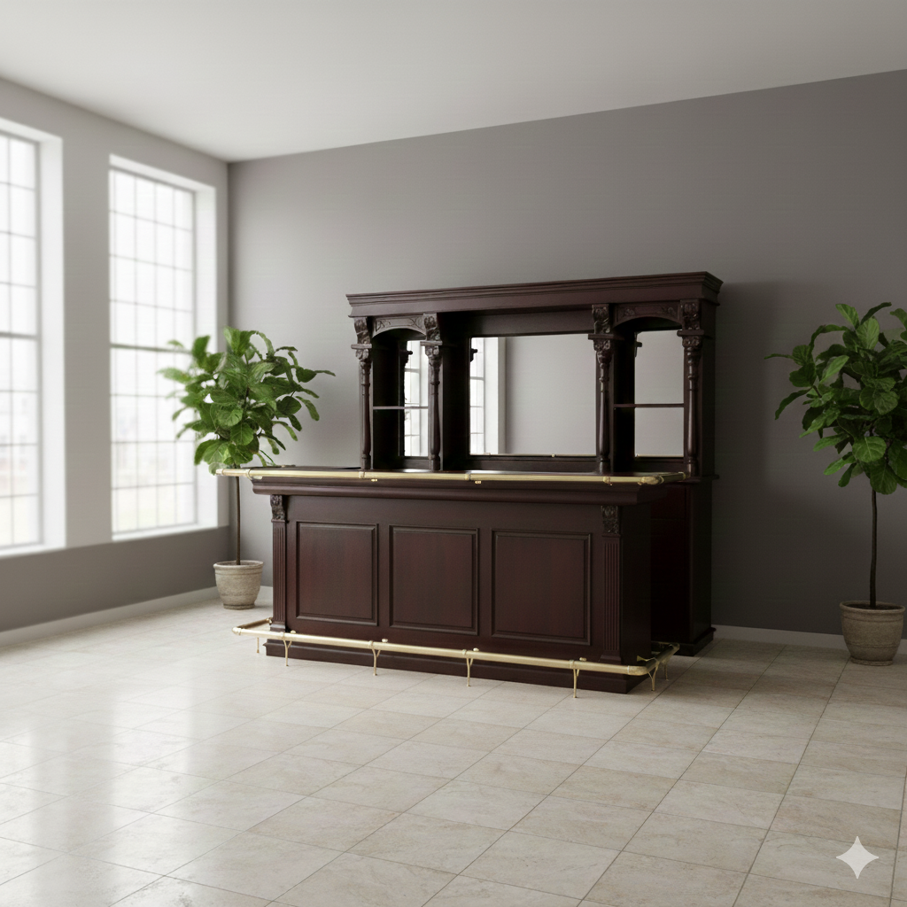 Die Theke Modell Empire aus Massivholz präsentiert sich mit aufwendigen Schnitzereien und Ornamenten an der Barfront, sowie an dem mit Spiegeln versehenen Rückwandbuffet.