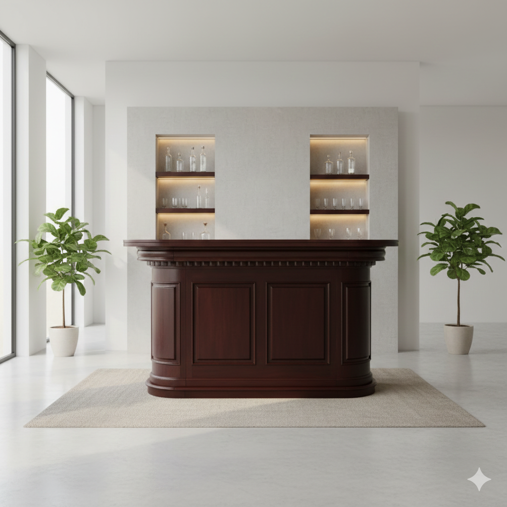 Die englische Theke aus massiv Mahagoni präsentiert sich mit aufwendigen Schnitzereien und Ornamenten an der Front.