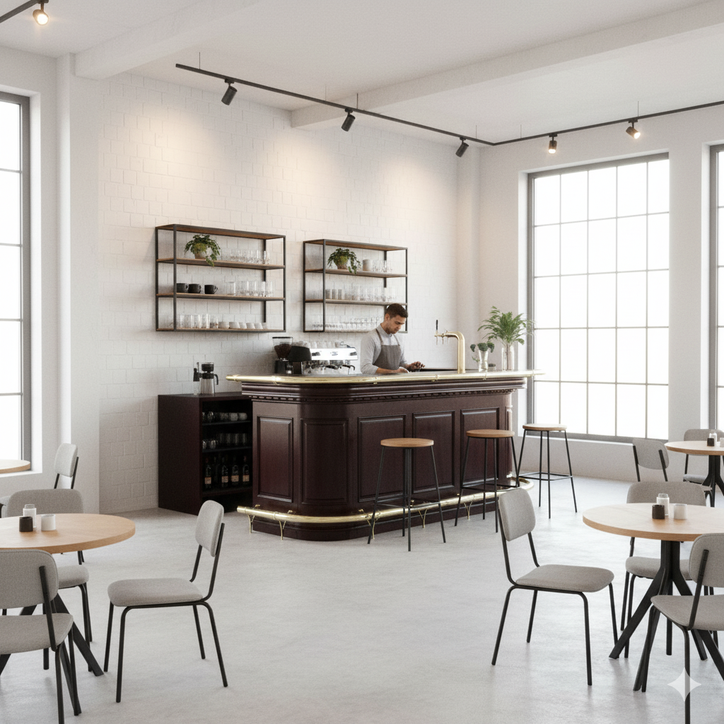 Die englische Theke aus massiv Mahagoni präsentiert sich mit aufwendigen Schnitzereien und Ornamenten an der Front.