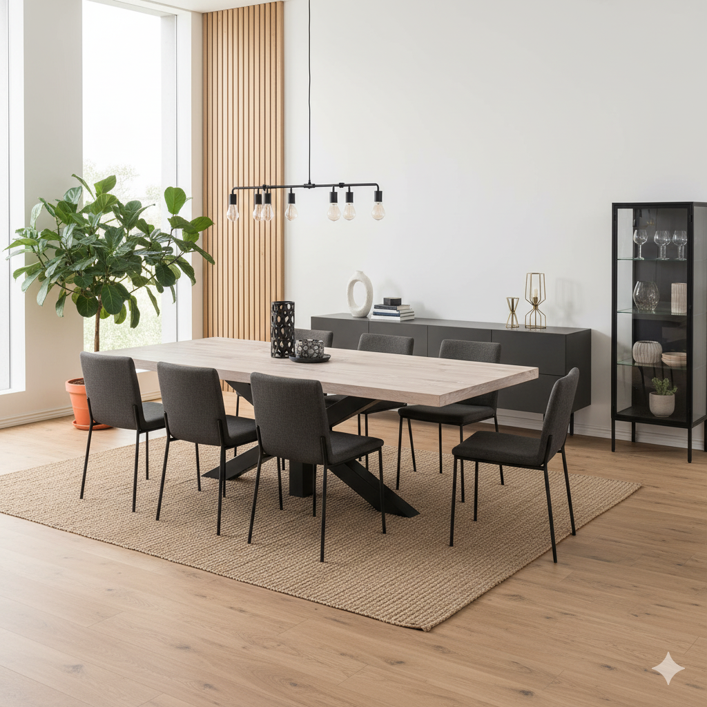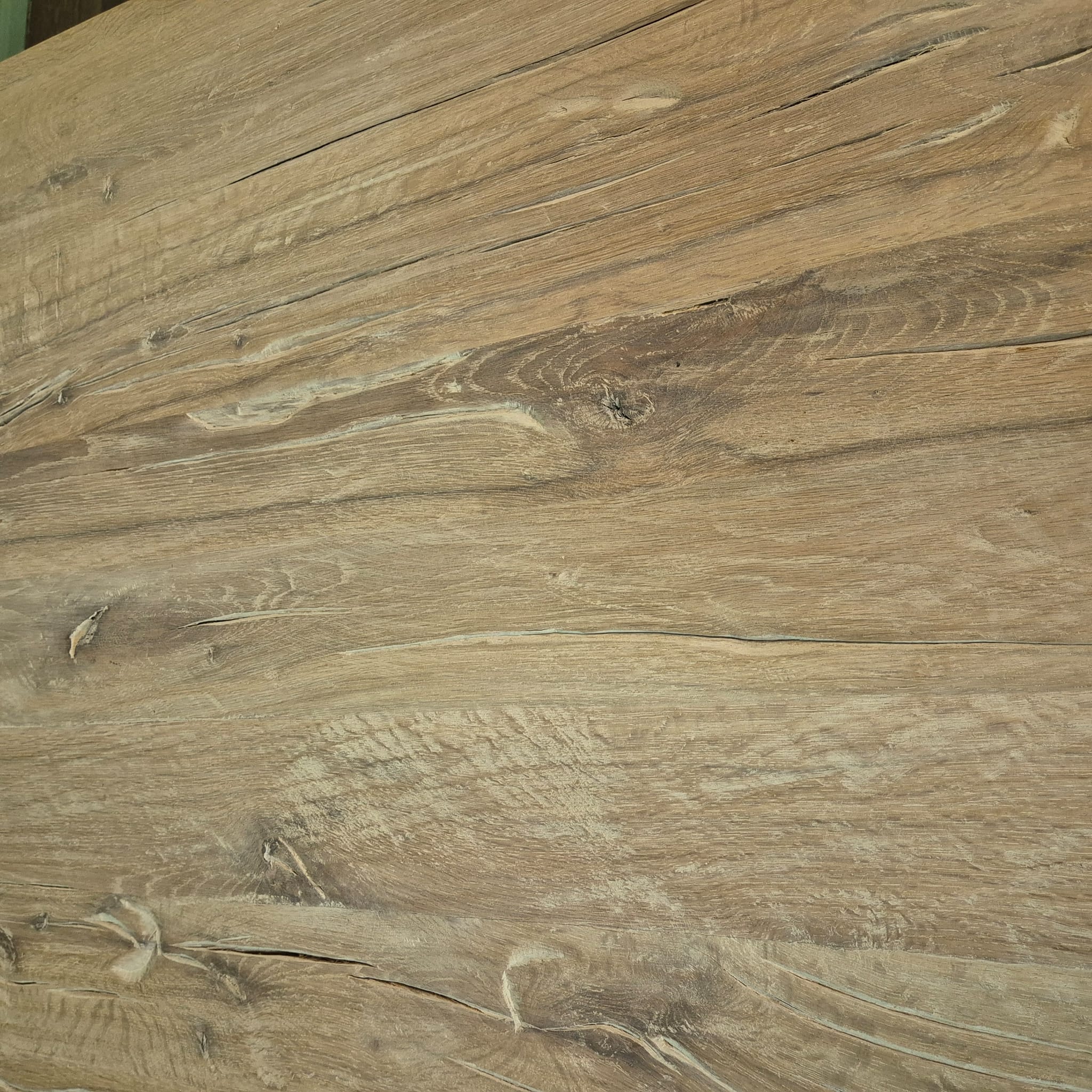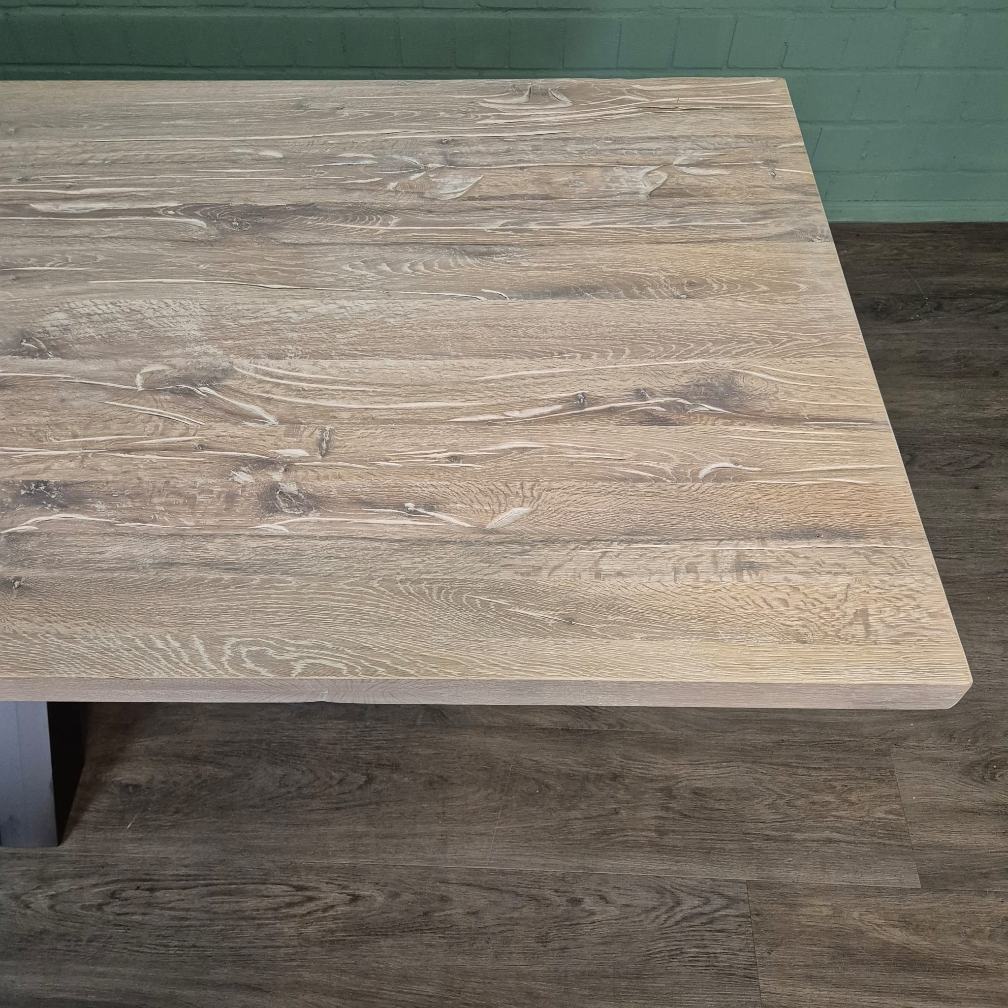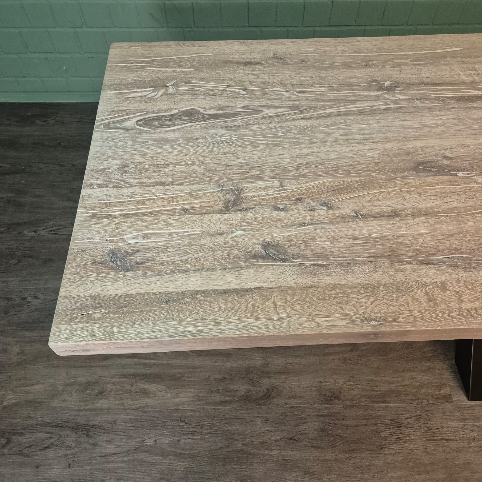 Dieser im Industrial Design mit Untergestell aus Stahl versehene Tisch aus massiv Eiche erhält seine besondere Wirkung durch minimale Unregelmäßigkeiten im Holz. Diese entstehen durch das verwendete Holz mit seinen verschiedenen Farben und Strukturen, welche diesem Stück einen eigentümlichen Charakter verleihen und es zu einem Unikat machen. Maserung und Farbton des Holzes tragen sehr zum optischen Wert dieses Möbels bei, das sich in seiner schlichten Eleganz vielen Modetrends anpasst.