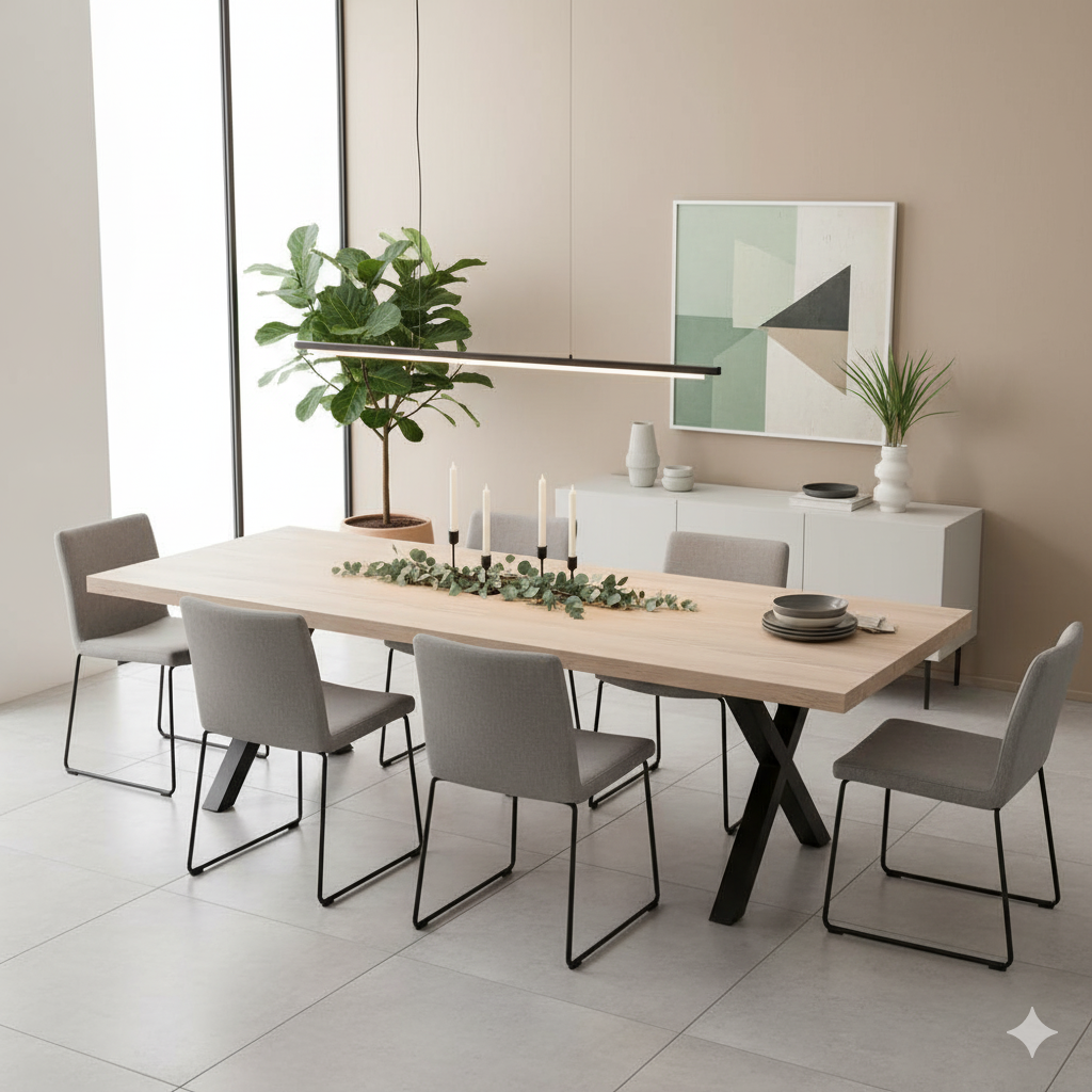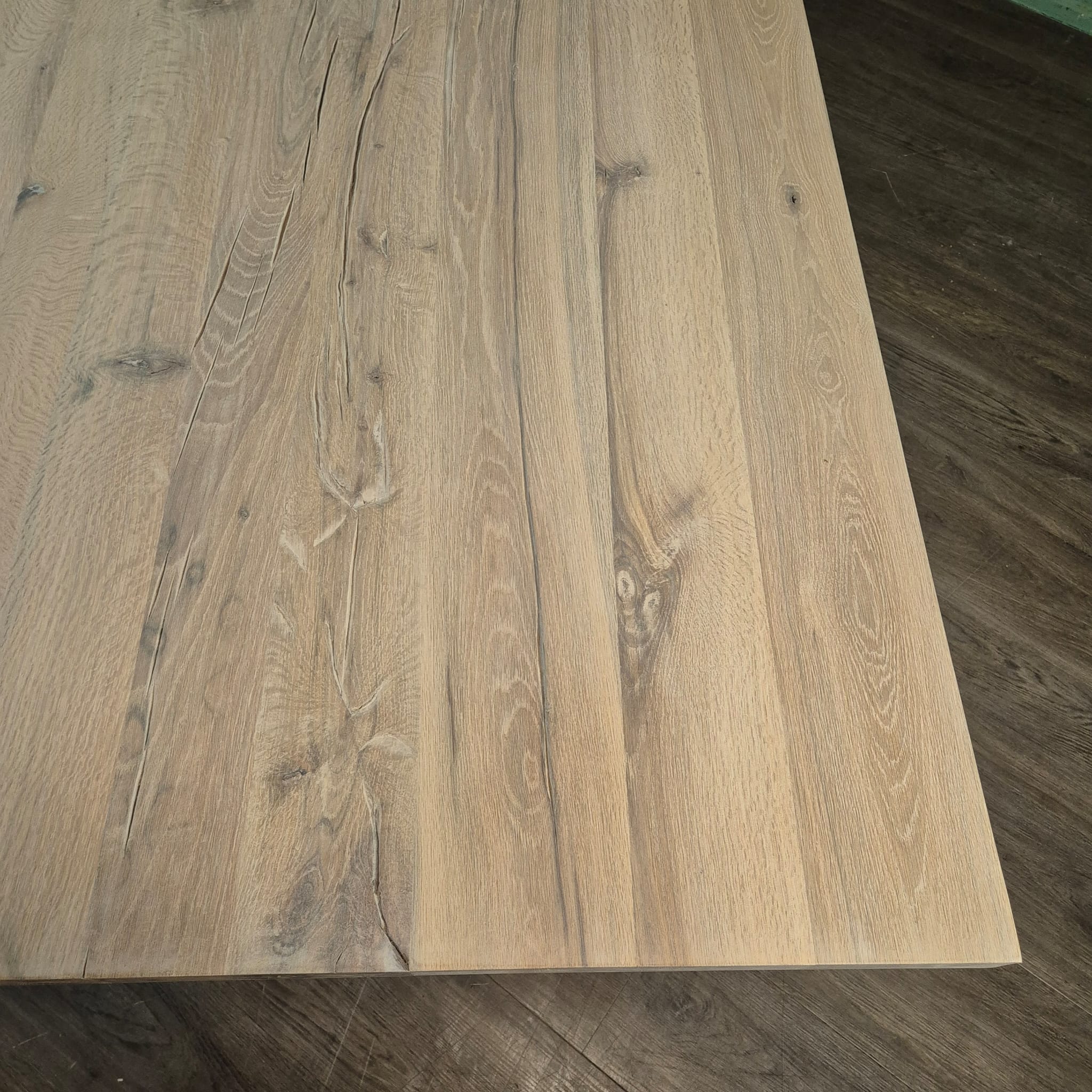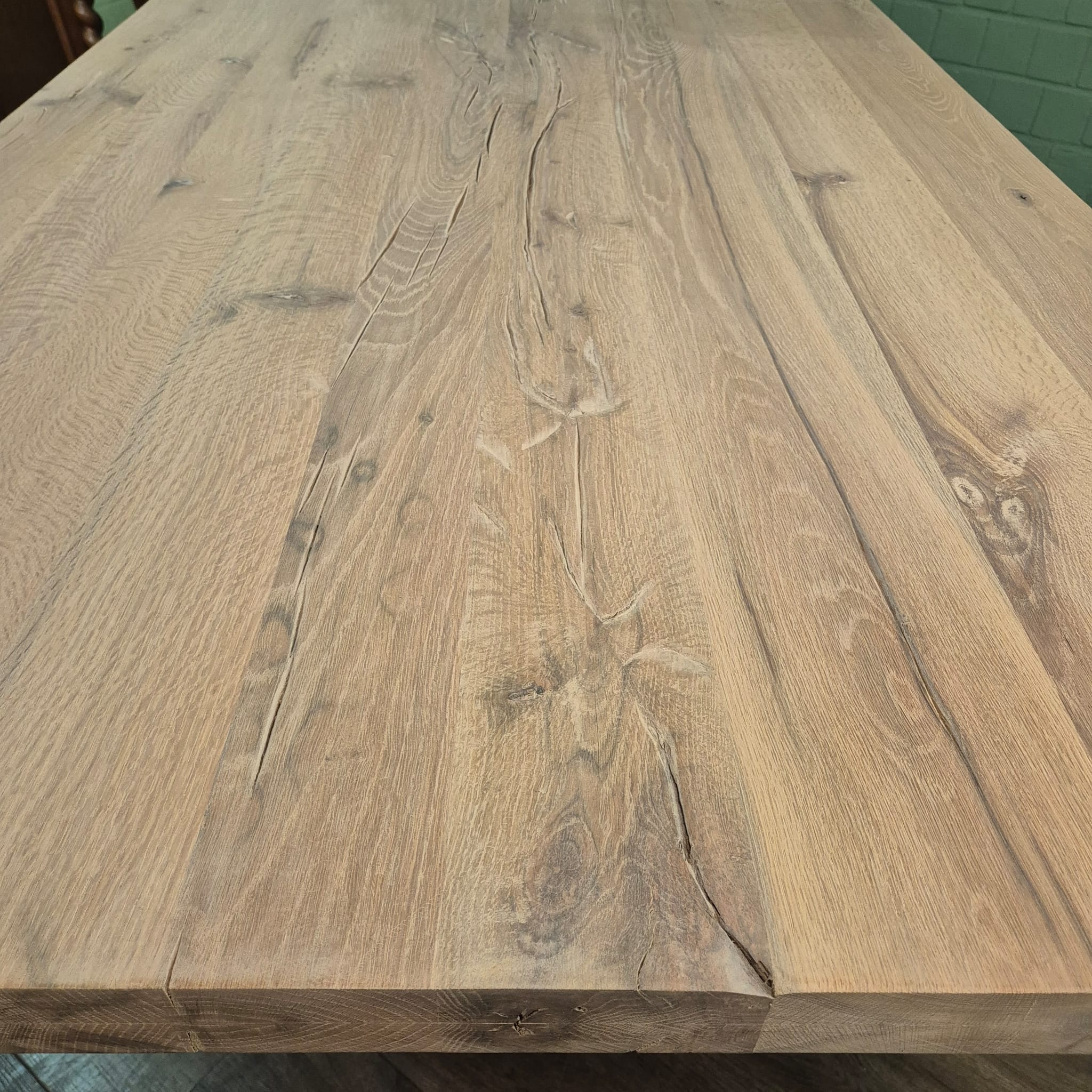 Dieser im Industrial Design mit Untergestell aus Stahl versehene Tisch aus massiv Eiche erhält seine besondere Wirkung durch minimale Unregelmäßigkeiten im Holz. Diese entstehen durch das verwendete Holz mit seinen verschiedenen Farben und Strukturen, welche diesem Stück einen eigentümlichen Charakter verleihen und es zu einem Unikat machen. Maserung und Farbton des Holzes tragen sehr zum optischen Wert dieses Möbels bei, das sich in seiner schlichten Eleganz vielen Modetrends anpasst.