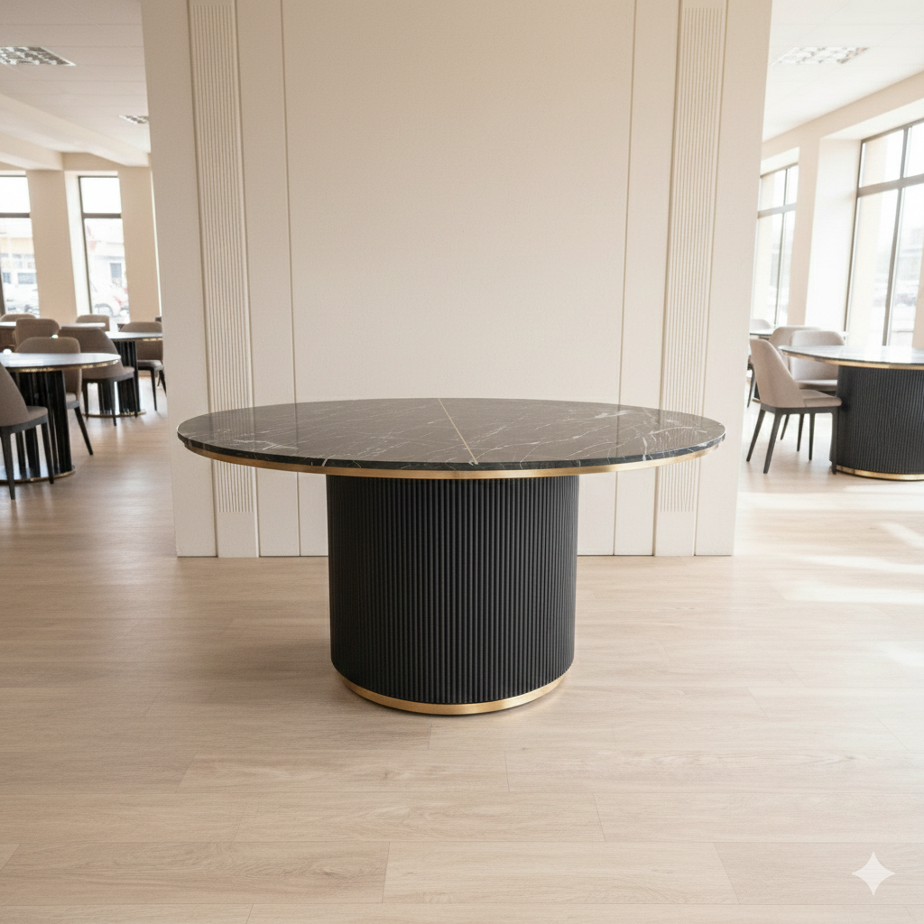 Perfekte Maße: Mit einer komfortablen Höhe von 80 cm und einem großzügigen Durchmesser von 150 cm bietet der Tisch Platz für 6 bis 8 Personen und ist ideal für Esszimmer, Konferenzräume oder repräsentative Wohnbereiche.