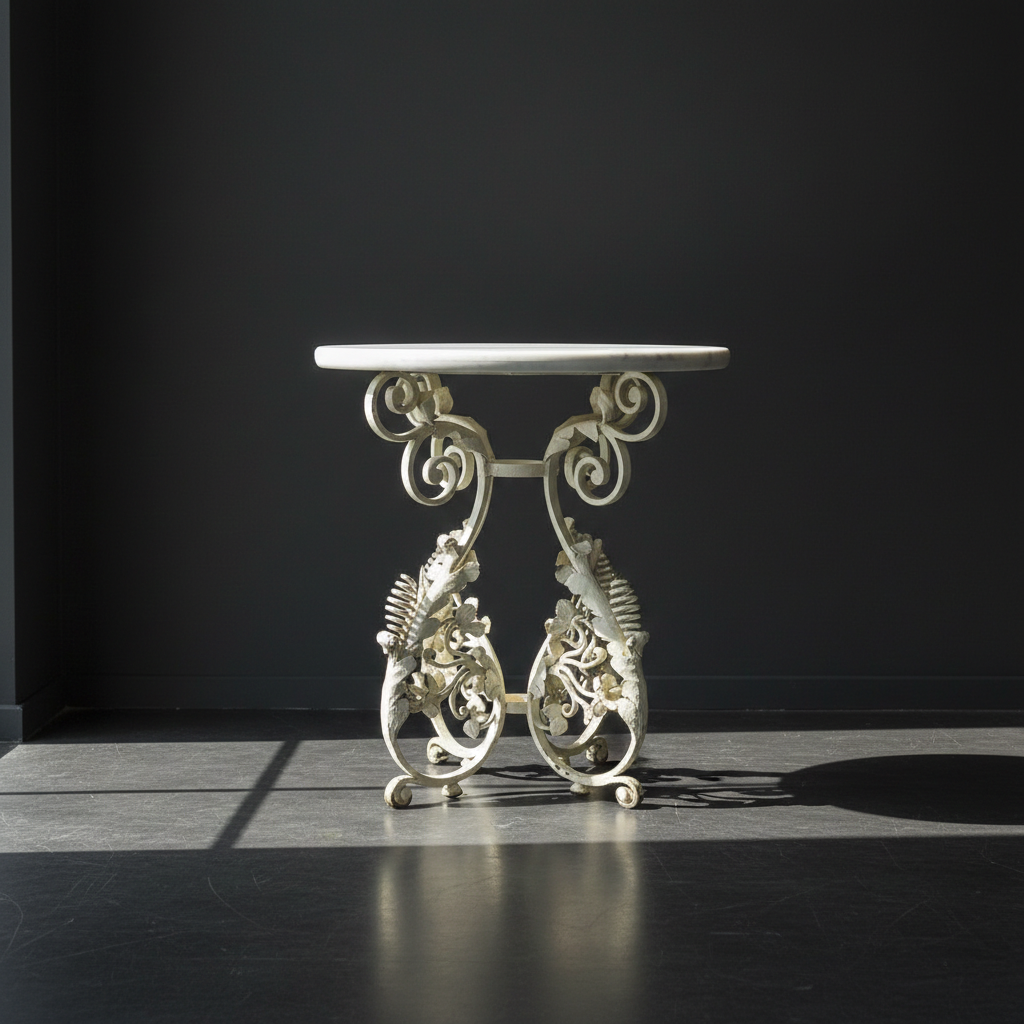 Stilvoller Marmortisch auf nostalgisch gestaltetem, massiven Eisengestell. Zeitlos schön und witterungsbeständig der perfekte Tisch für Haus und Garten.
