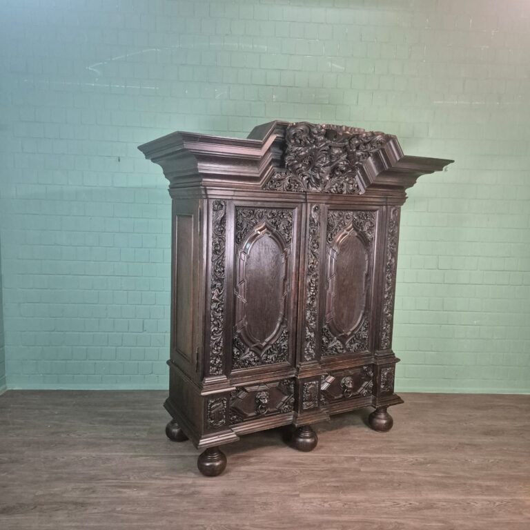 Restaurierter Barockstil Dielenschrank aus massiv Eiche (gewachst) von ca. 1880. Der Schrank befindet sich in einem sehr guten Zustand und weist nur minimale Gebrauchsspuren auf. Zerlegbar (8-teilig).