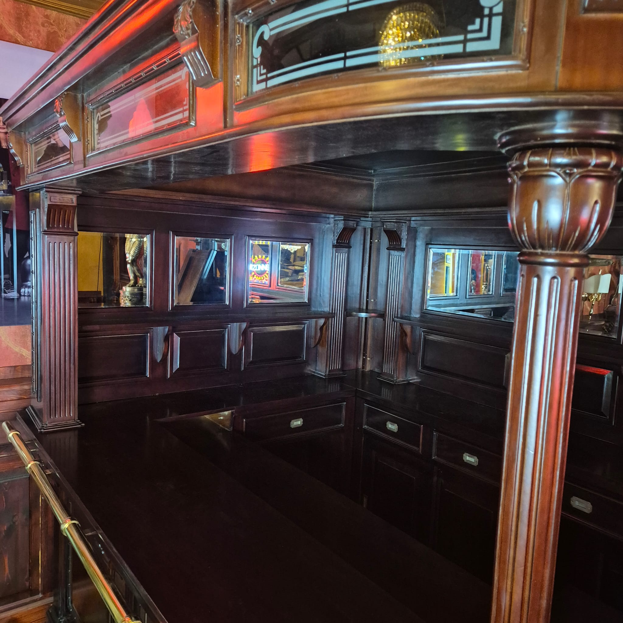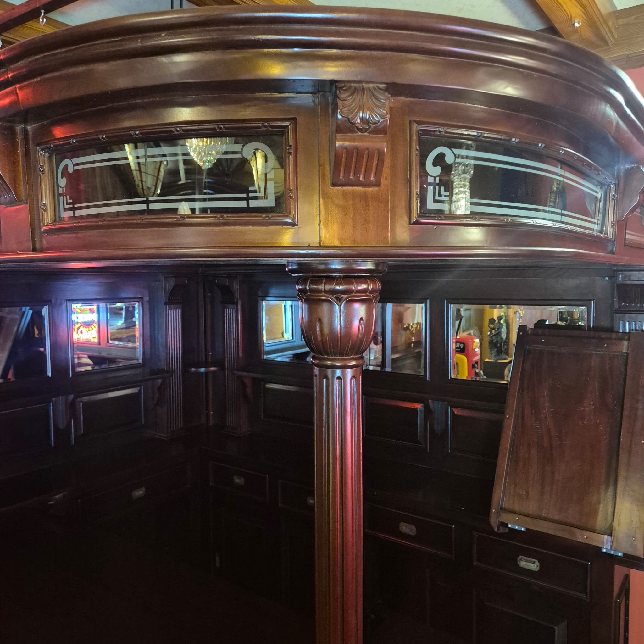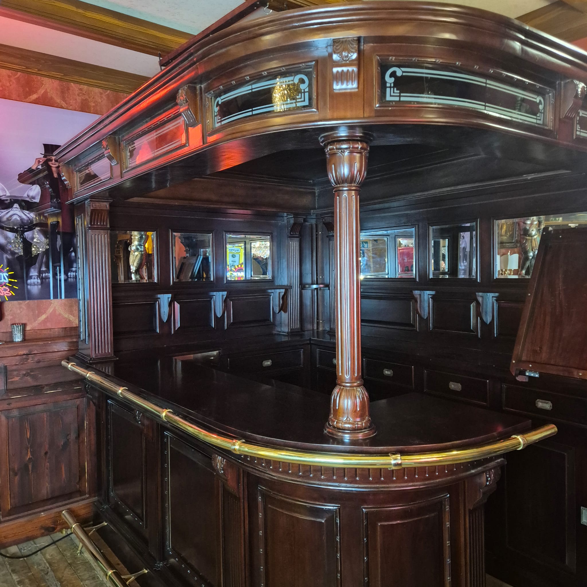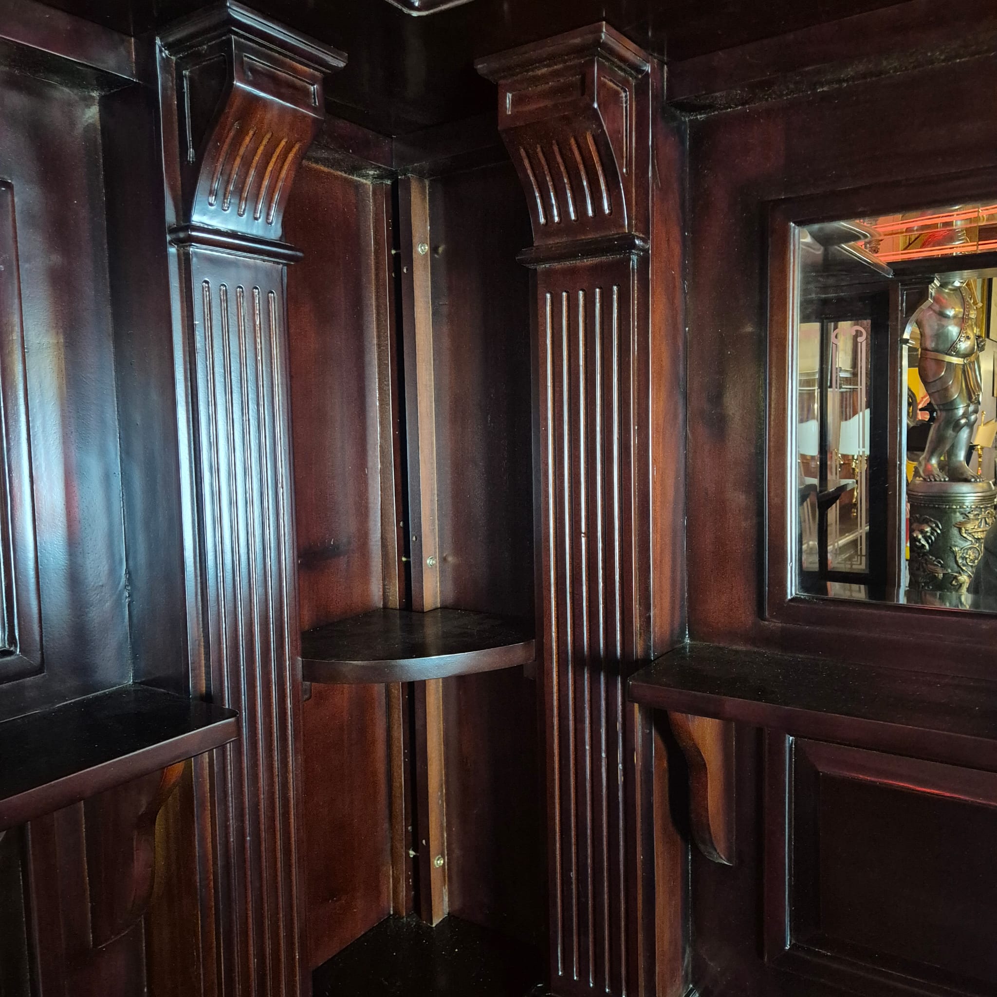 Die Theke Modell Home Bar aus Massivholz beeindruckt durch ihr imposantes Erscheinungsbild, sowie dem stilvollen, mit Spiegeln und Säulen versehenen Rückwandbuffet. Zerlegbar (15-teilig).