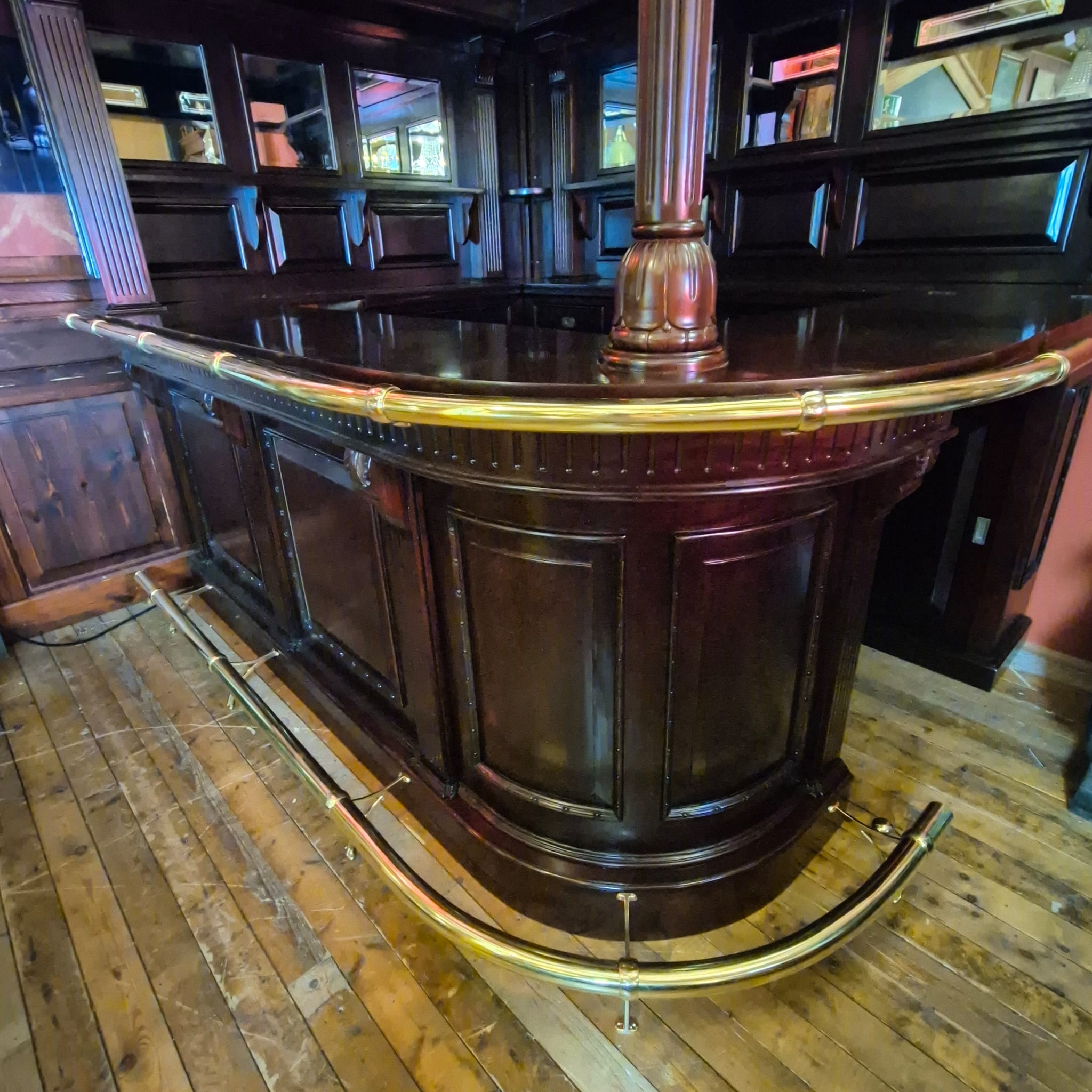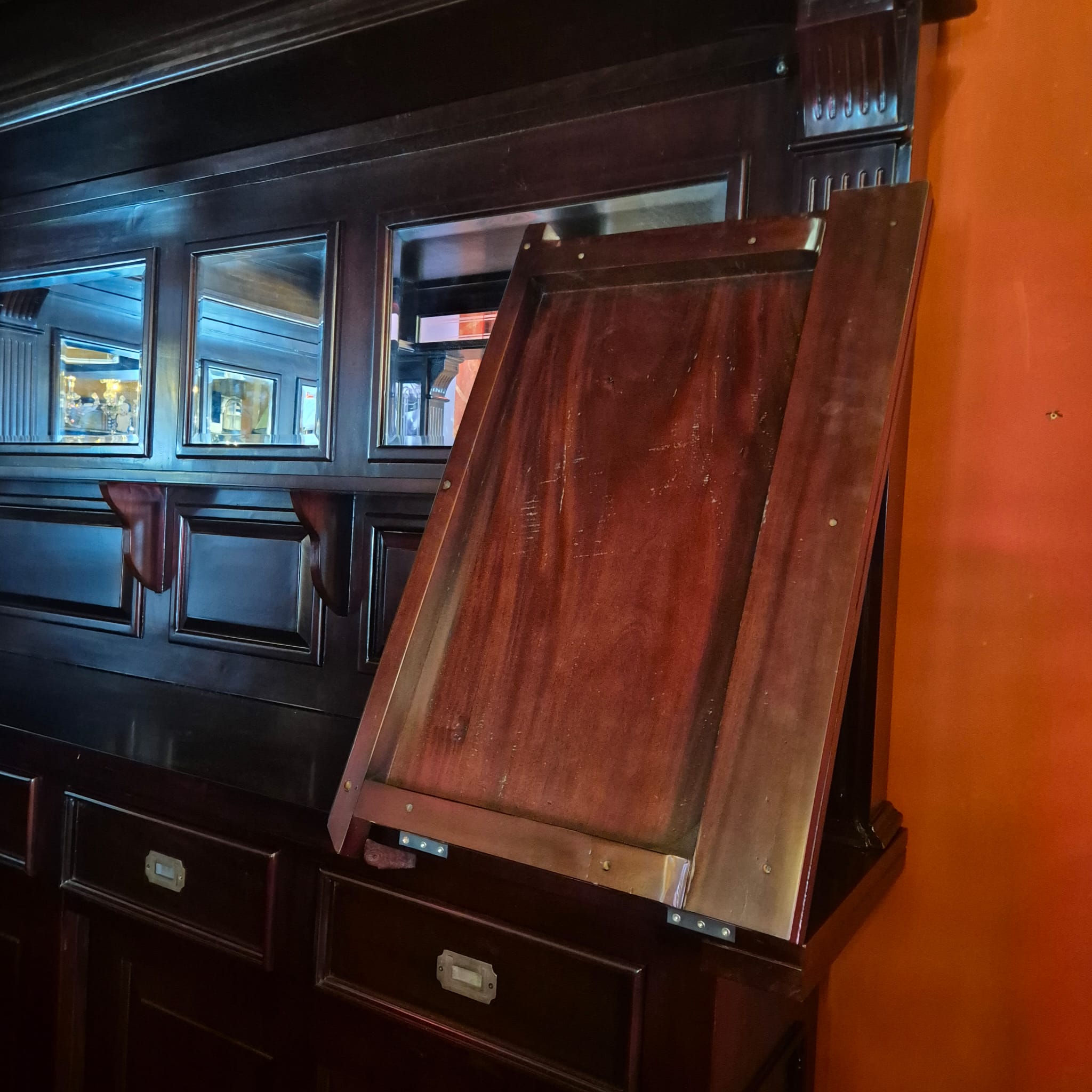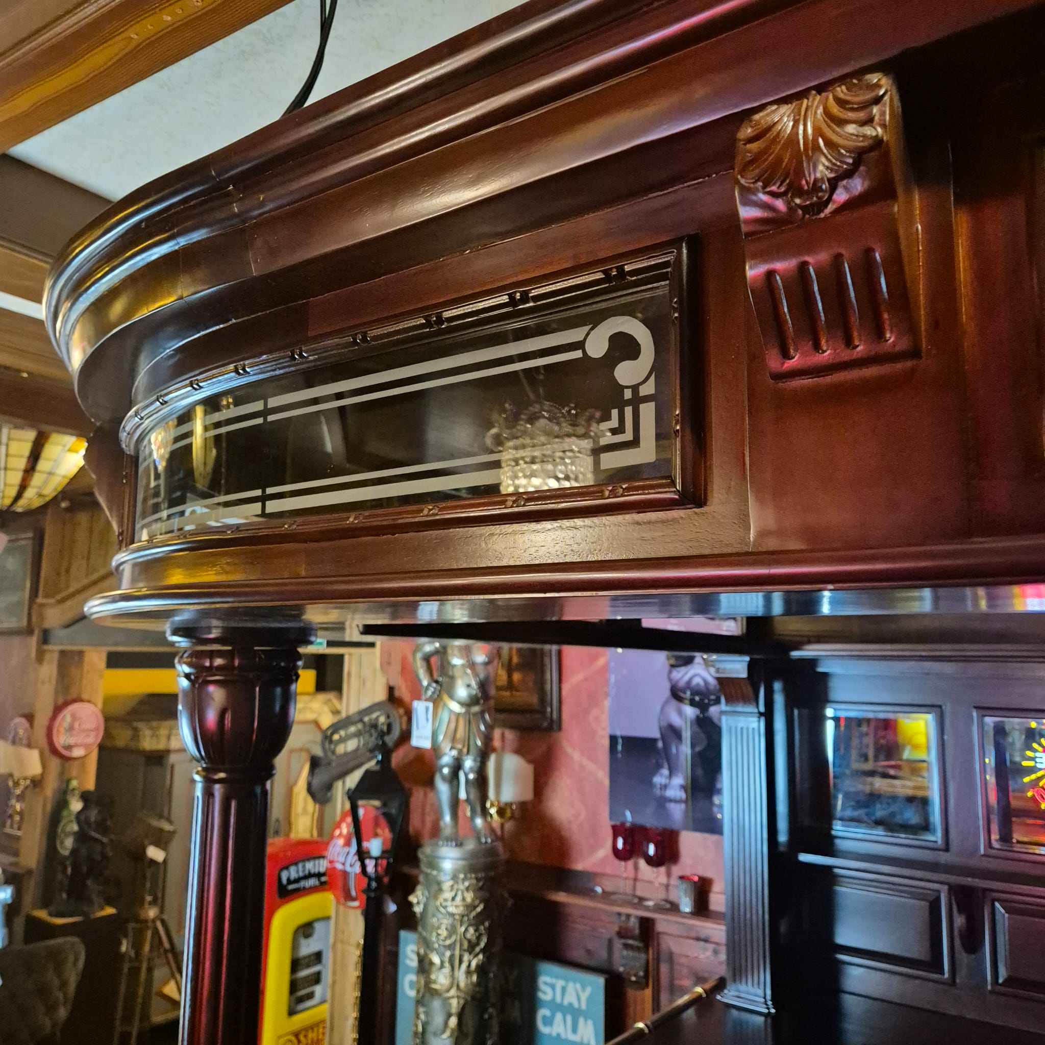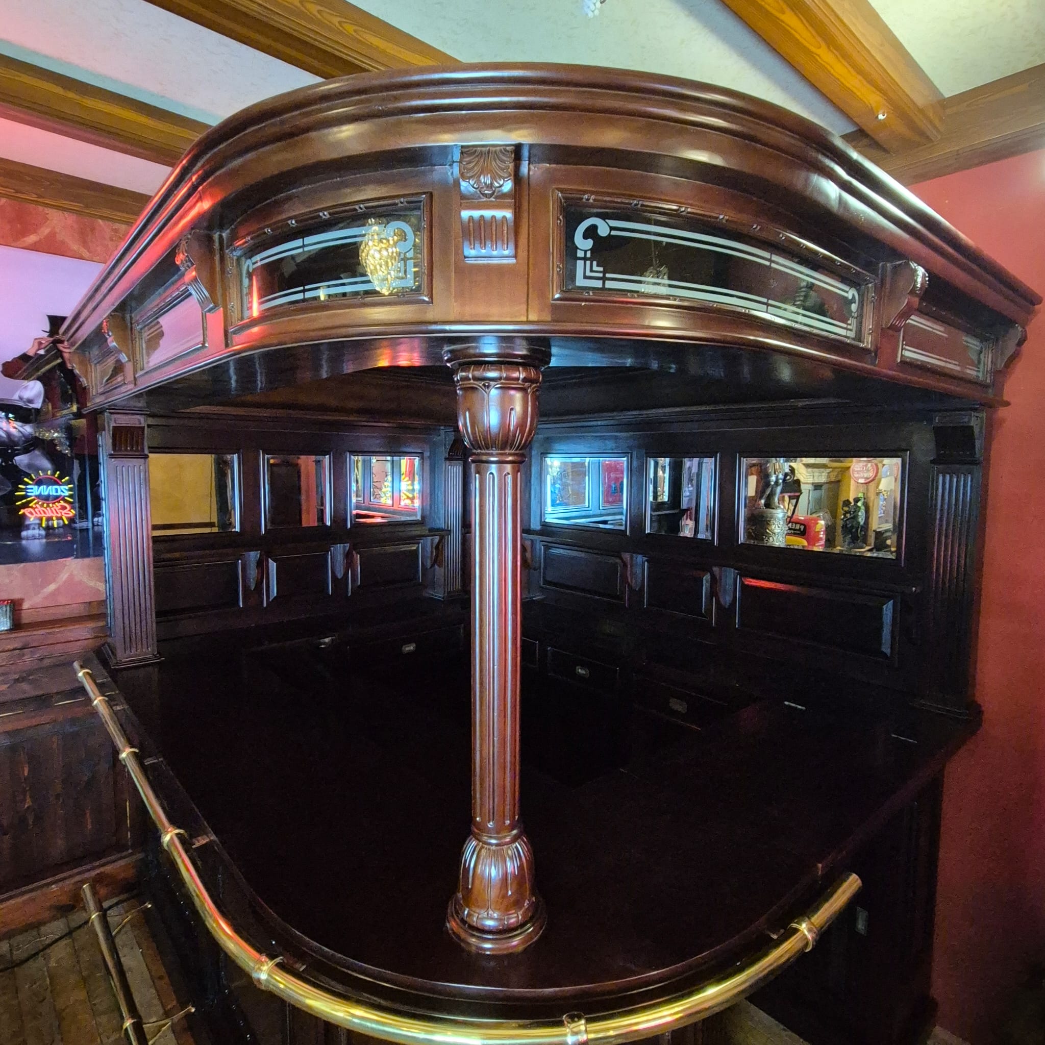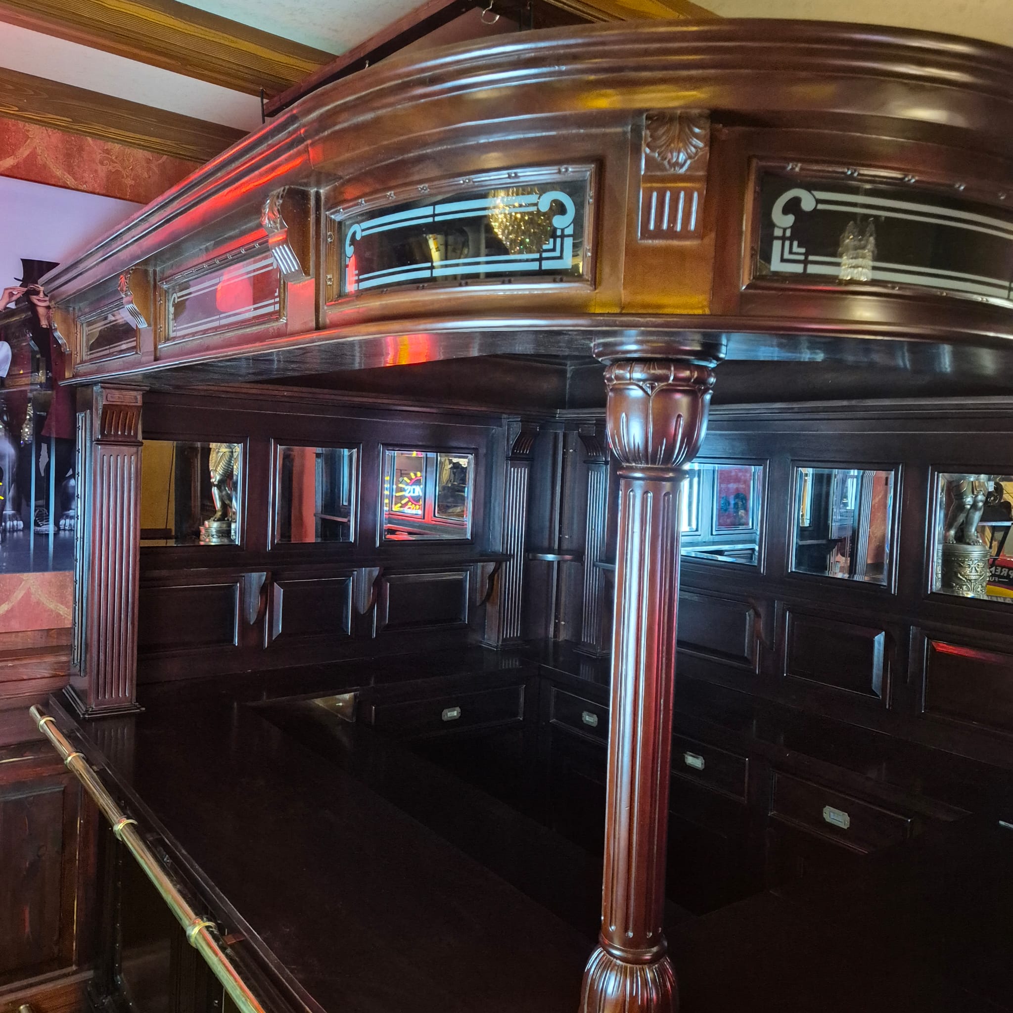 Die Theke Modell Home Bar aus Massivholz beeindruckt durch ihr imposantes Erscheinungsbild, sowie dem stilvollen, mit Spiegeln und Säulen versehenen Rückwandbuffet. Zerlegbar (15-teilig).