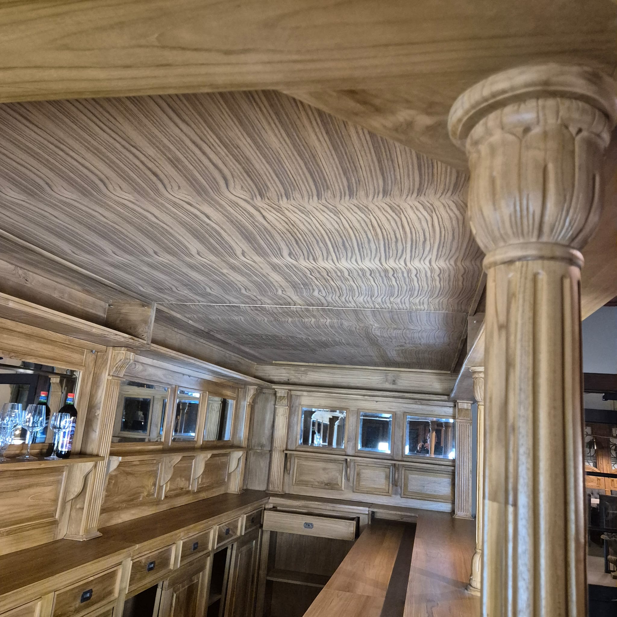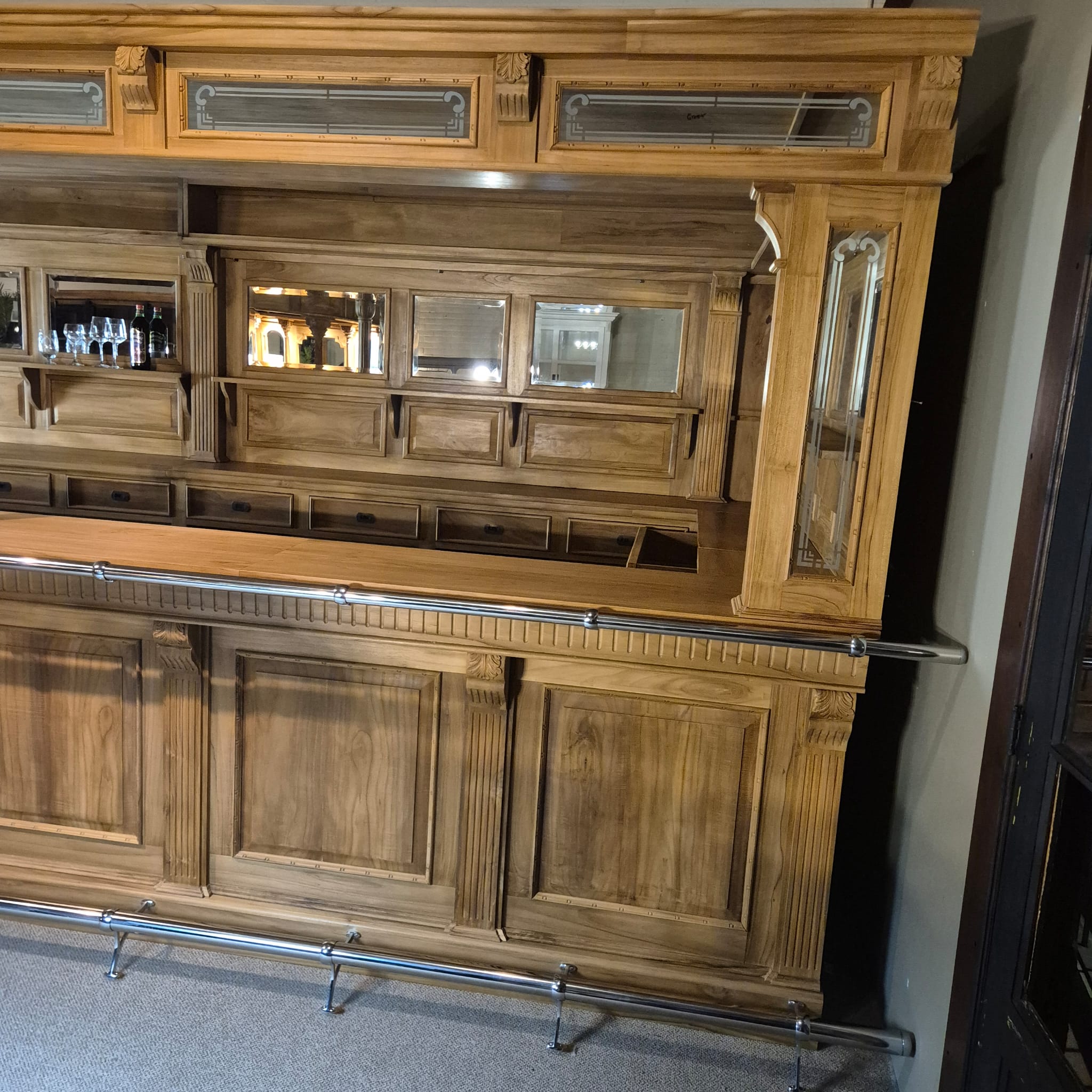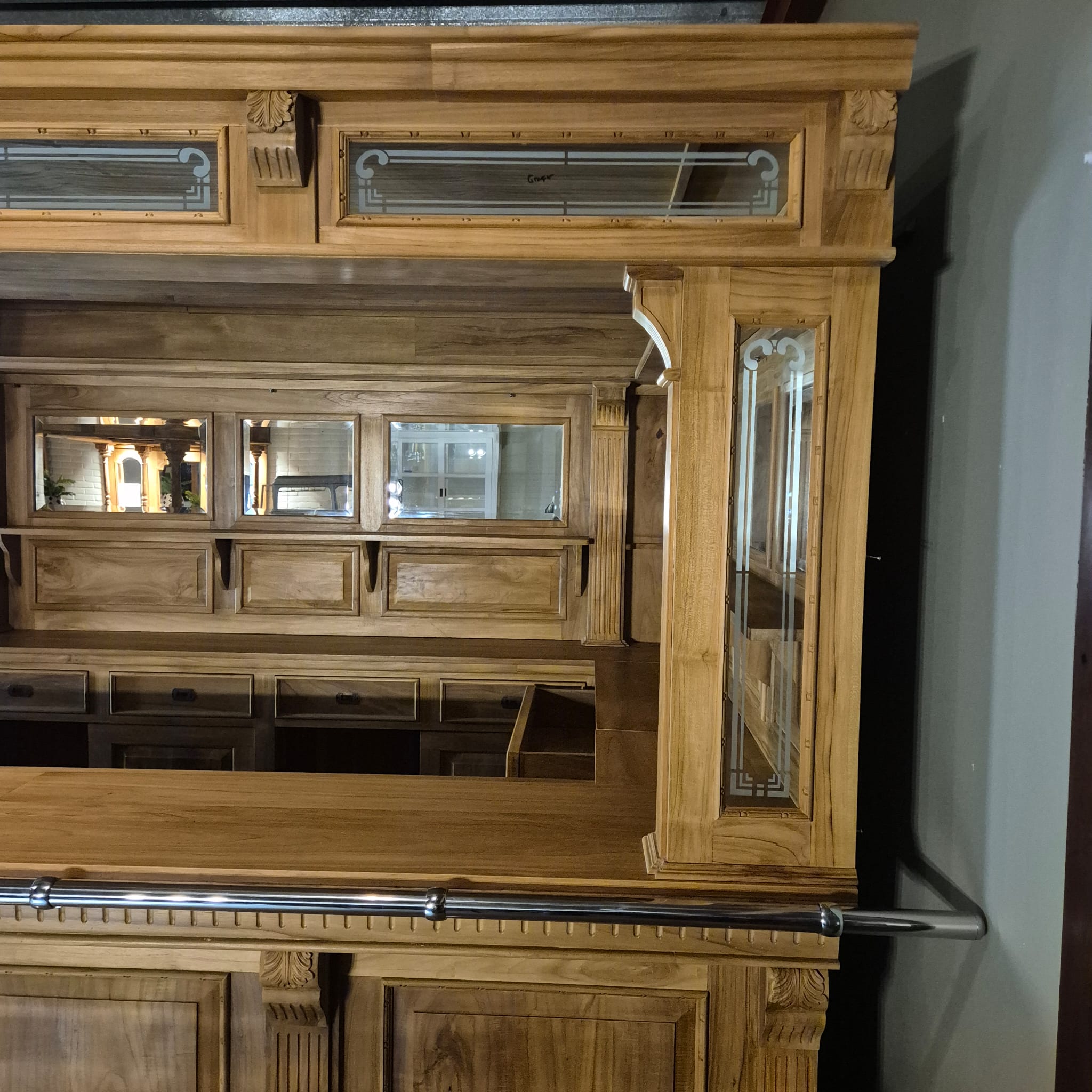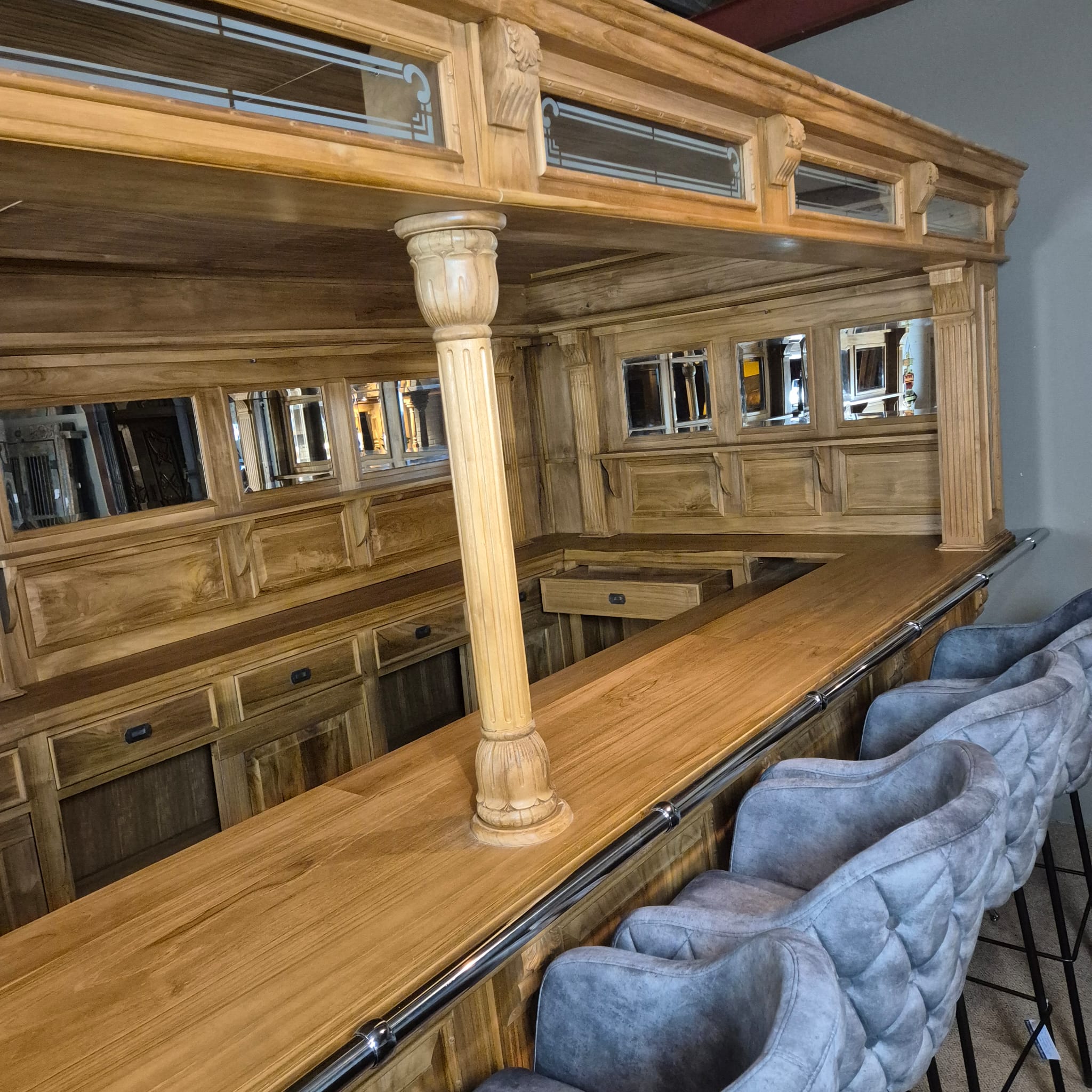 Die Theke Modell Home Eck-Bar aus Massivholz beeindruckt durch ihr imposantes Erscheinungsbild, sowie dem stilvollen mit Spiegeln und Säulen versehenen Rückwandbuffet. Zerlegbar.