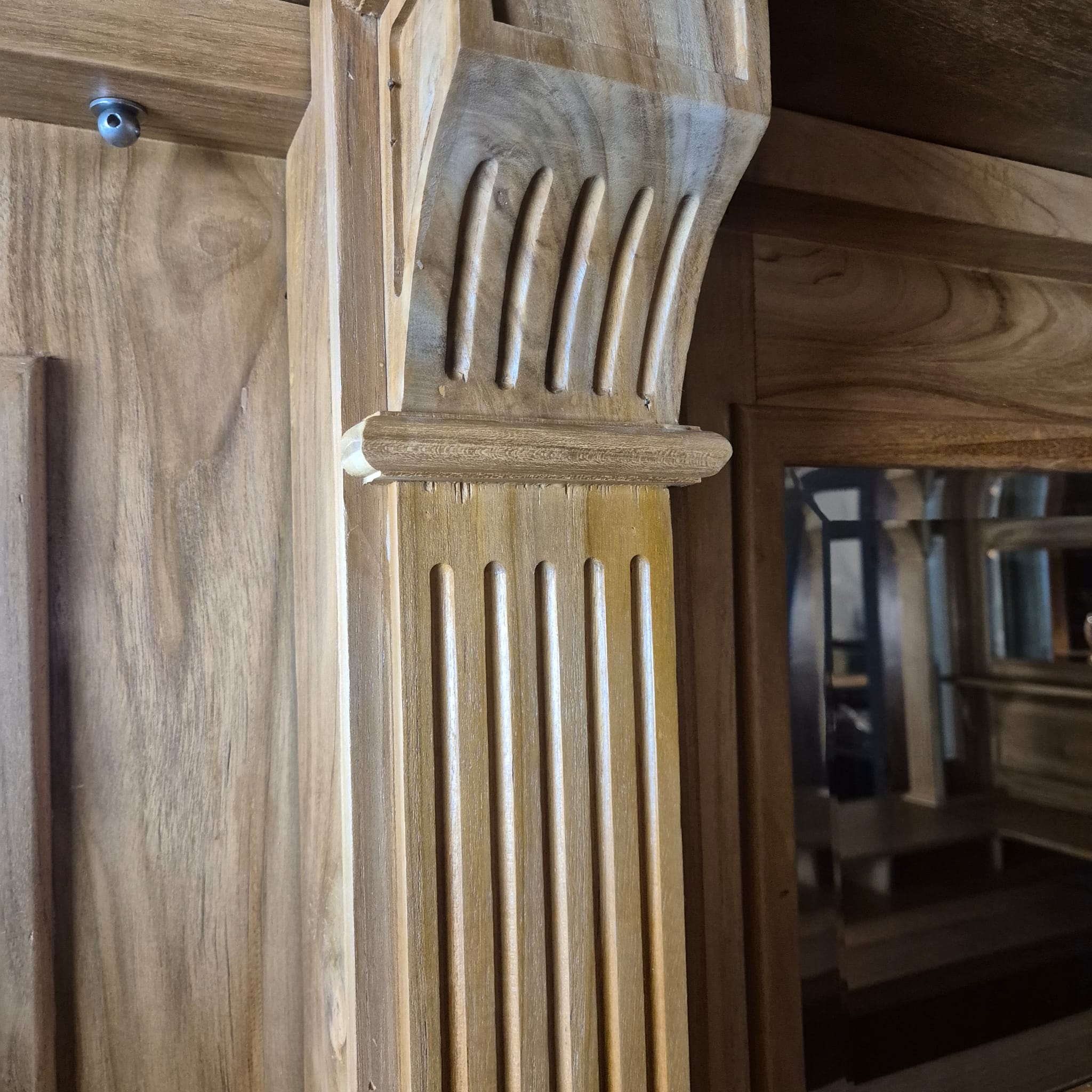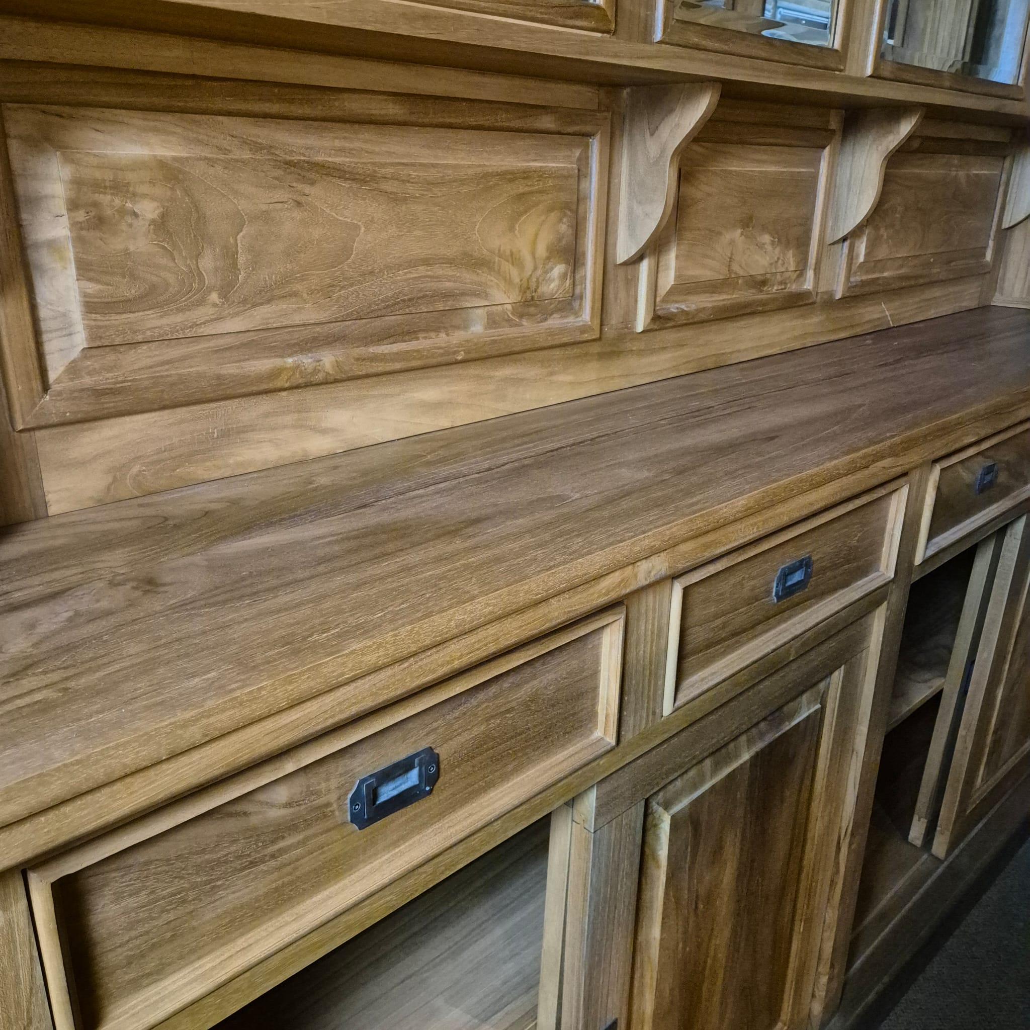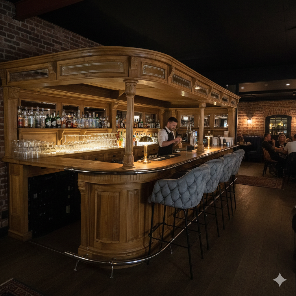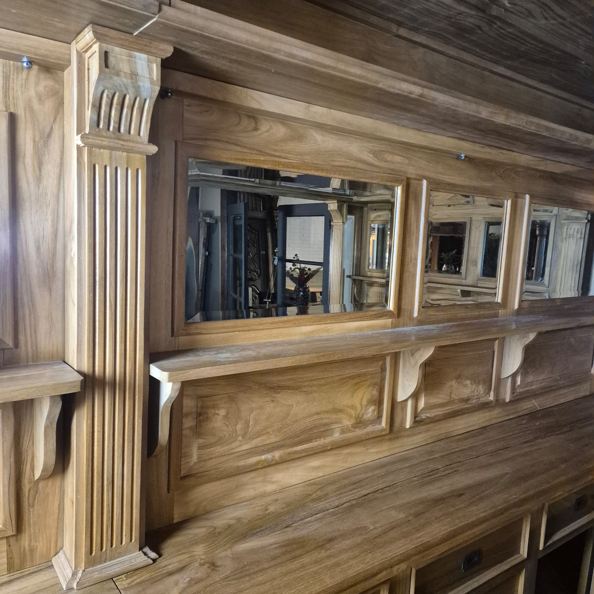 Die Theke Modell Home Eck-Bar aus Massivholz beeindruckt durch ihr imposantes Erscheinungsbild, sowie dem stilvollen mit Spiegeln und Säulen versehenen Rückwandbuffet. Zerlegbar.
