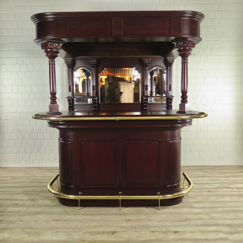 Die Theke Modell Home Bar aus Massivholz beeindruckt durch ihr imposantes Erscheinungsbild, sowie dem stilvollen mit Spiegeln und Säulen versehenen Rückwandbuffet. Sie ist versehen mit Schiebetüren und Schubladen.