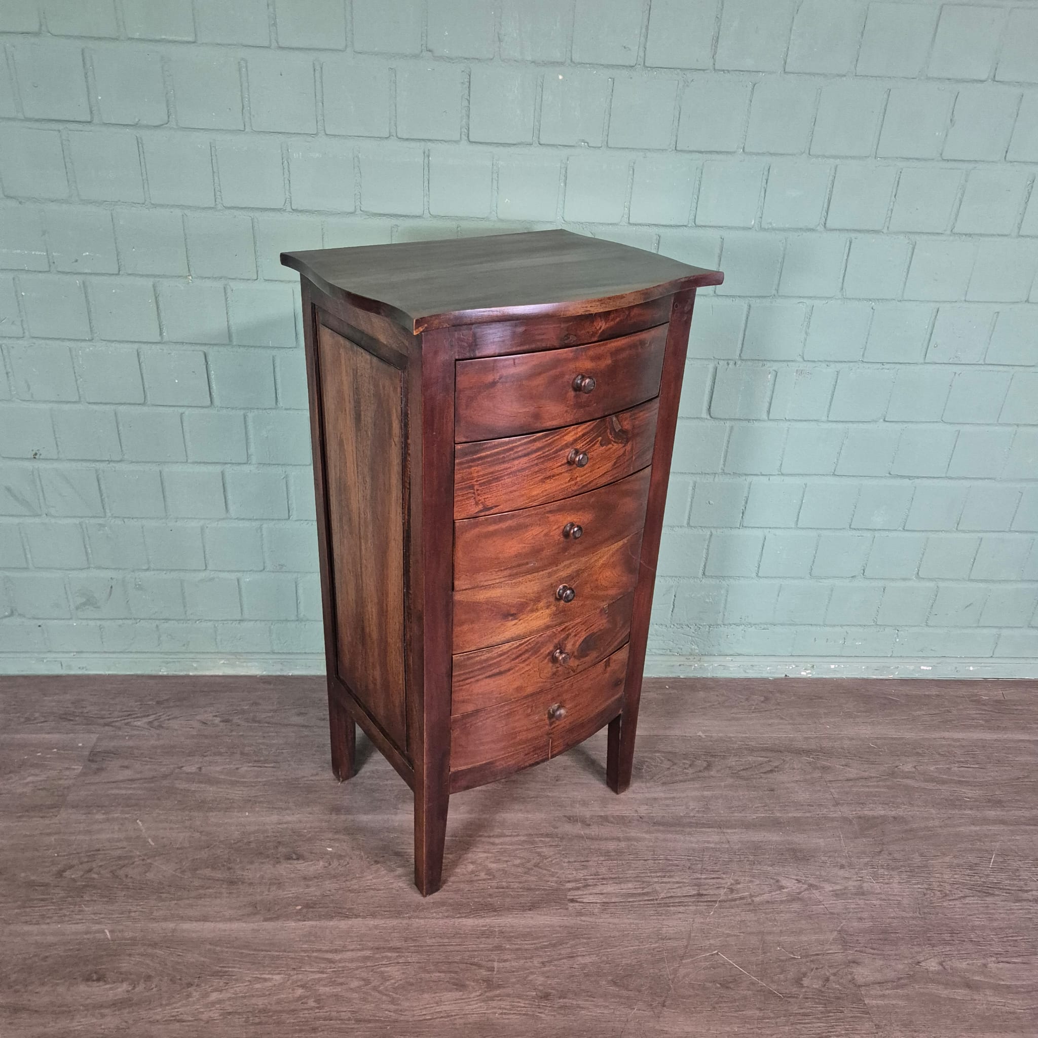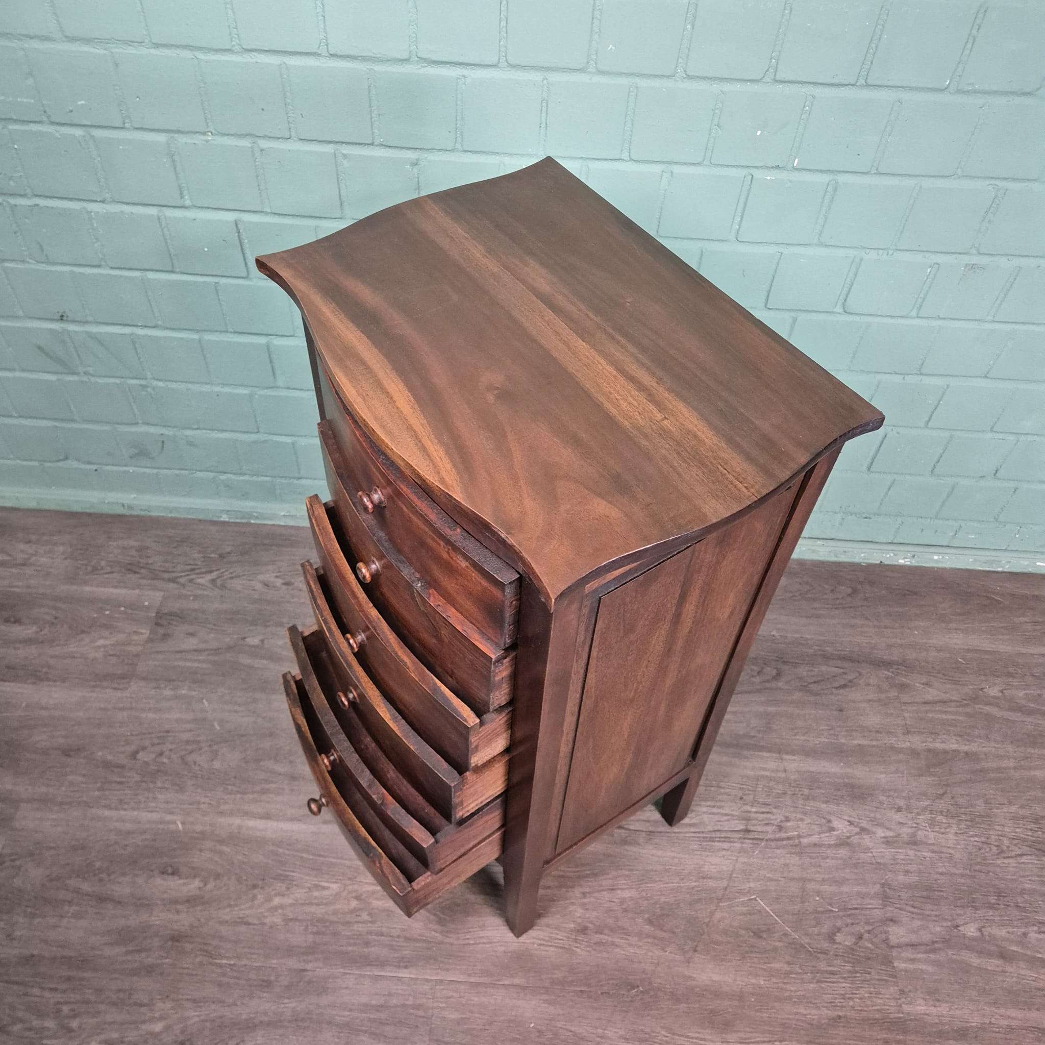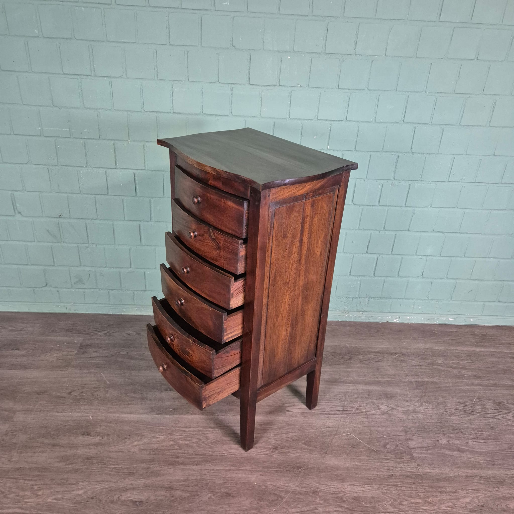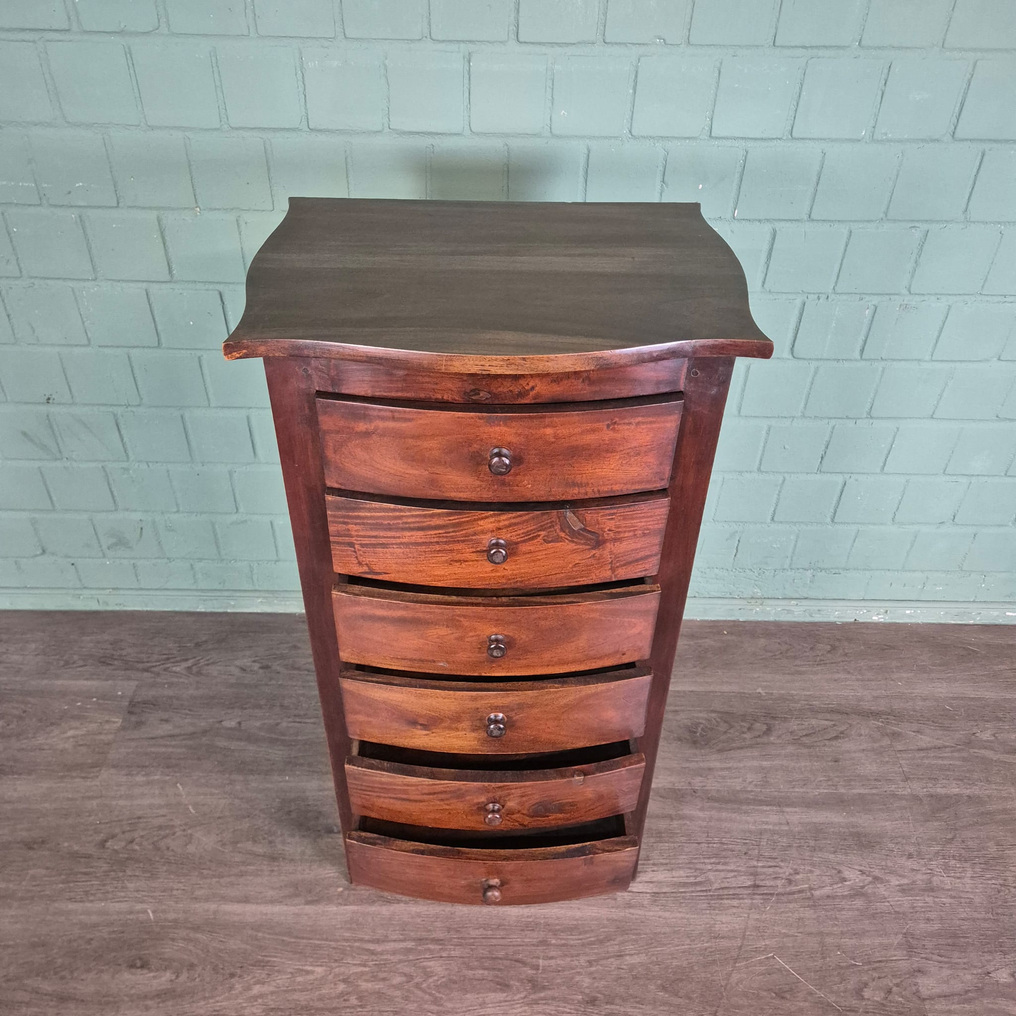 Diese stilvolle gestaltete Kommode aus massiv Teakholz (gewachst) erhält ihre besondere Wirkung durch natürliche Unregelmäßigkeiten im Holz. Diese entstehen durch das verwendete Edelholz mit seinen verschiedenen Strukturen, welche diesem Stück einen eigentümlichen Charakter verleihen und es zu einem Unikat machen. Machart und Farbton des Holzes tragen sehr zum optischen Wert dieses Möbels bei, das sowohl dekorative Möglichkeiten als auch genügend Stauraum bietet. Ausstellungsstück zum Sonderpreis.