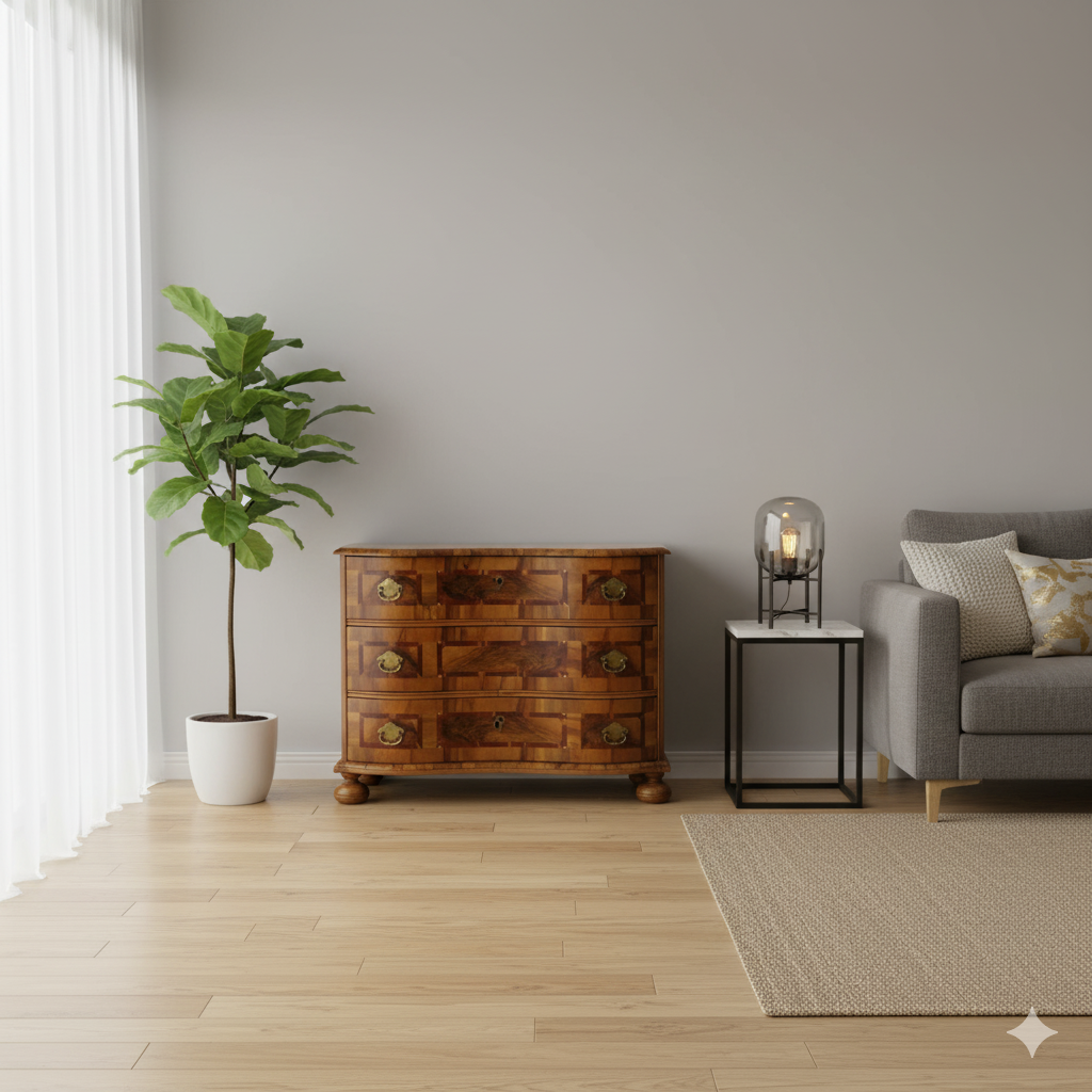 Restaurierte Barock Kommode in Nussbaum mit Intarsien furniert von ca. 1770. Die mit seitlichen Schloss ausgestattete Kommode befindet sich in einem sehr guten Zustand und weist nur leichte Gebrauchsspuren auf. Sie ist etwas wurmstichig was aber inzwischen entsprechend behandelt wurde.
