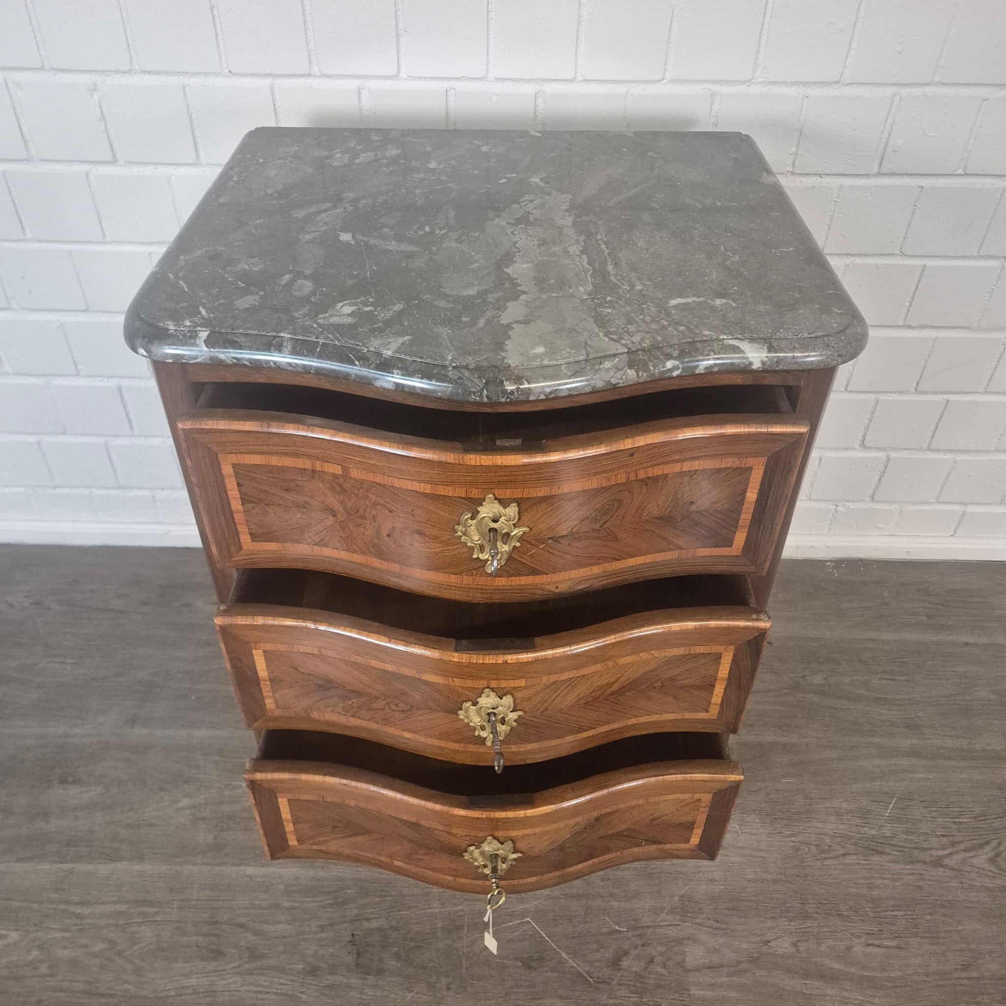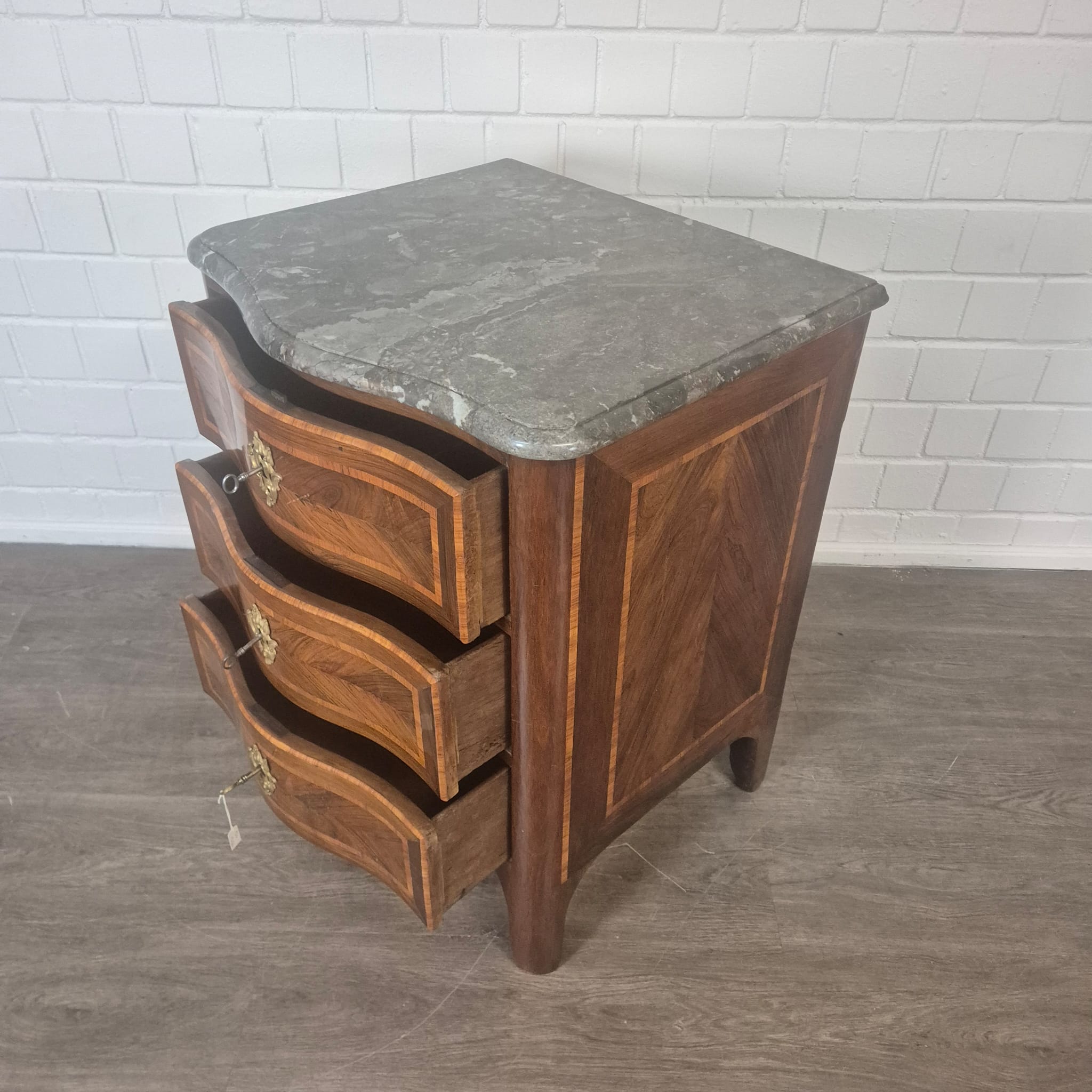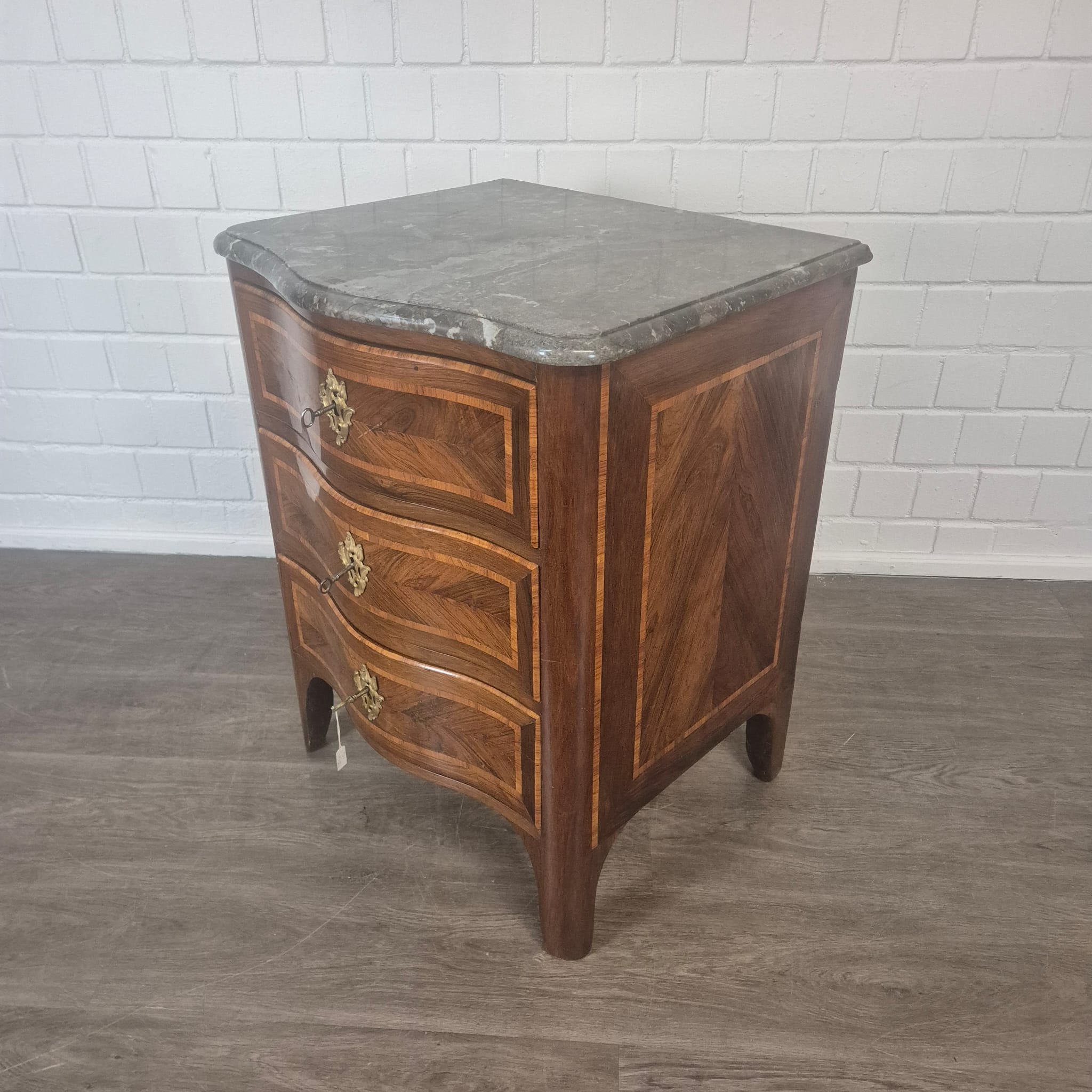 Restaurierte Barock Kommode in Nussbaum furniert und lackiert von ca. 1780. Die Kommode befindet sich in einem guten Zustand und weist nur geringe Gebrauchsspuren auf.