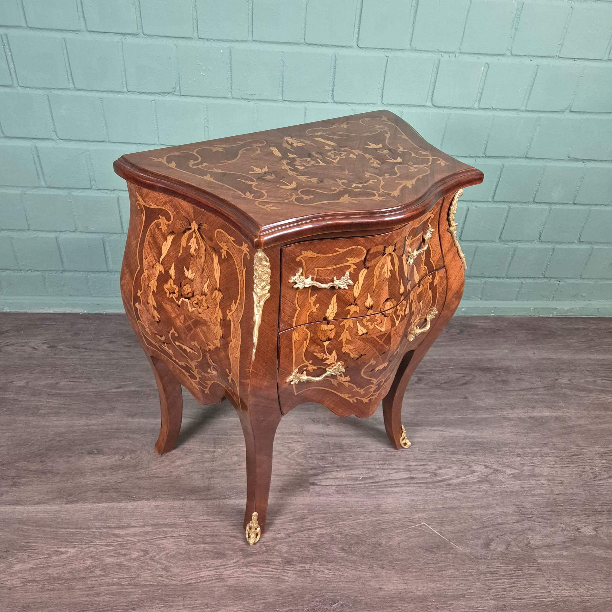 Intarsienarbeit: Aufwändig gearbeitete florale Intarsien aus verschiedenen Edelholzarten, kunstvoll auf Front, Seiten und Deckplatte arrangiert
