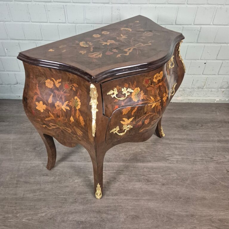 🔸 Intarsienarbeit: Aufwändig gearbeitete florale Intarsien aus verschiedenen Edelholzarten, kunstvoll auf Front, Seiten und Deckplatte arrangiert