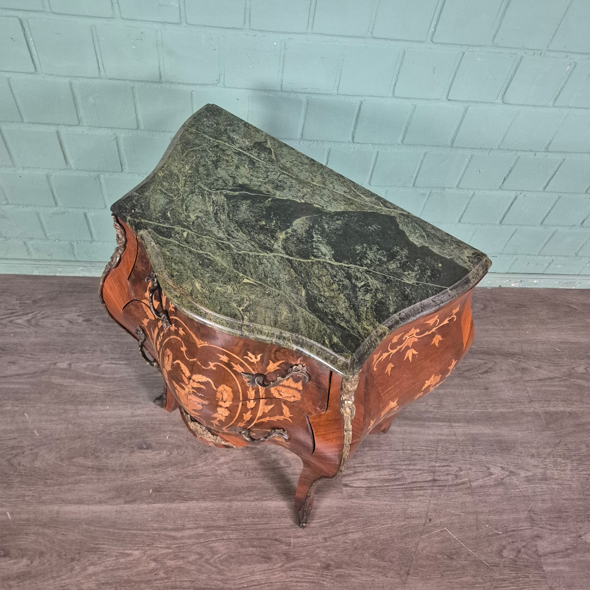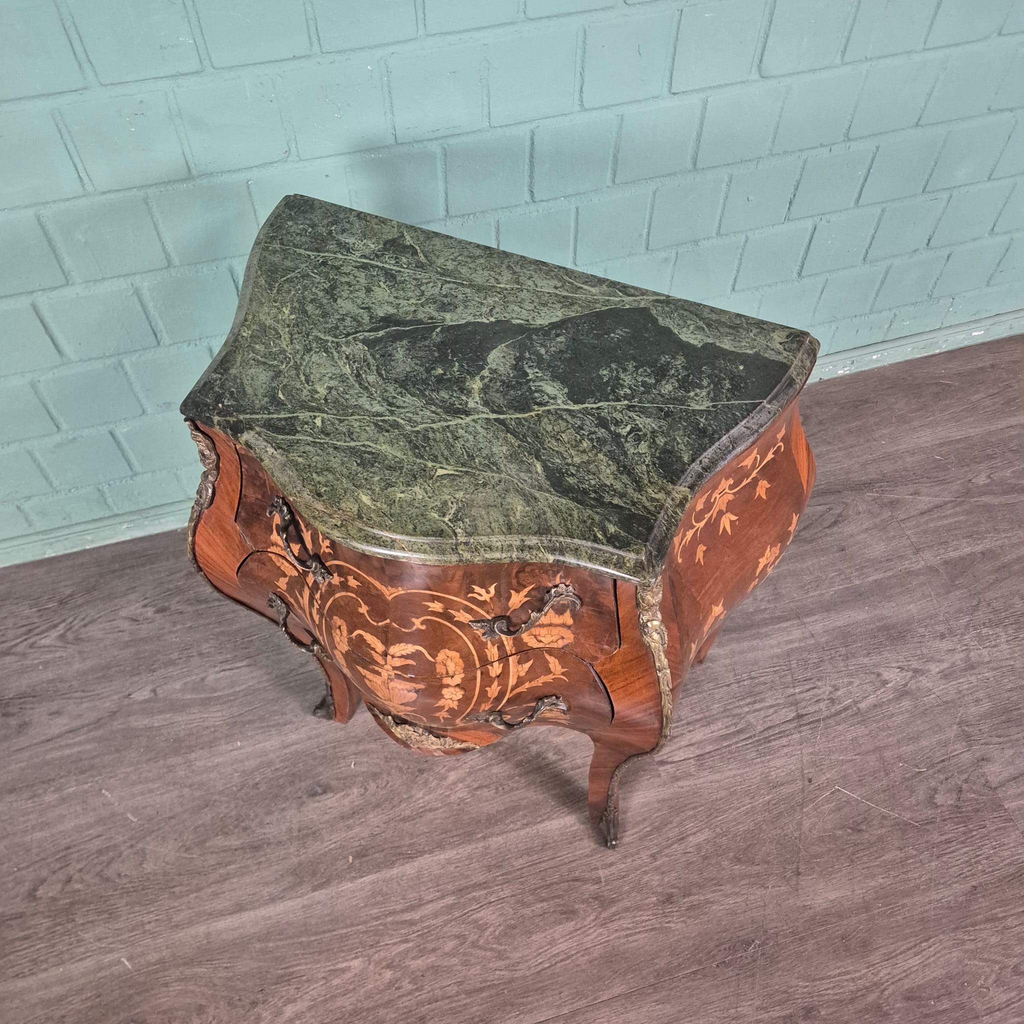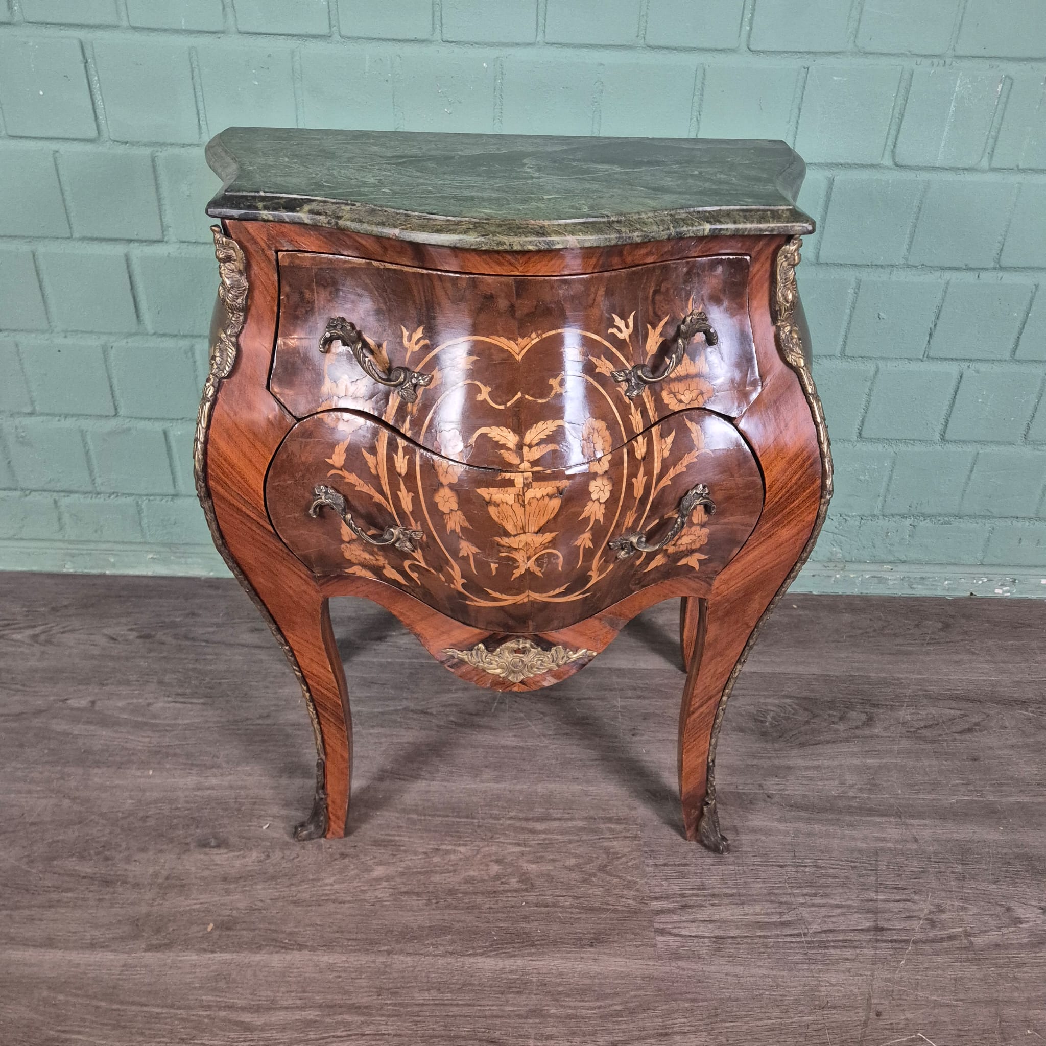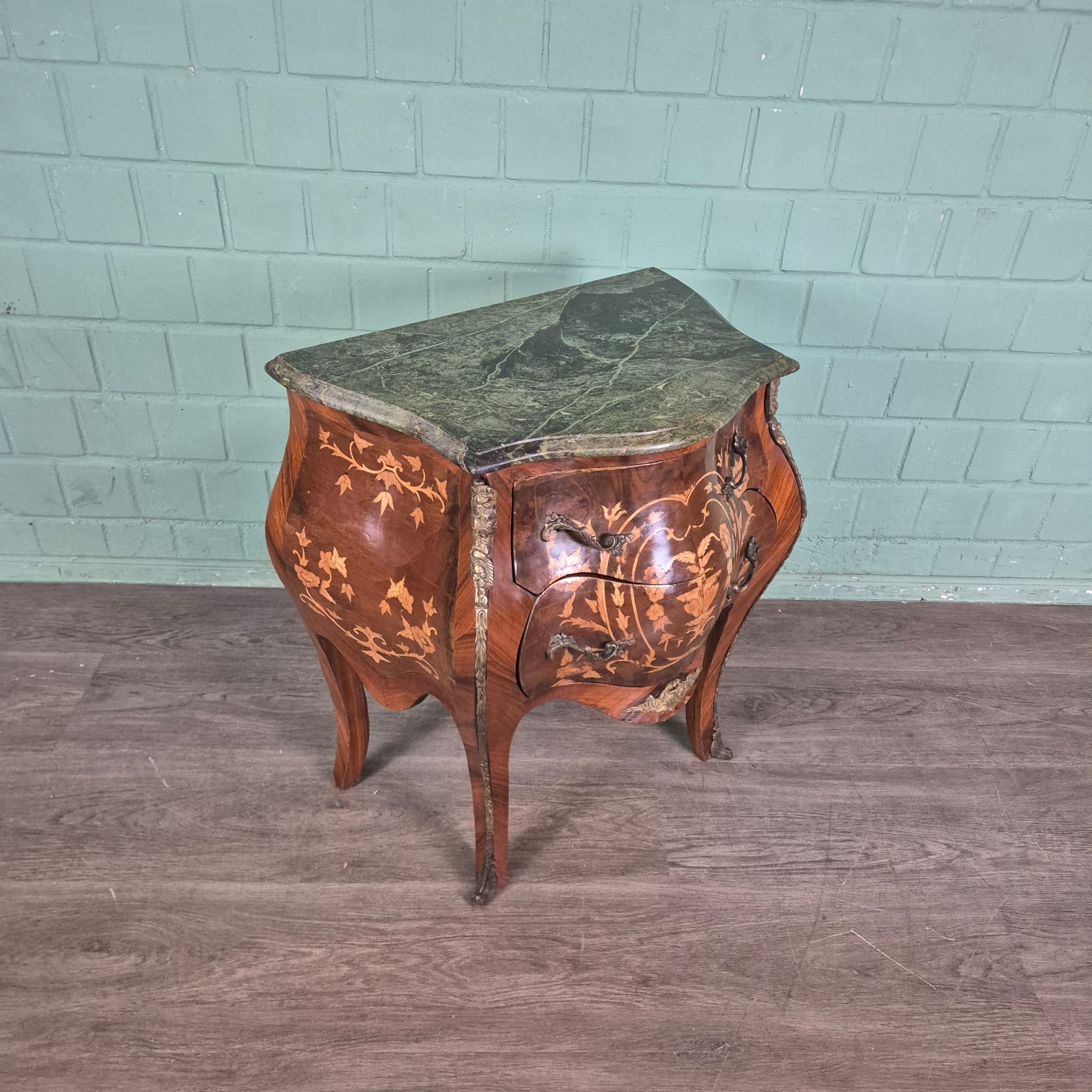 Stilvoller Nachbau einer Barockkommode in Nussbaum furniert, mit Intarsien und grüner Marmorplatte versehen. Ausstellungsstück zum Sonderpreis.