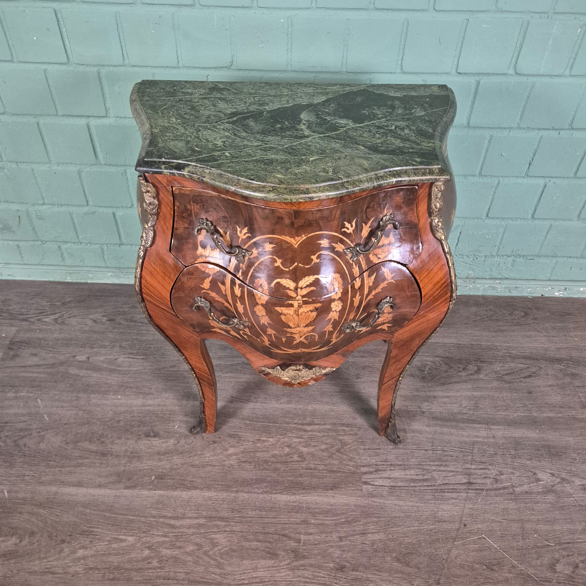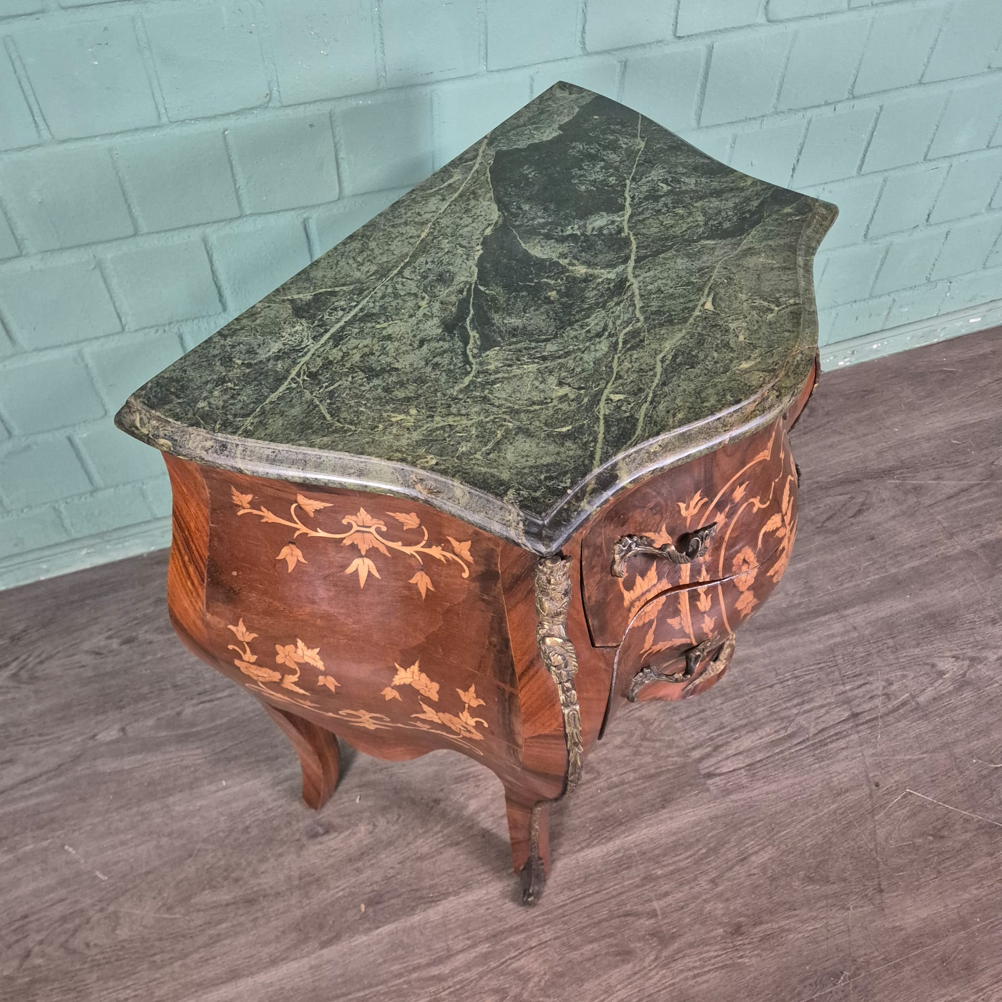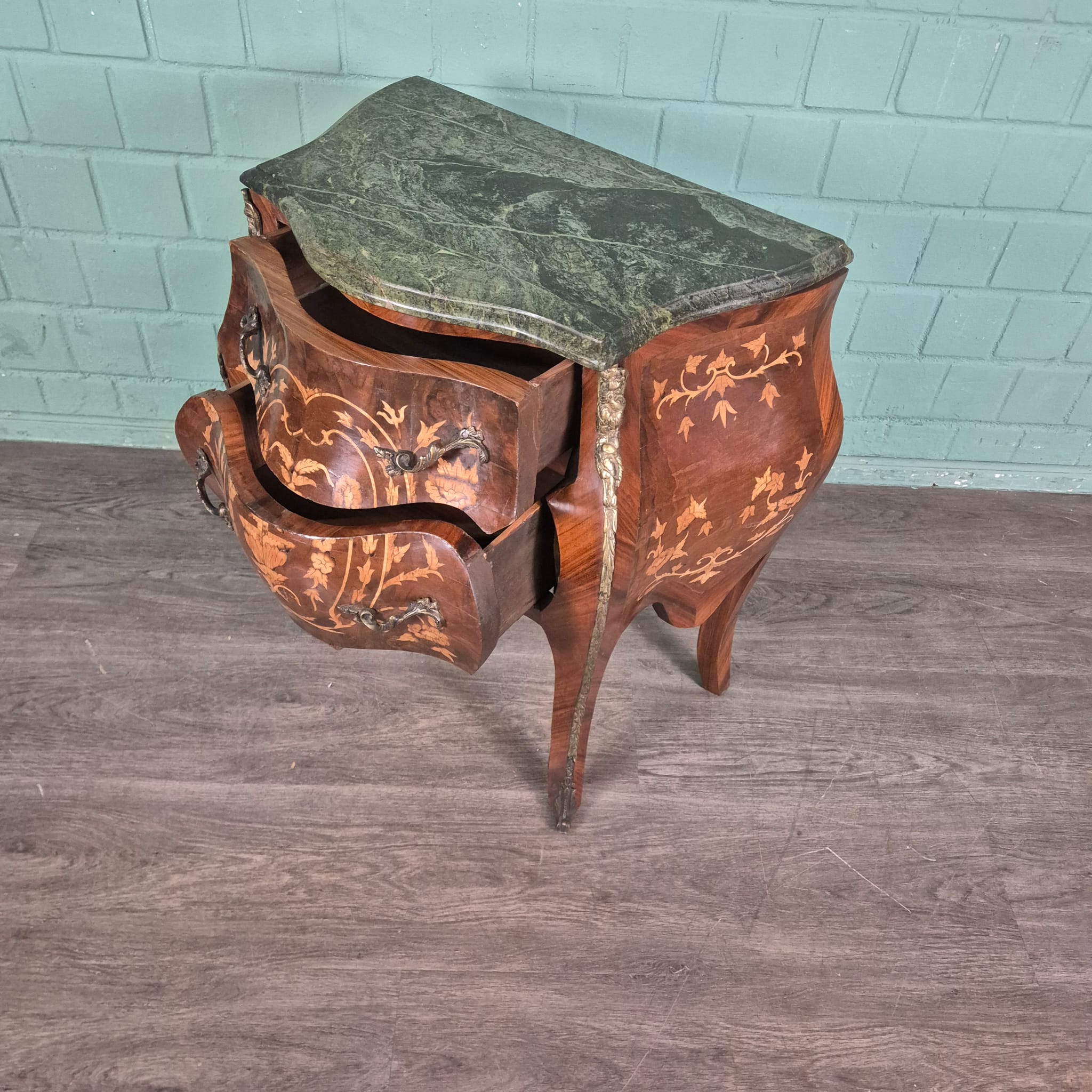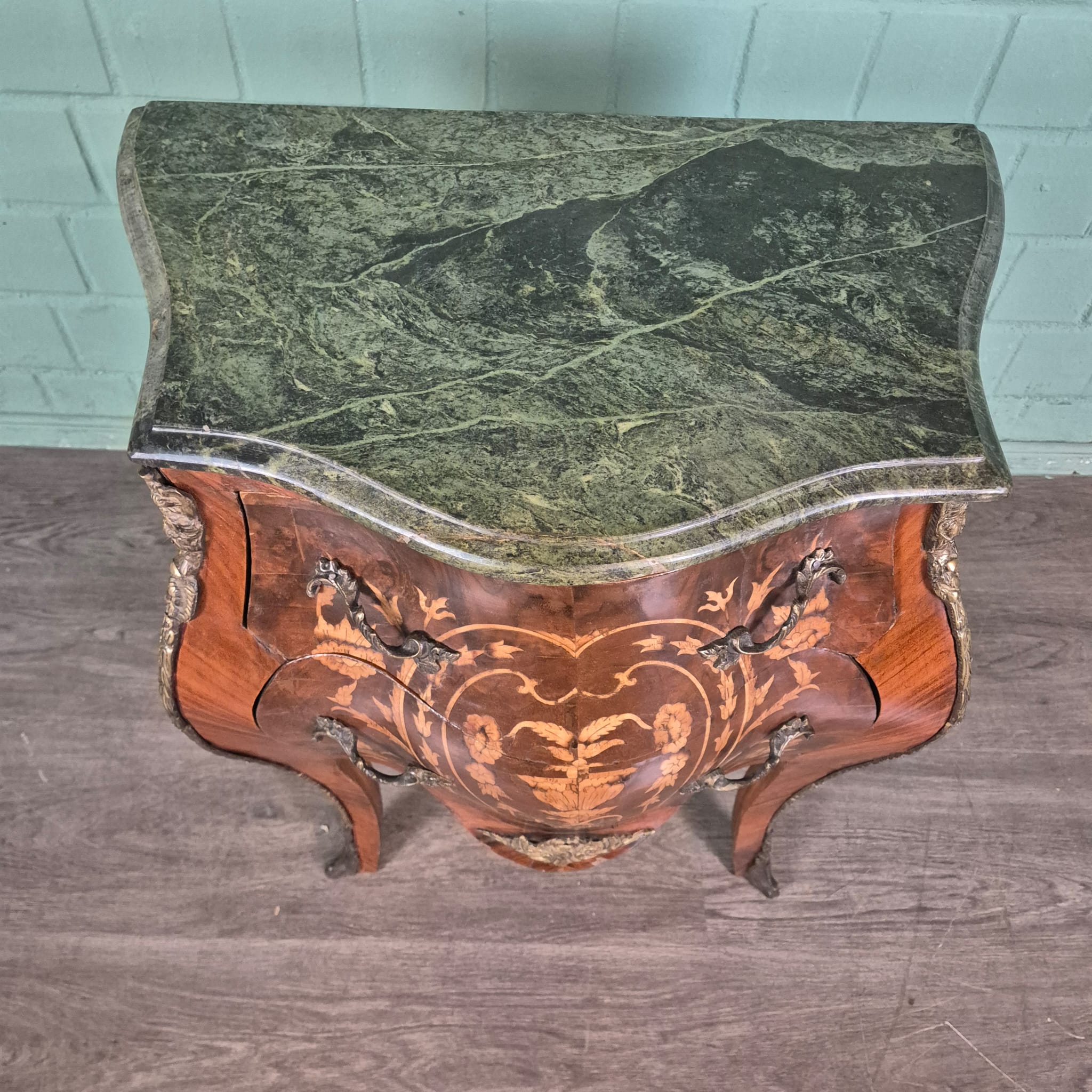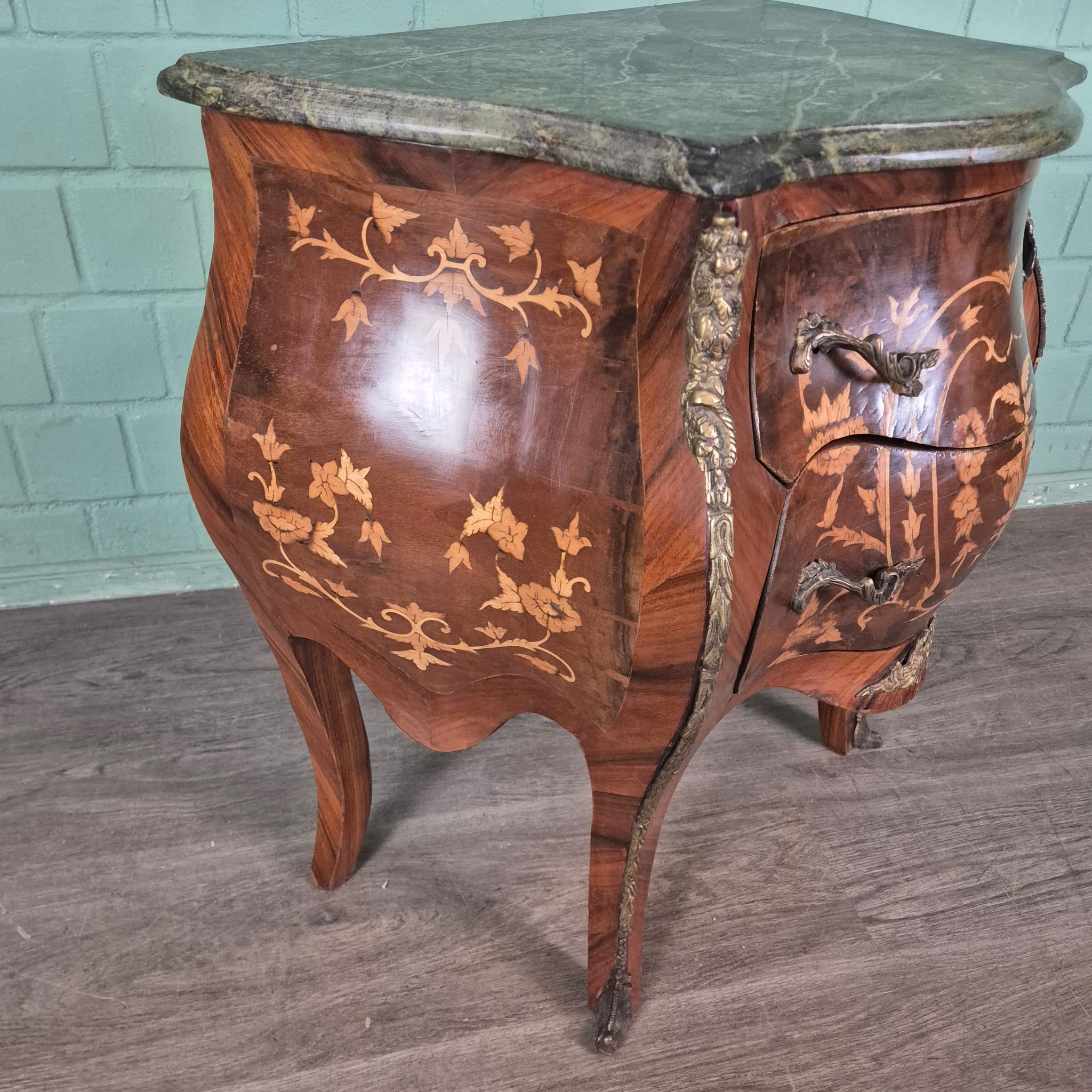 Stilvoller Nachbau einer Barockkommode in Nussbaum furniert, mit Intarsien und grüner Marmorplatte versehen. Ausstellungsstück zum Sonderpreis.