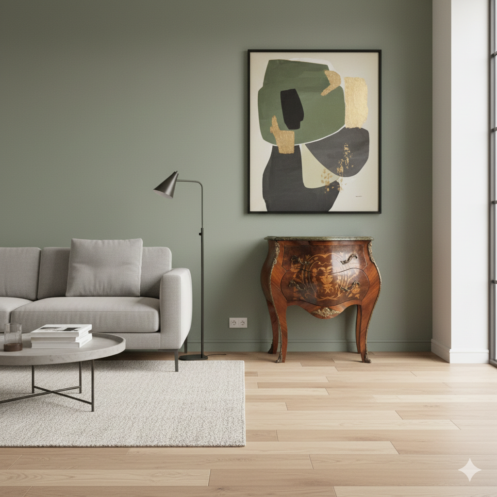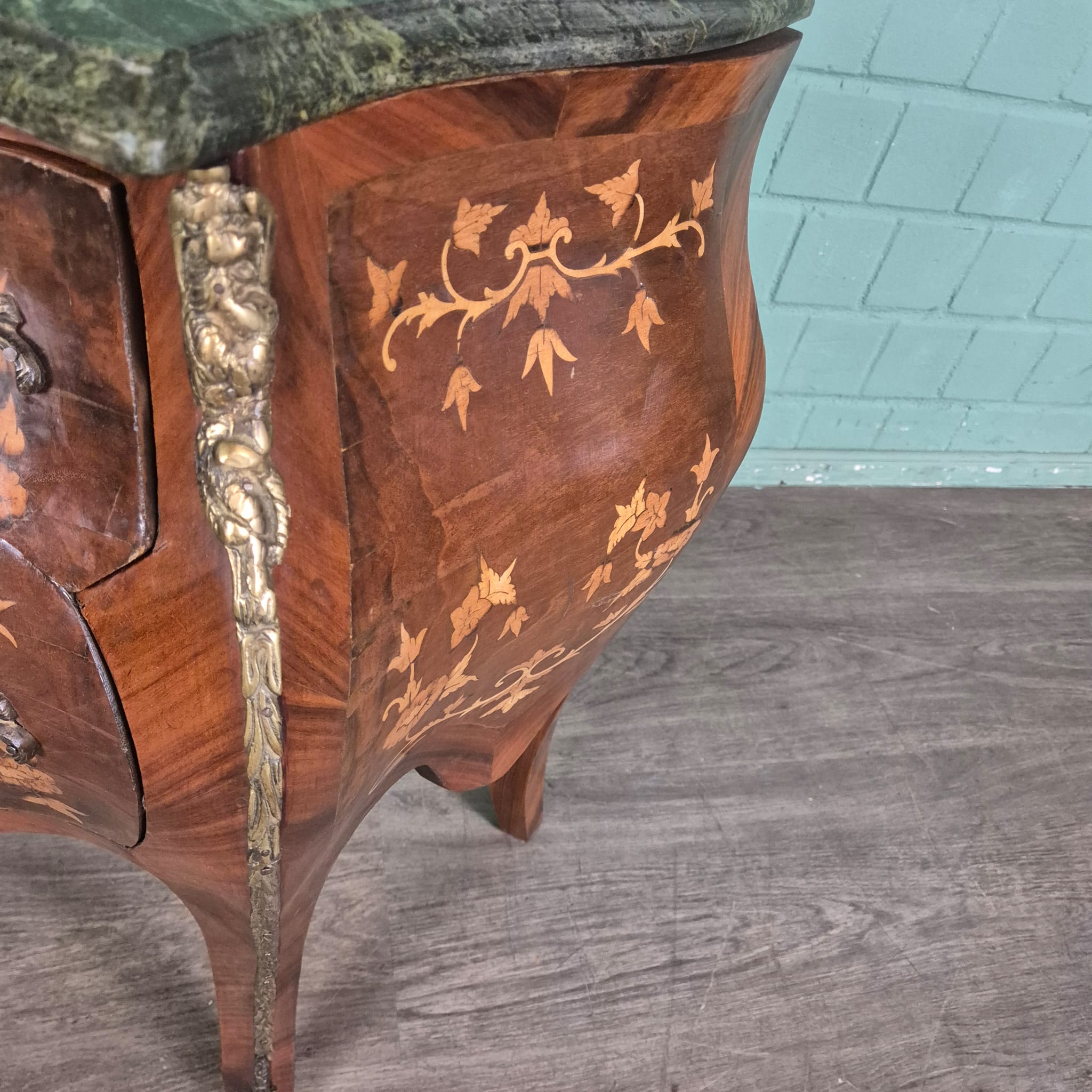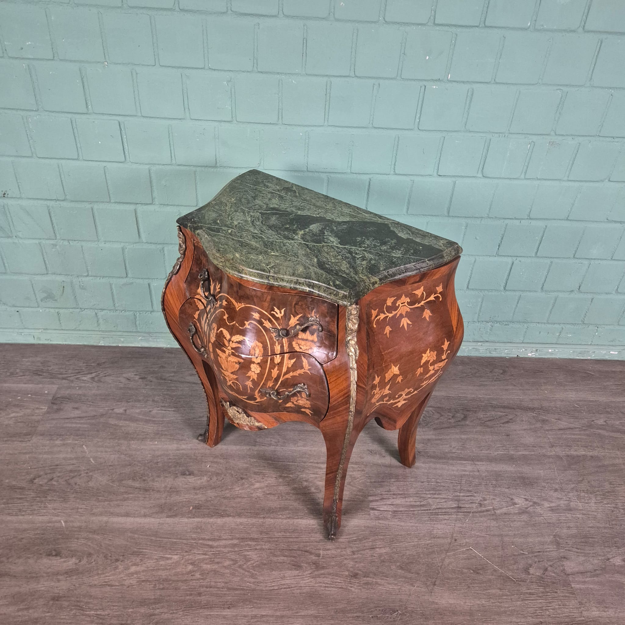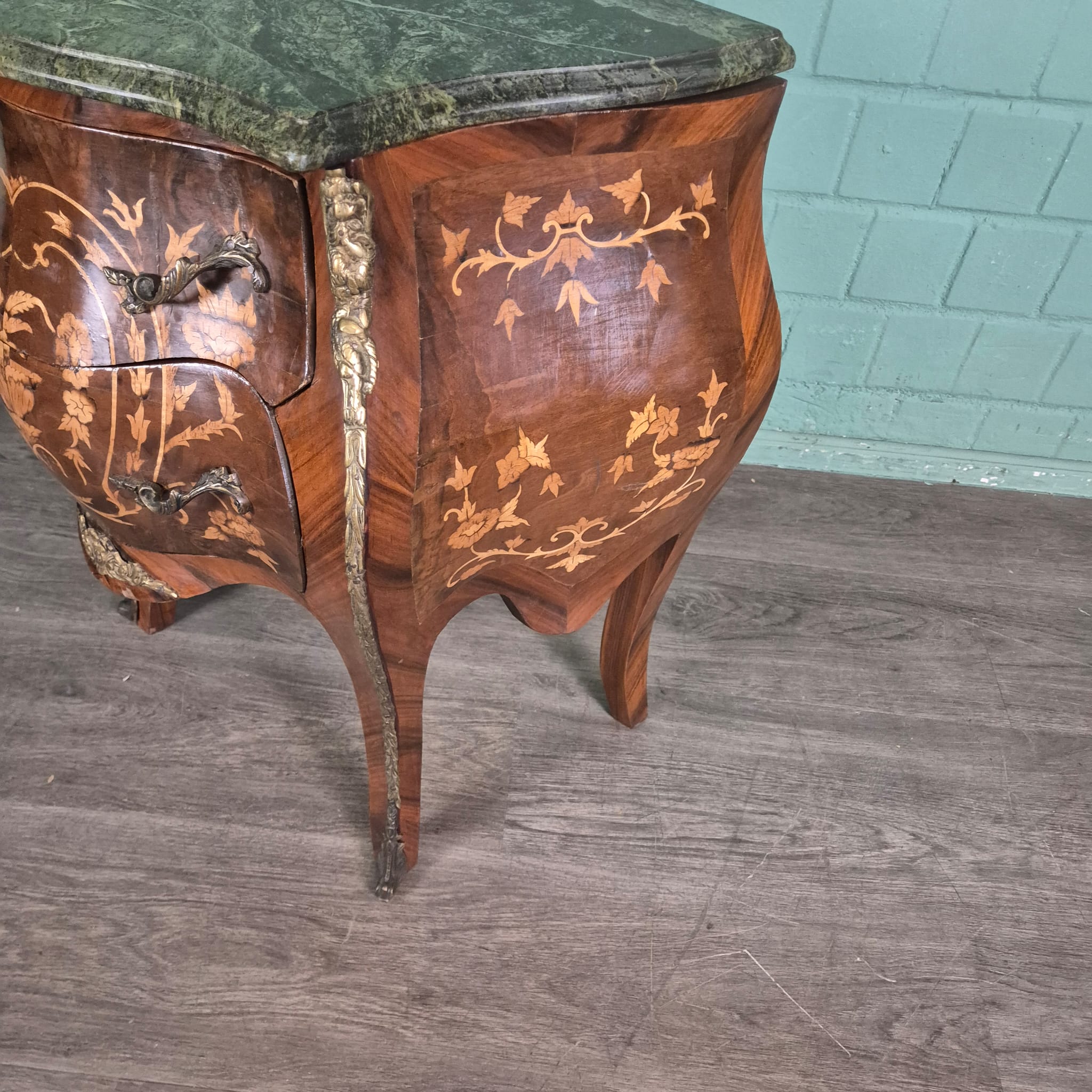 Stilvoller Nachbau einer Barockkommode in Nussbaum furniert, mit Intarsien und grüner Marmorplatte versehen. Ausstellungsstück zum Sonderpreis.