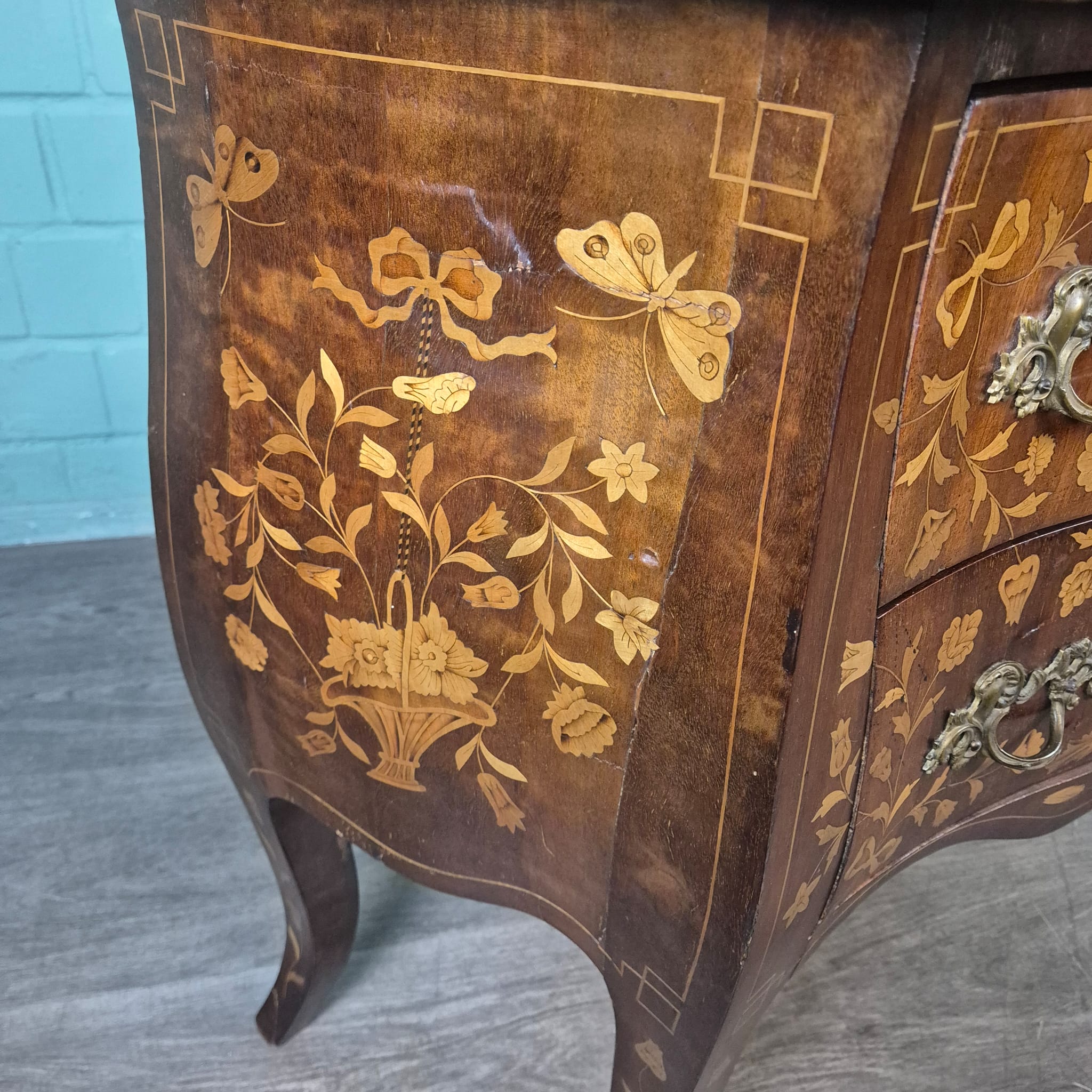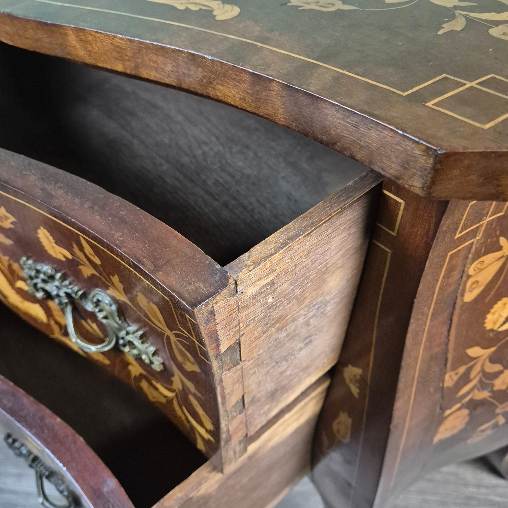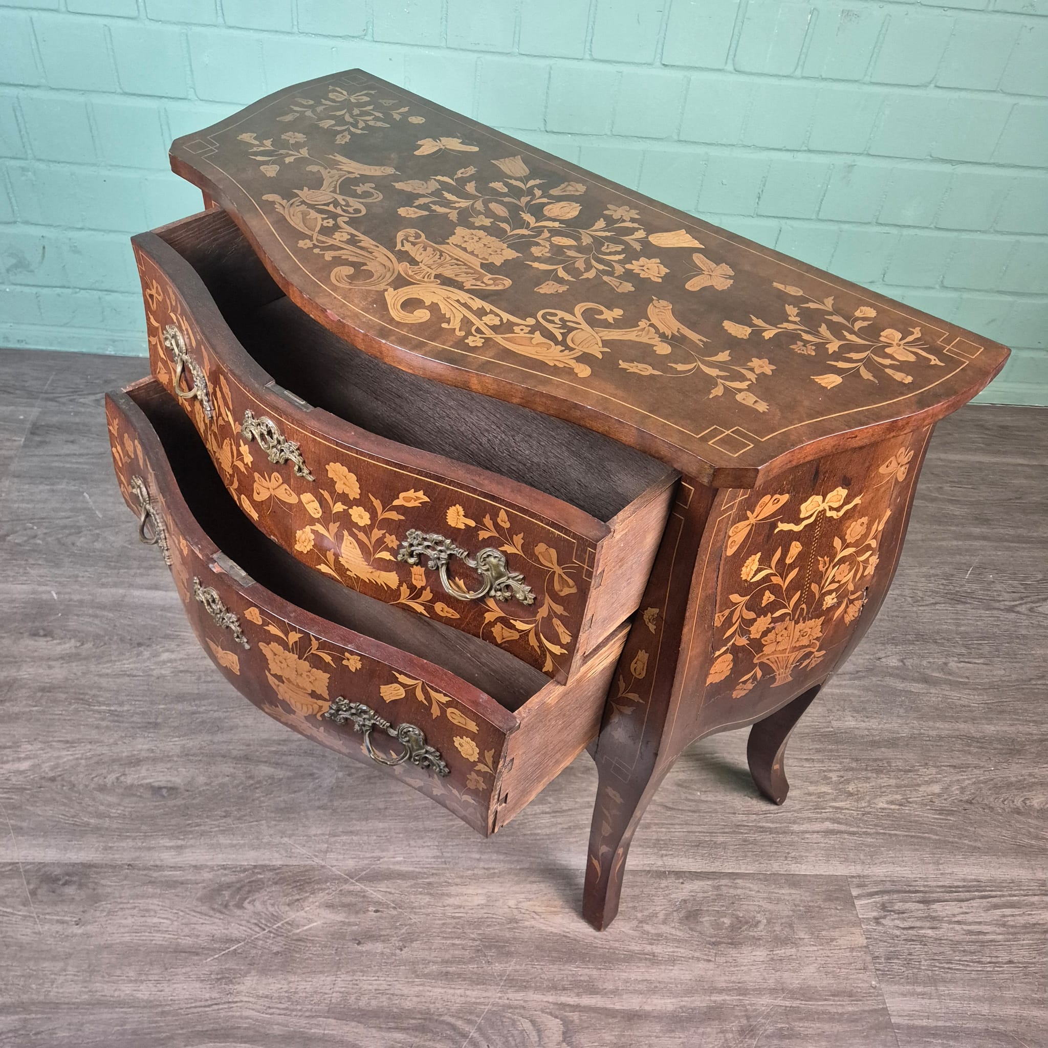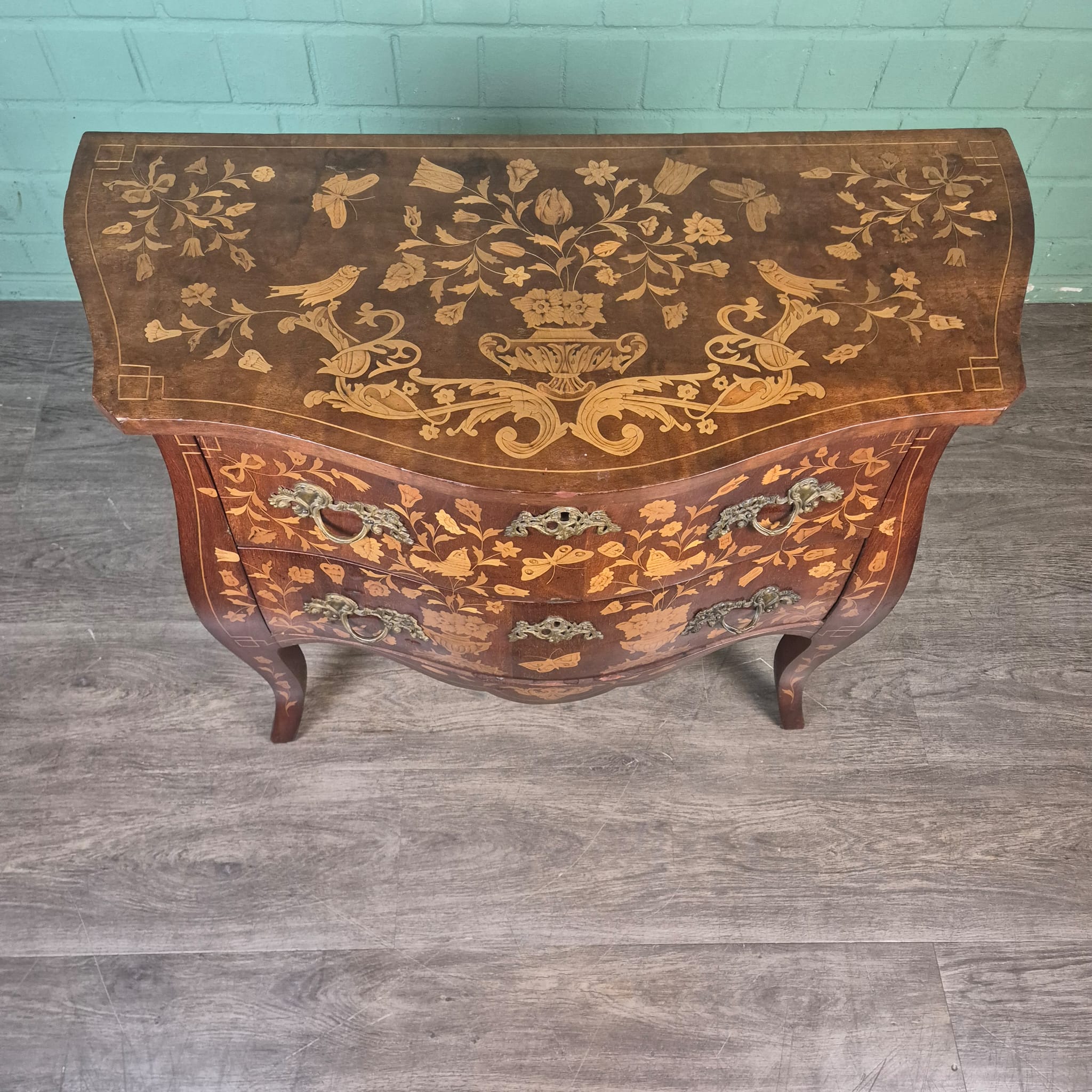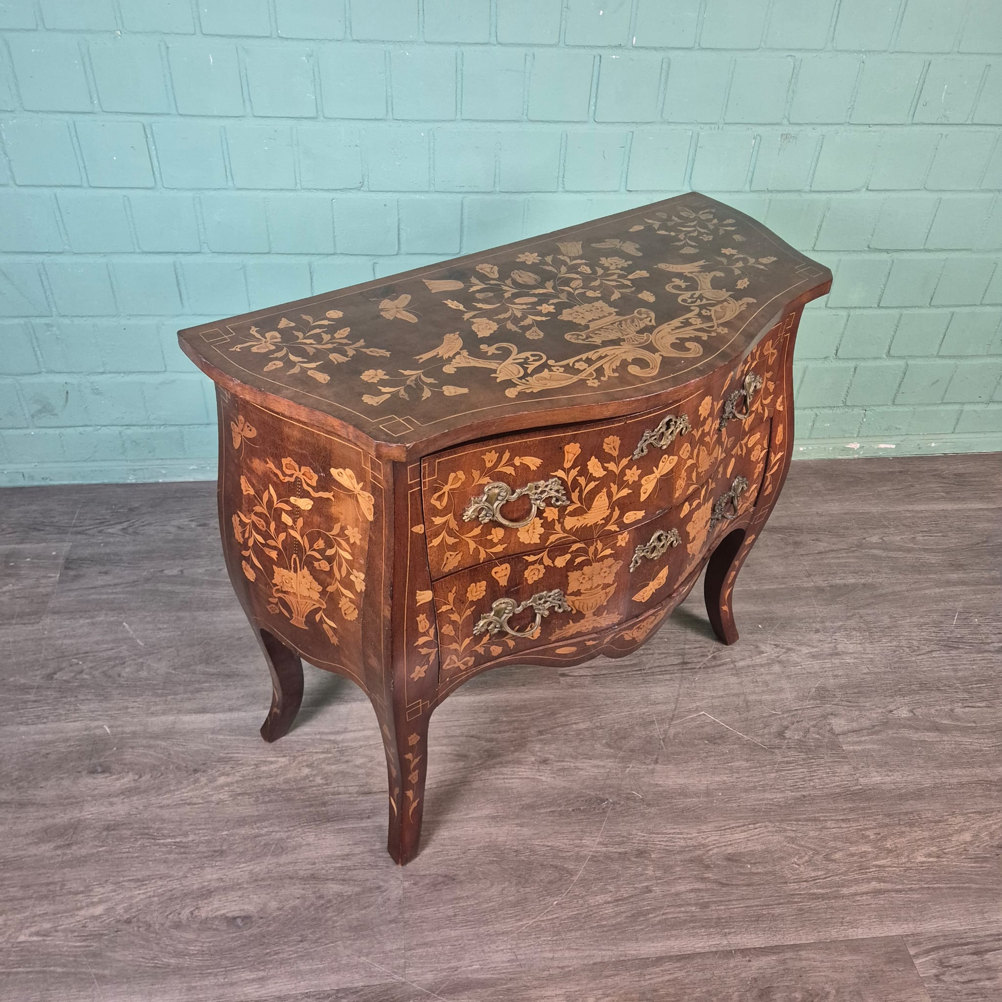 Hochwertige Barock-Stil Kommode von ca. 1880 in Nussbaum und verschiedenen Edelhölzern furniert. Der mit Marqueterie versehene Schrank befindet sich in einem guten Zustand und weist nur leichte Gebrauchsspuren auf.