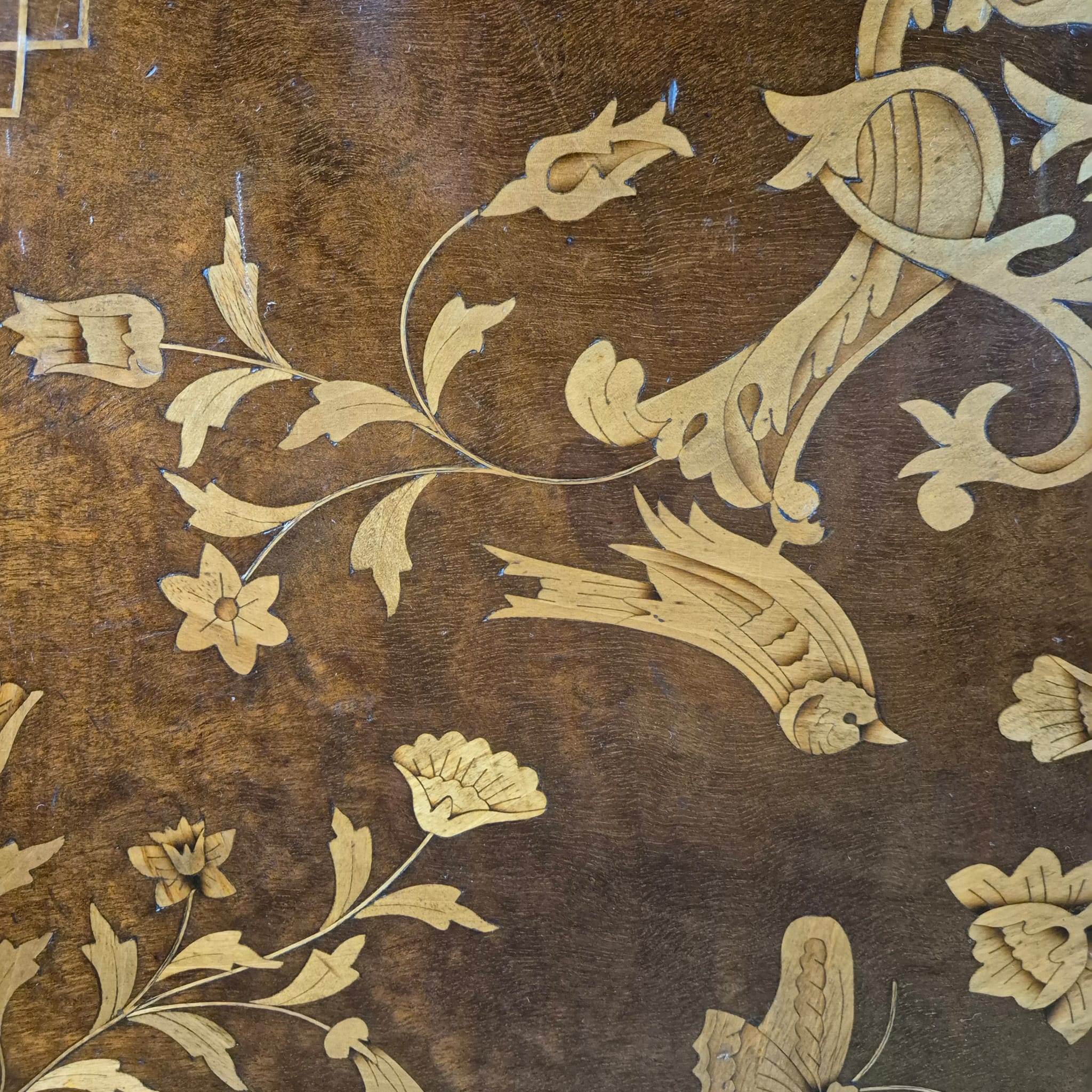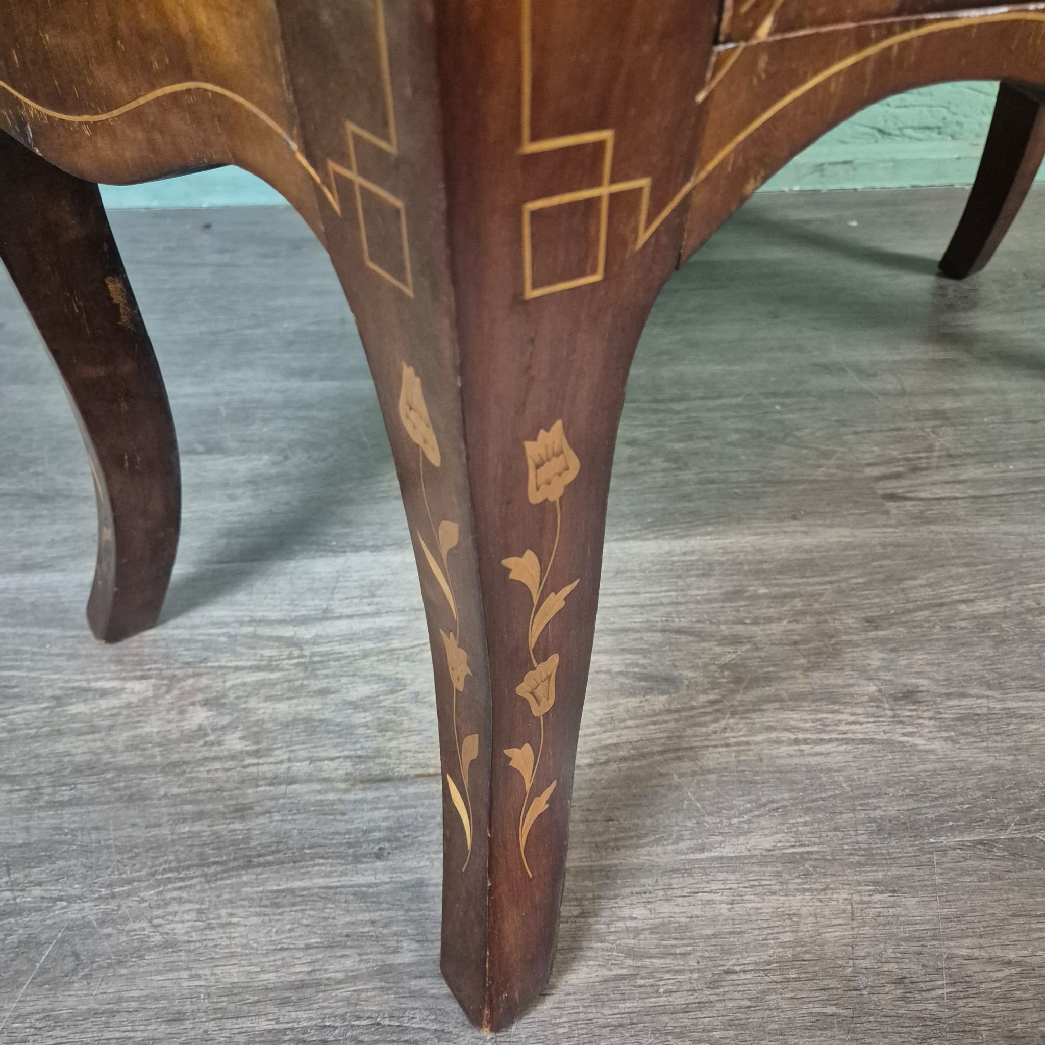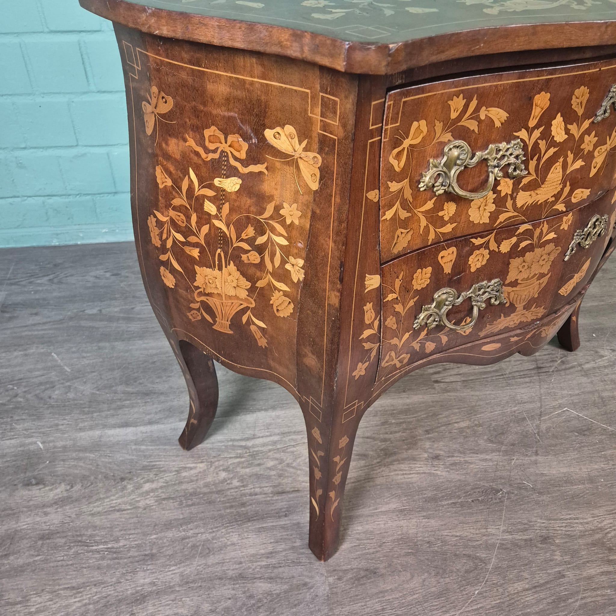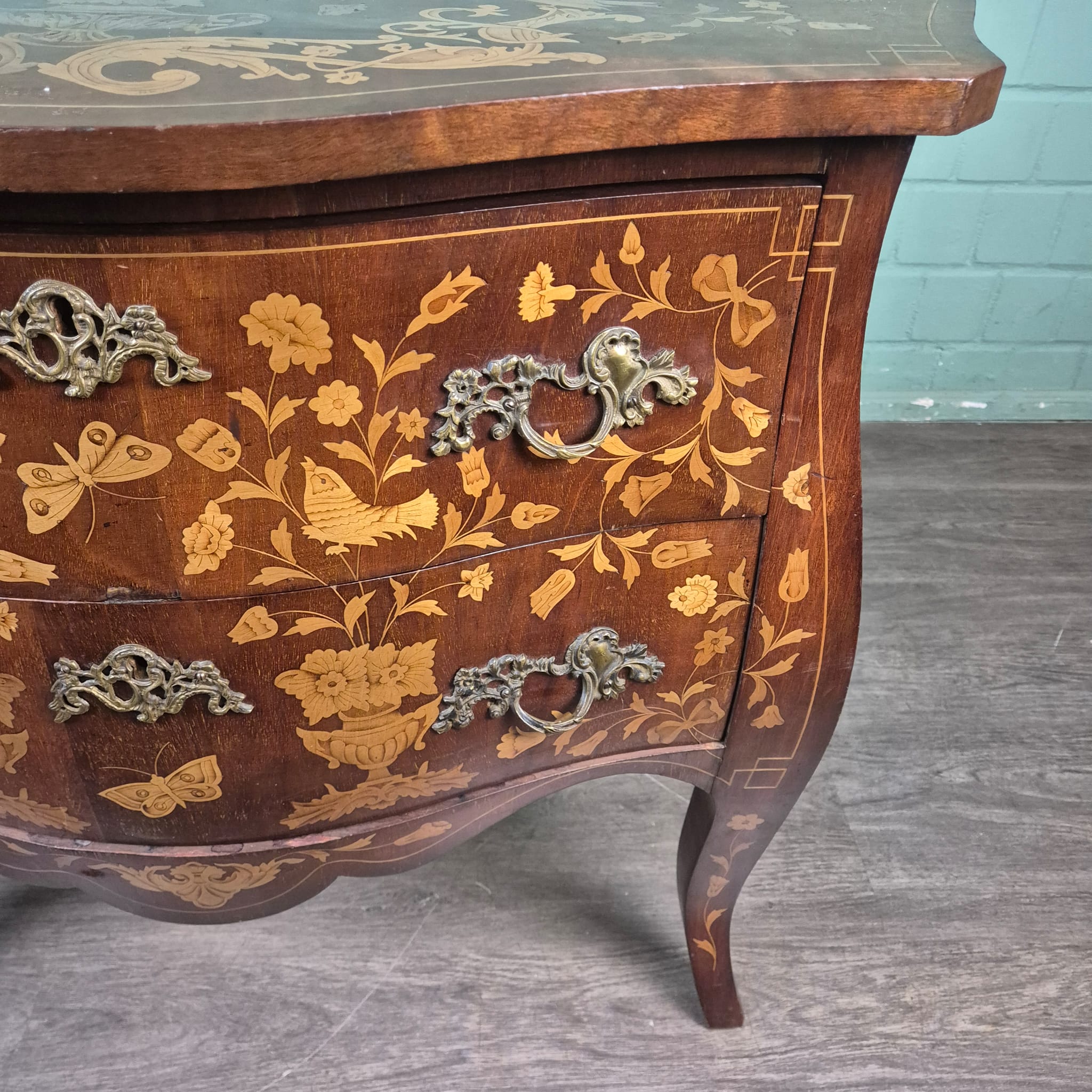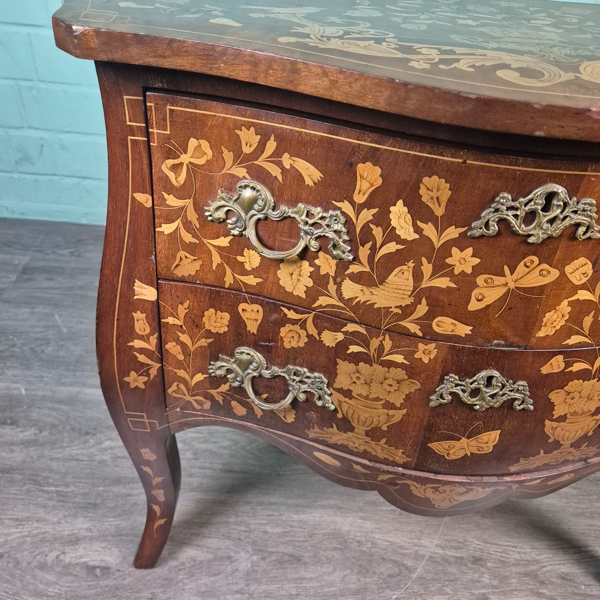 Hochwertige Barock-Stil Kommode von ca. 1880 in Nussbaum und verschiedenen Edelhölzern furniert. Der mit Marqueterie versehene Schrank befindet sich in einem guten Zustand und weist nur leichte Gebrauchsspuren auf.