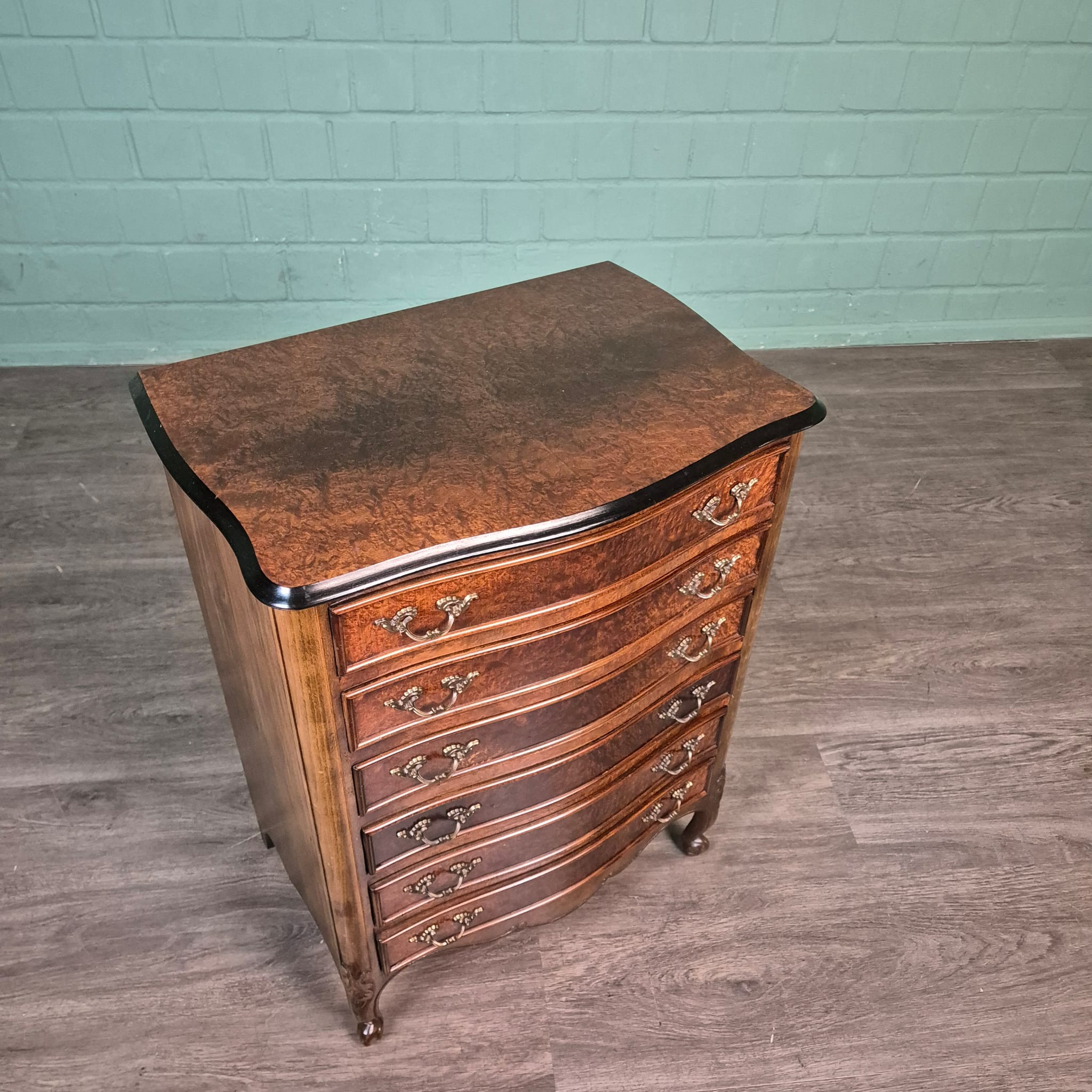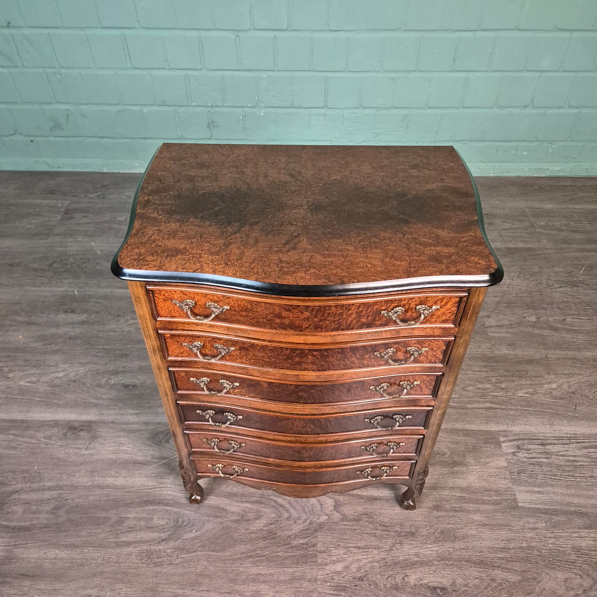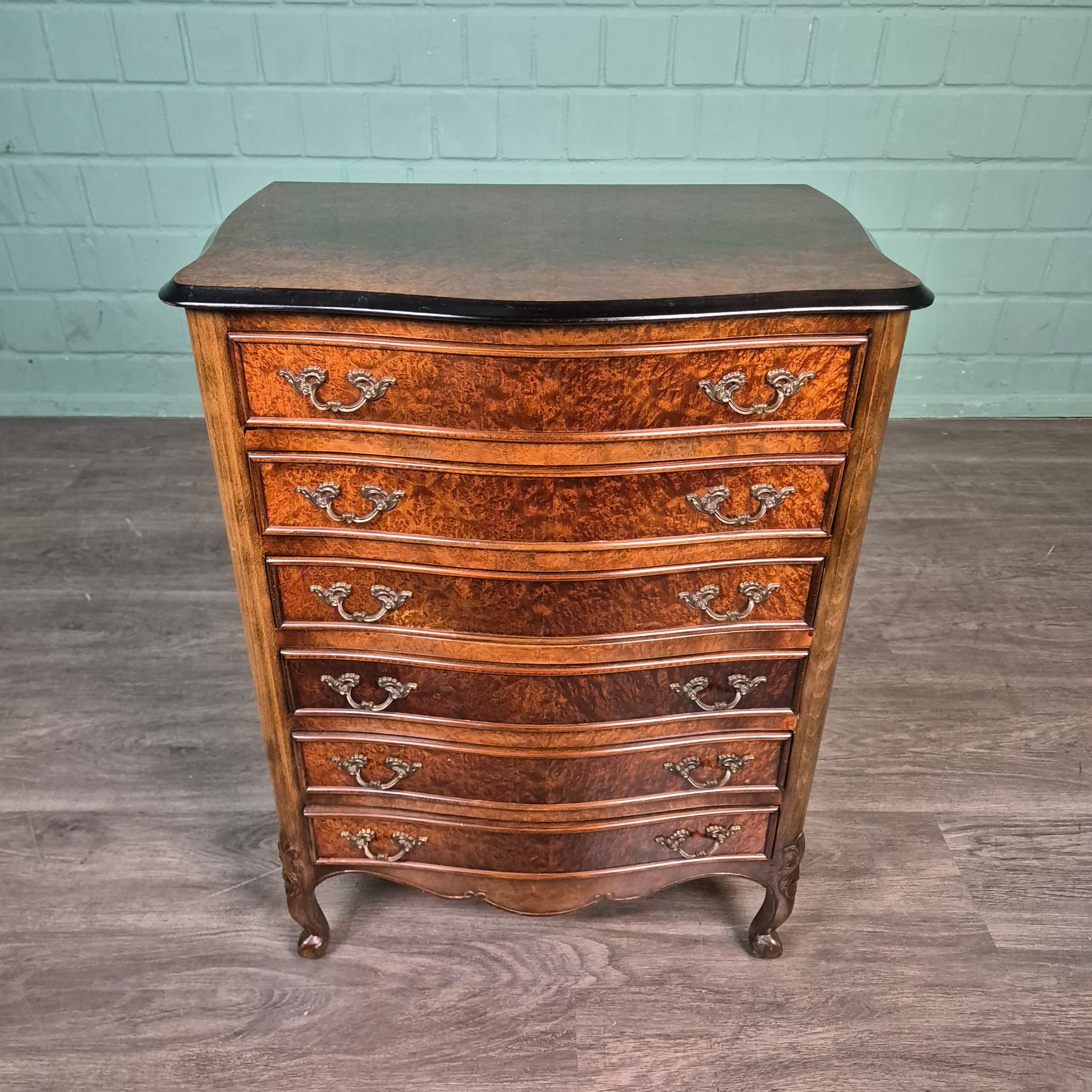 Hochwertige Neubarock Kommode in Nussbaum furniert und lackiert von ca. 1960. Der Schrank befindet sich in einem sehr guten Zustand und weist nur minimale Gebrauchsspuren auf.