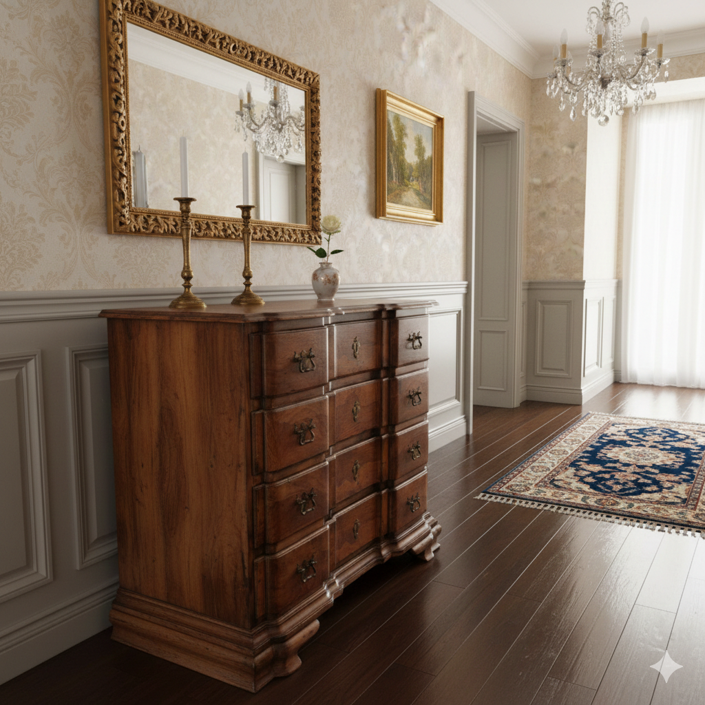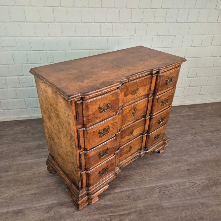 Hochwertige Neubarock Kommode in Nussbaum furniert. Der ca. 75 Jahre alte Schrank befindet sich in einem sehr guten Zustand und weist nur minimale Gebrauchsspuren auf.