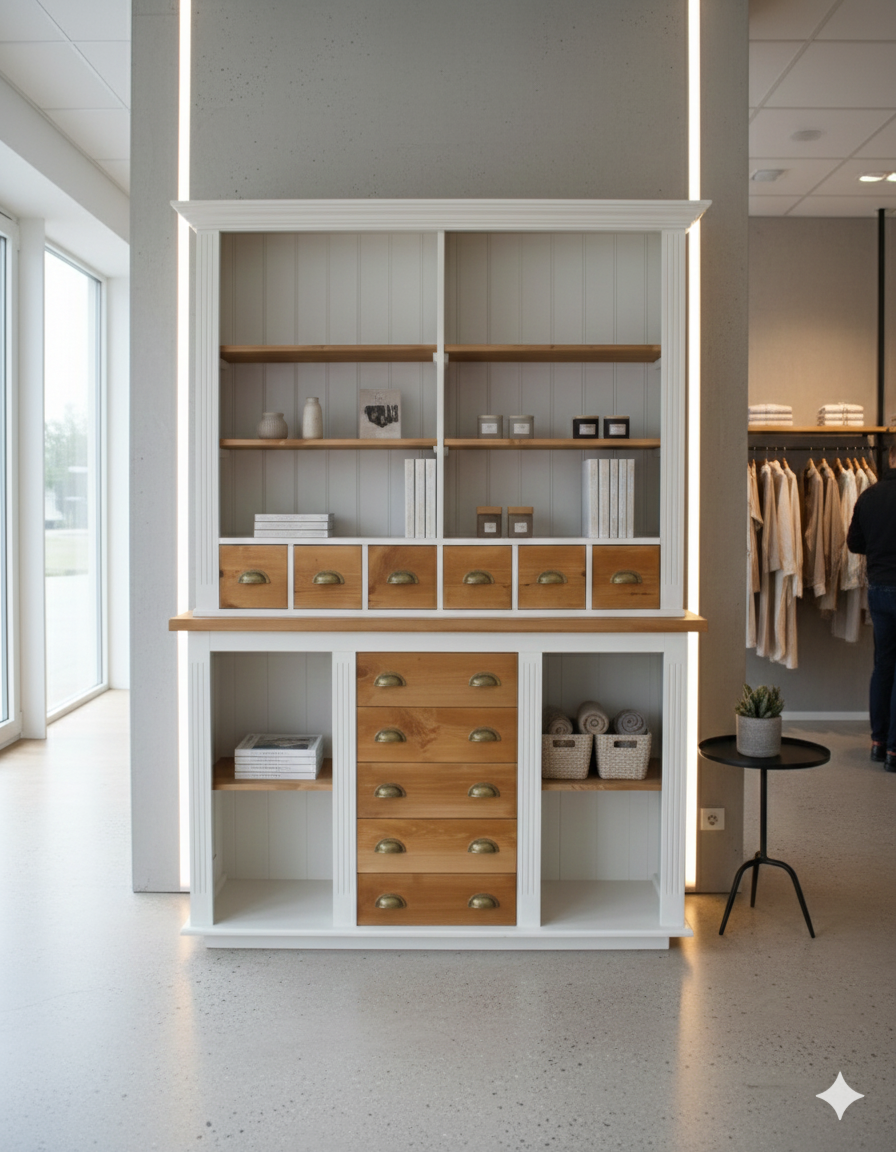 Der Ladenschrank Modell Ines aus Massivholz besticht durch seine stilvolle Eleganz und der aufwendigen Verarbeitung. Die Kombination von nostalgischer Optik und moderner Funktionalität ist für alle Ladeneinrichtungen sowie vielen weiteren Einsatzgebieten geeignet. Der Schrank wird komplett fertig montiert geliefert und ist somit sofort einsatzbereit.