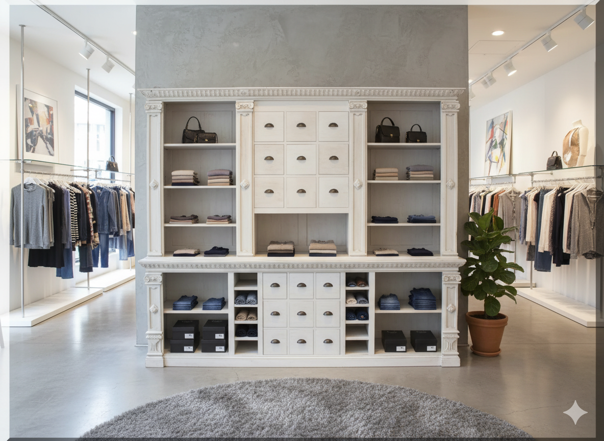 Dieser Schrank aus Massivholz besticht durch seine stilvolle Eleganz und der aufwendigen Verarbeitung. Die Kombination von nostalgischer Optik und moderner Funktionalität ist für alle Ladeneinrichtungen sowie vielen weiteren Einsatzgebieten geeignet. Der Schrank wird komplett fertig montiert geliefert und ist somit sofort einsatzbereit.