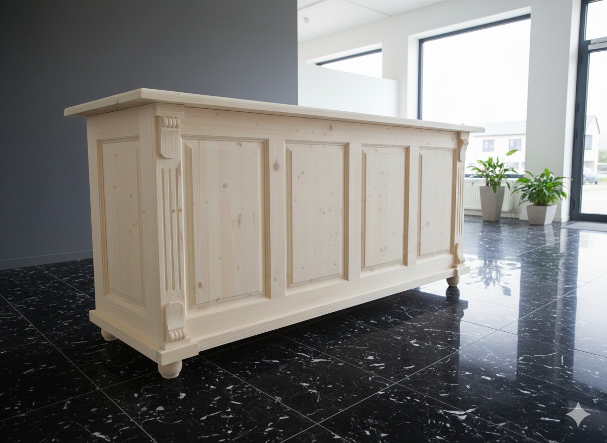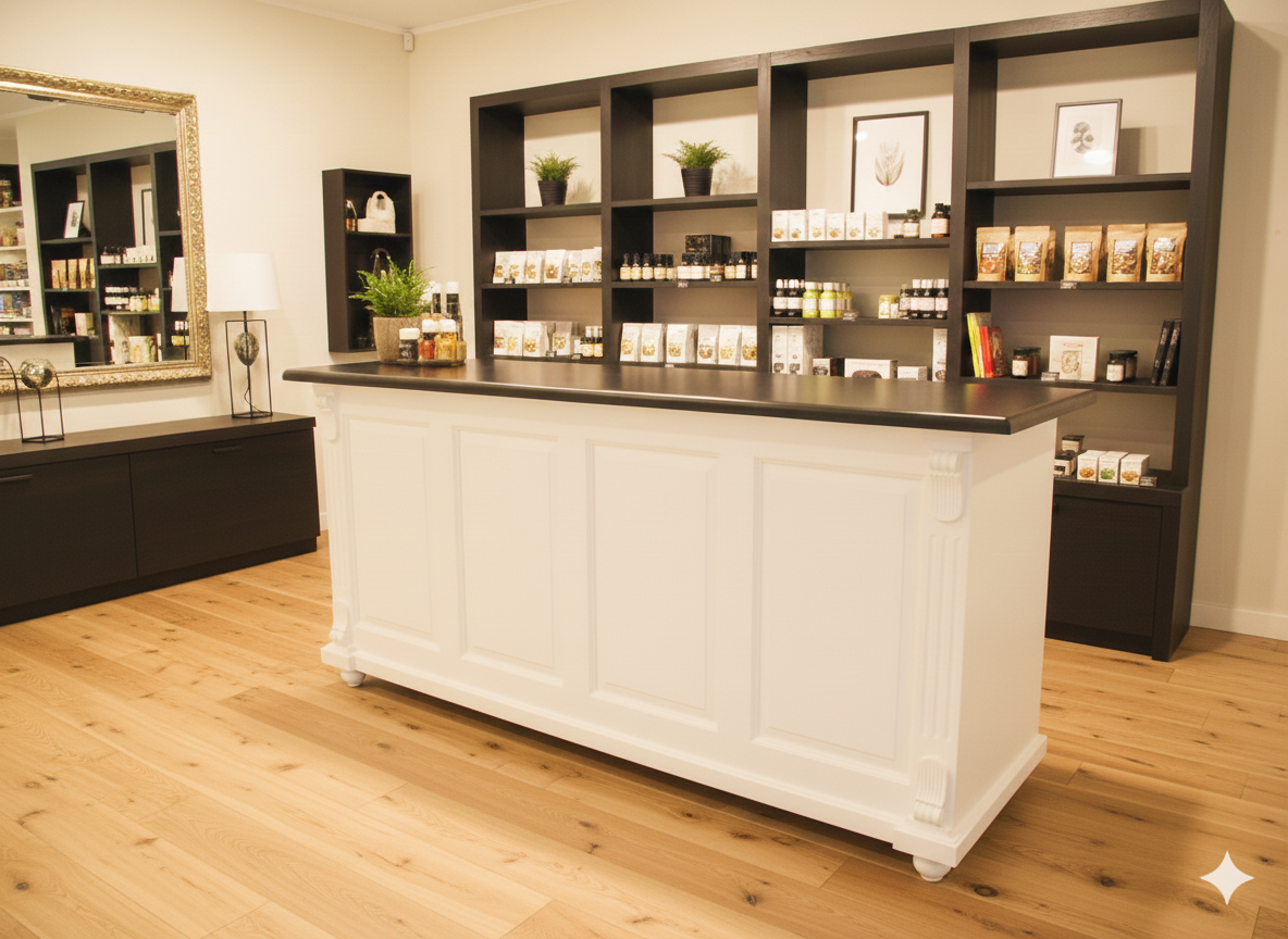 Der Verkaufstresen Modell Anne aus Massivholz besticht durch seine stilvolle Eleganz und der aufwendigen Verarbeitung. Die Kombination von nostalgischer Optik und moderner Funktionalität ist für alle Ladeneinrichtungen sowie vielen weiteren Einsatzgebieten geeignet. Der Tresen wird komplett fertig montiert geliefert und ist somit sofort einsatzbereit.