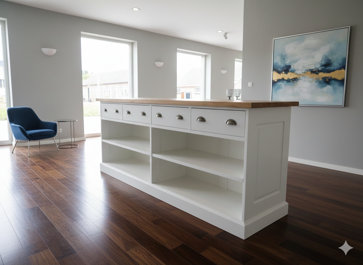 • Farbton: Arbeitsplatte, Regalboden und Schubläden in 2-Komp. Klarlack versiegelt, Korpus RAL 9010 / Reinweiß
