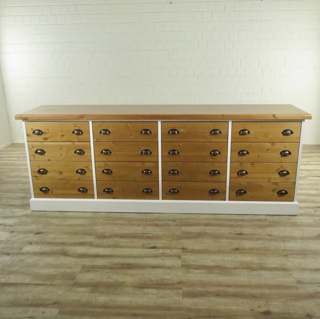 • Farbton: Arbeitsplatte und Schubladen Kiefer gebeizt und Klarlack versiegelt, Korpus 2K-Lack in RAL 9010 / Reinweiß