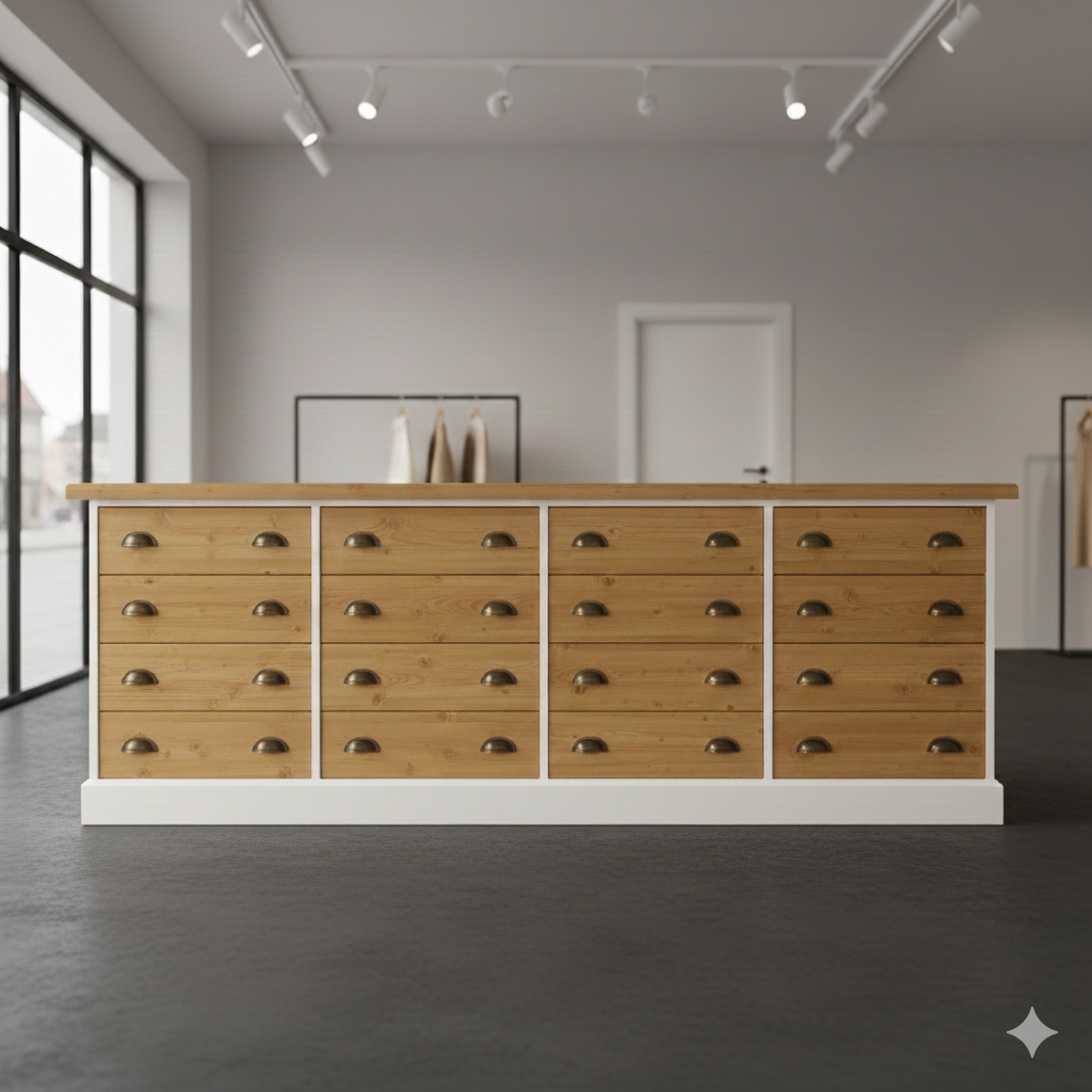 Der Verkaufstresen Modell Judith aus Massivholz besticht durch seine stilvolle Eleganz und der aufwendigen Verarbeitung. Die Kombination von nostalgischer Optik und moderner Funktionalität ist für alle Ladeneinrichtungen sowie vielen weiteren Einsatzgebieten geeignet. Der Tresen wird komplett fertig montiert geliefert und ist somit sofort einsatzbereit.