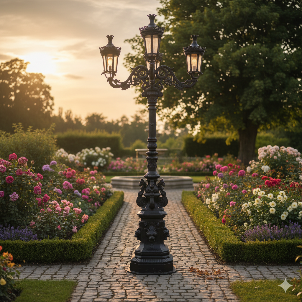 Hochwertige Laterne aus Gusseisen mit Lampenschirmen aus Glas. Zerlegbar (7-teilig).
